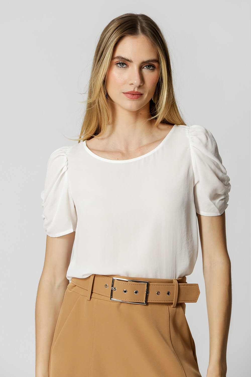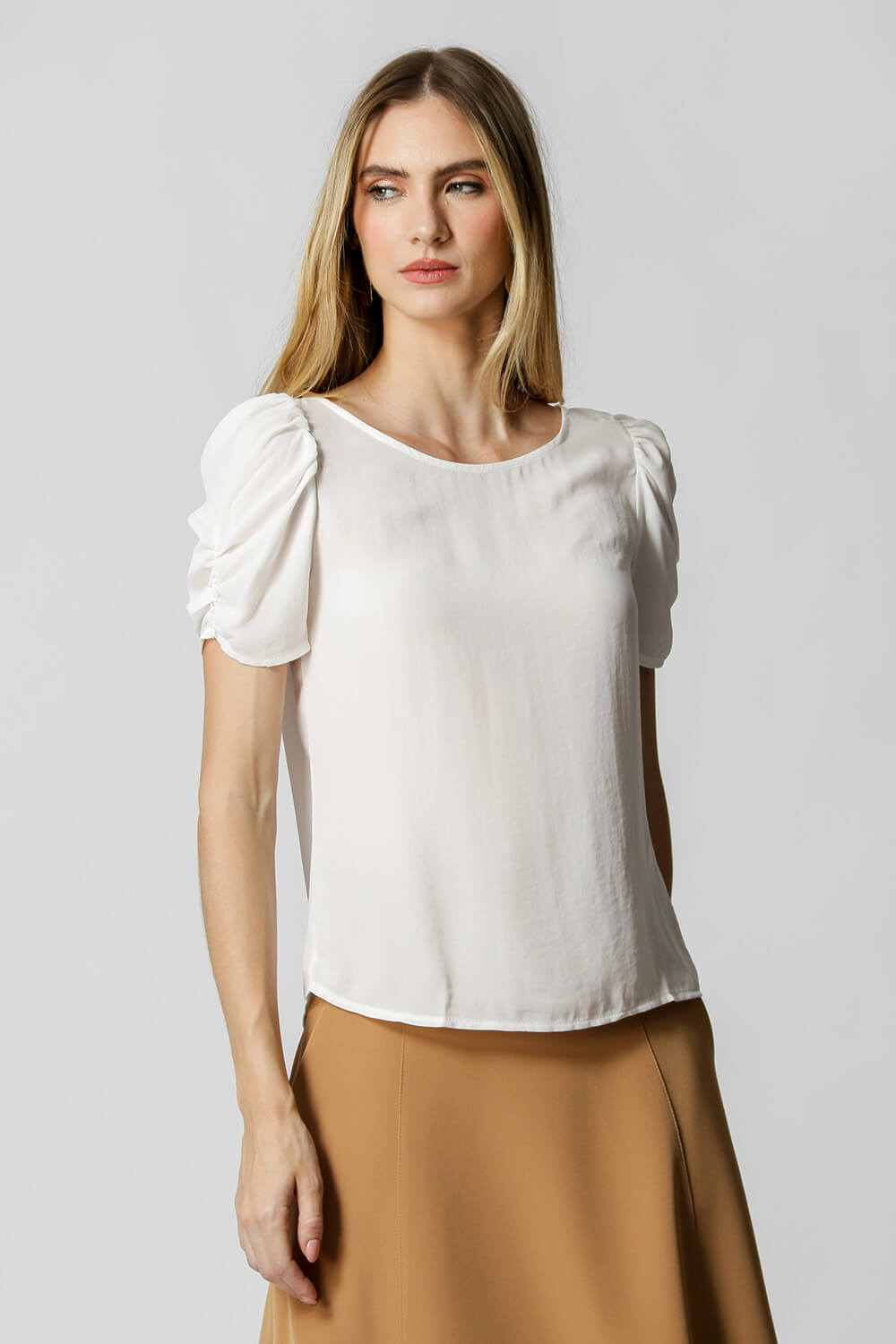 Blusa en tejido crepe de corte fluido, manga midi y volumen con frunces.