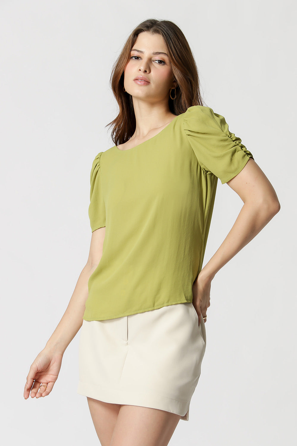 Blusa en tejido crepe de corte fluido, manga midi y volumen con frunces.