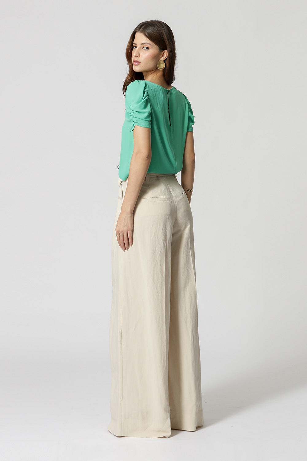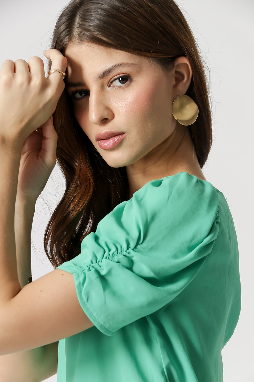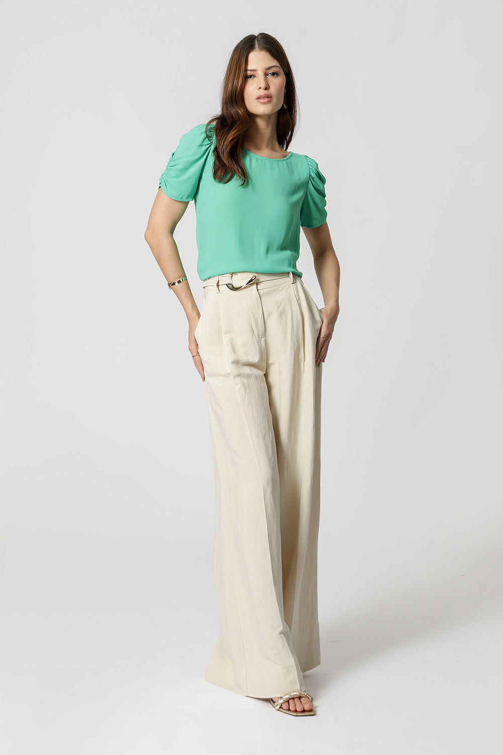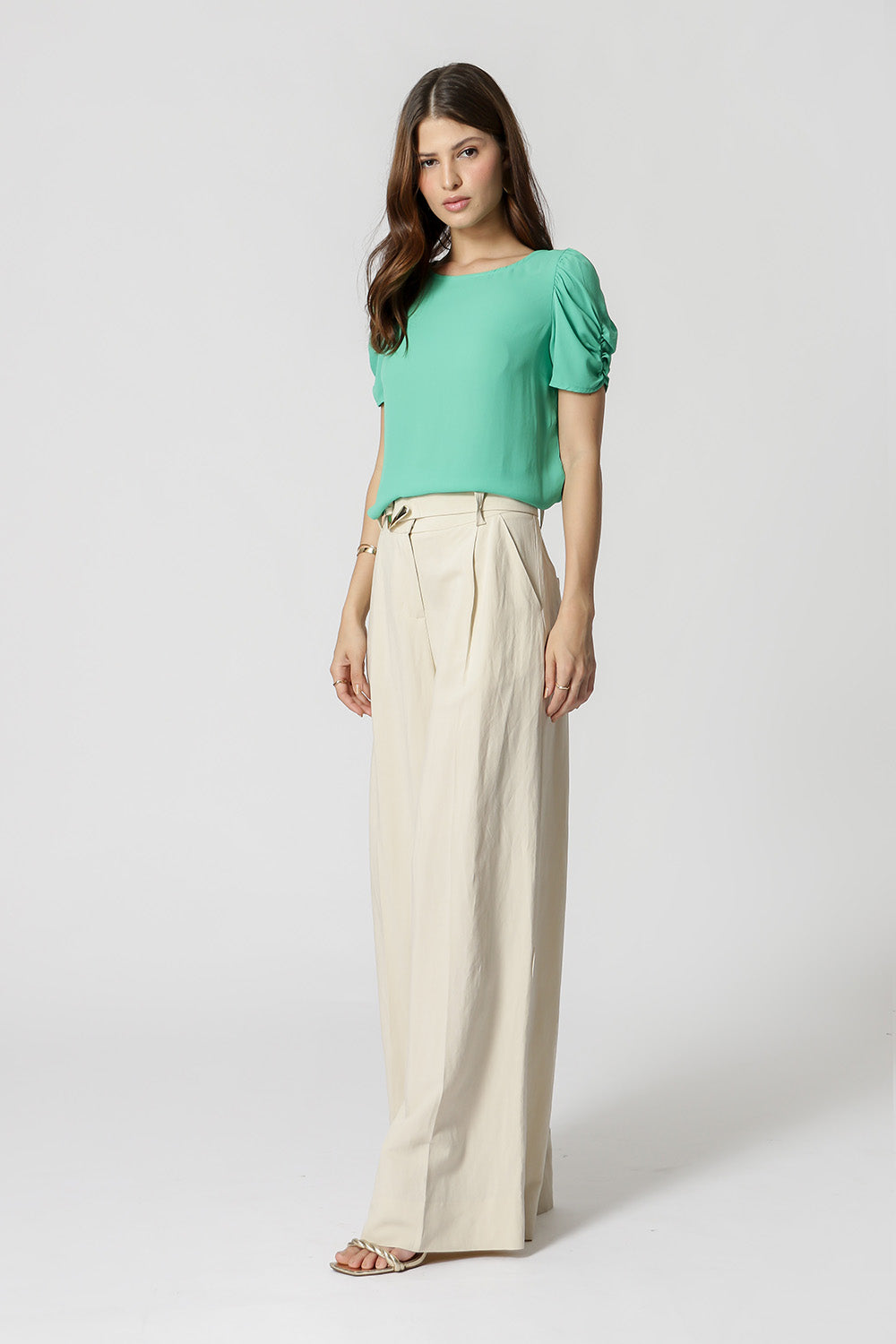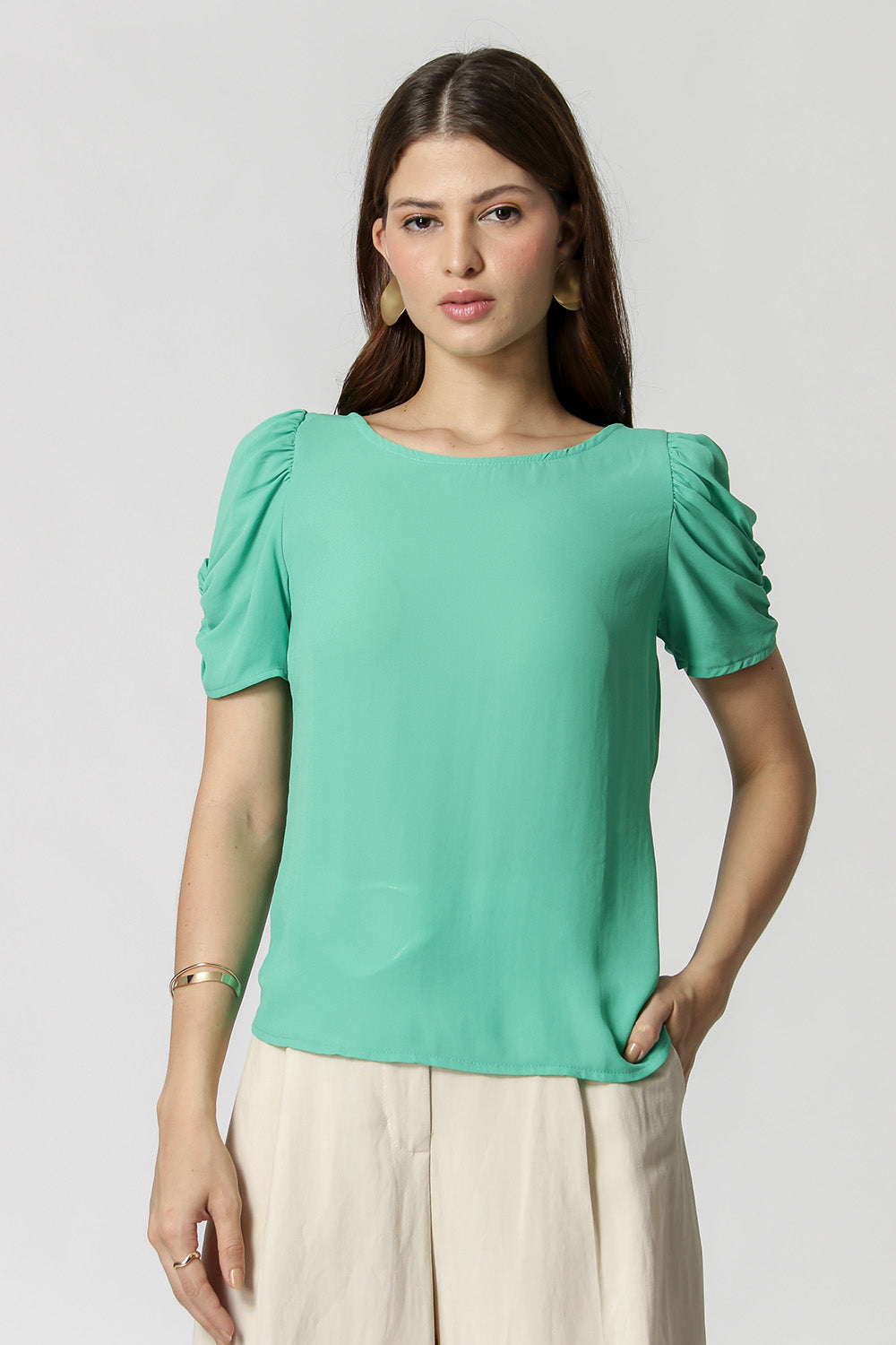Blusa en tejido crepe de corte fluido, manga midi y volumen con frunces.