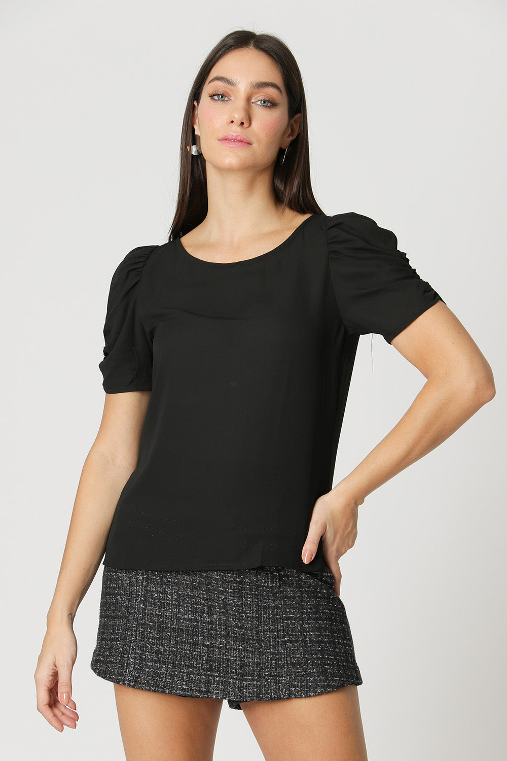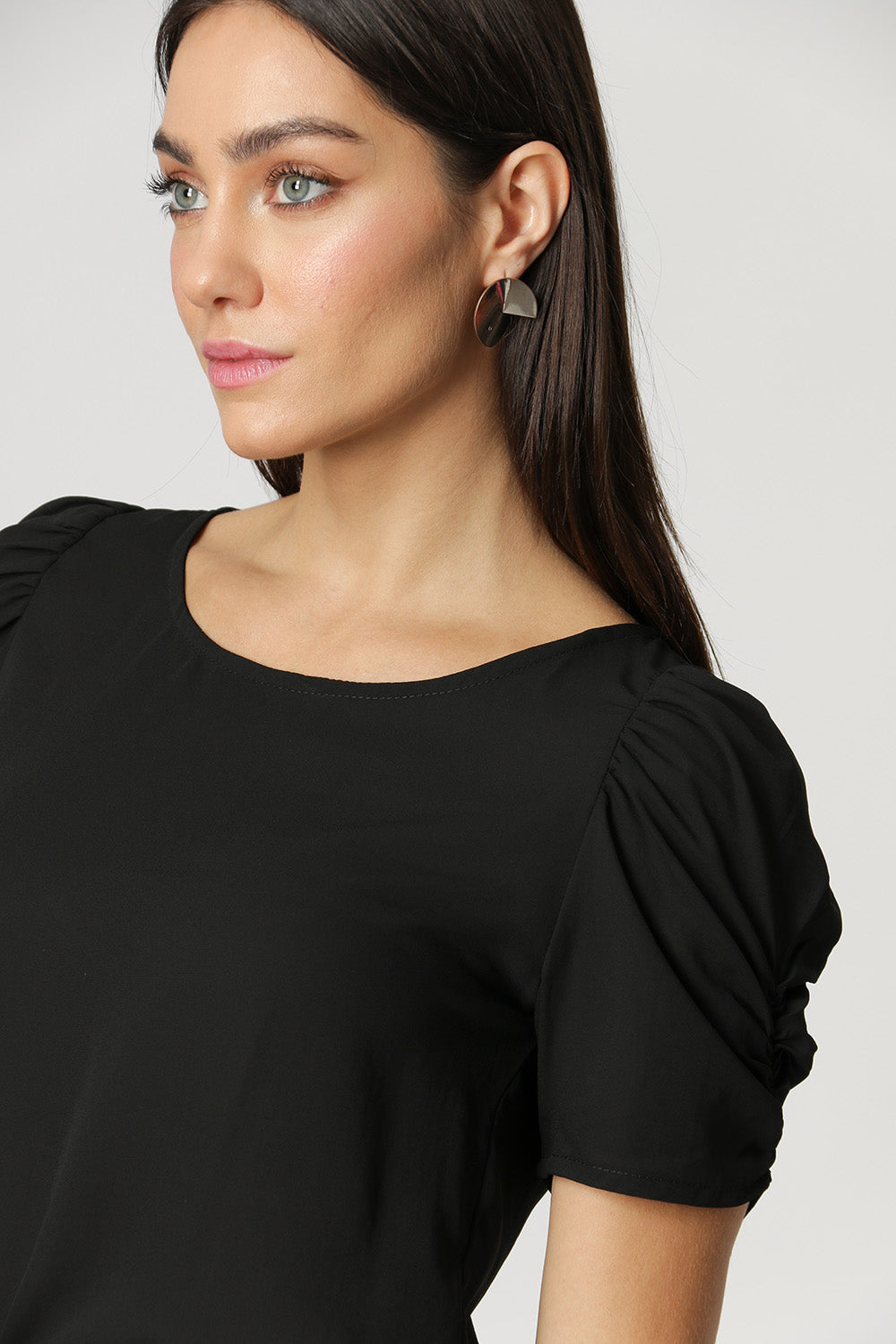 Blusa en tejido crepe de corte fluido, manga midi y volumen con frunces.