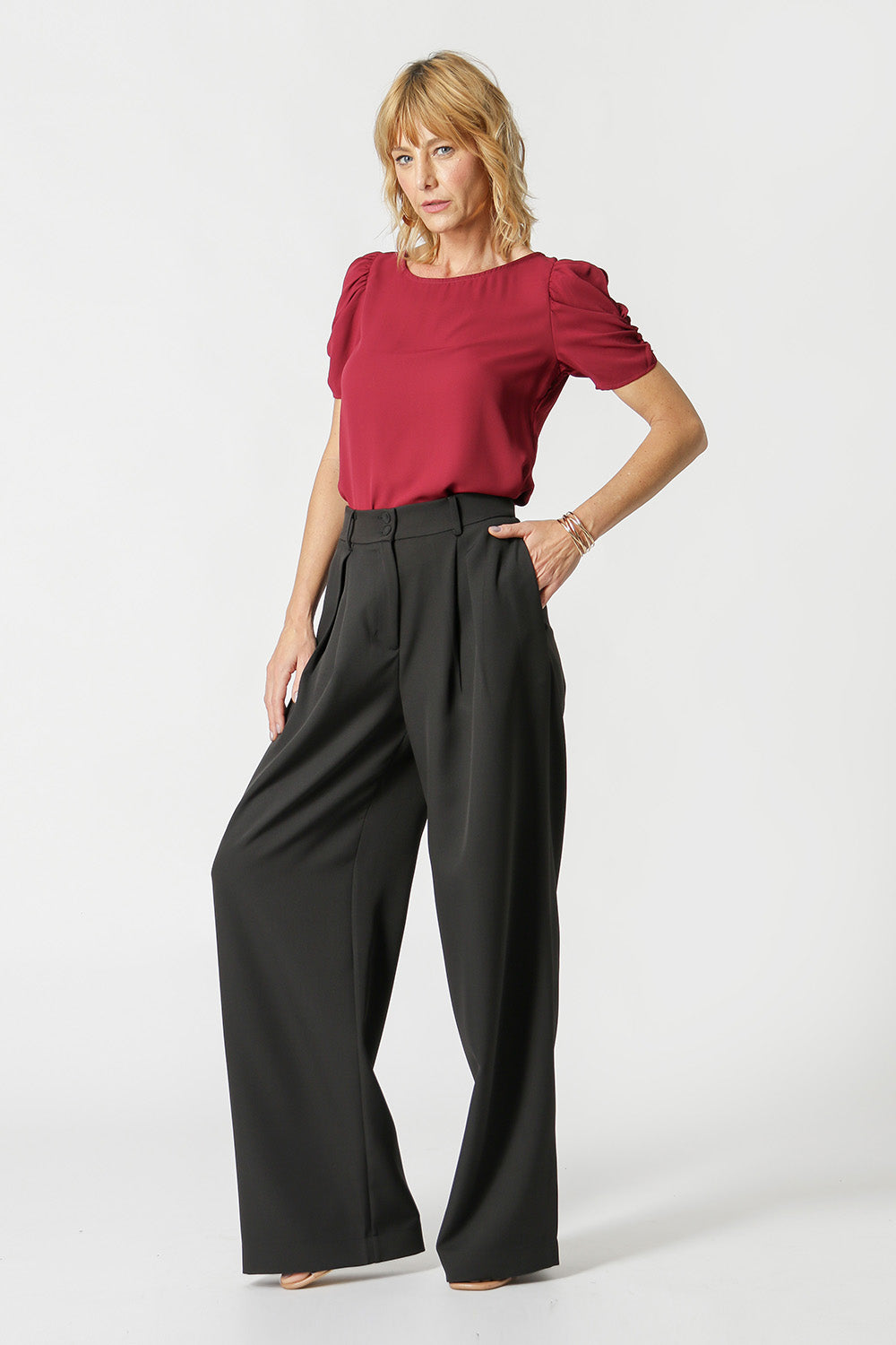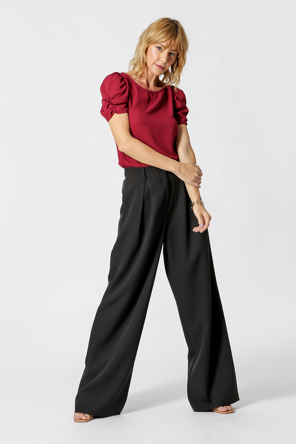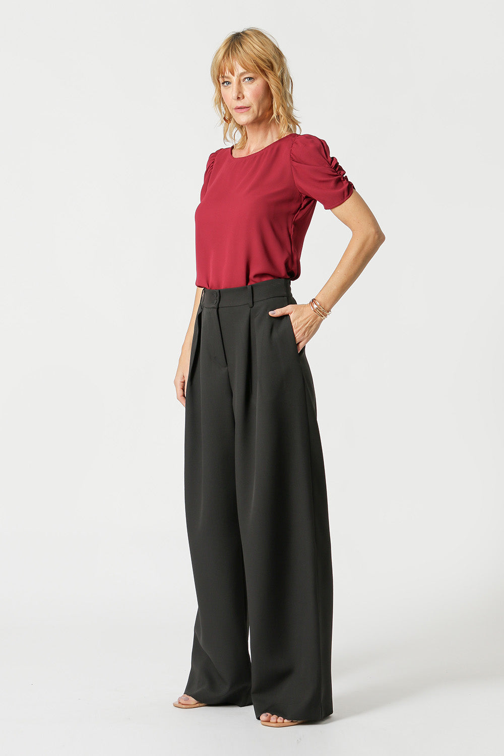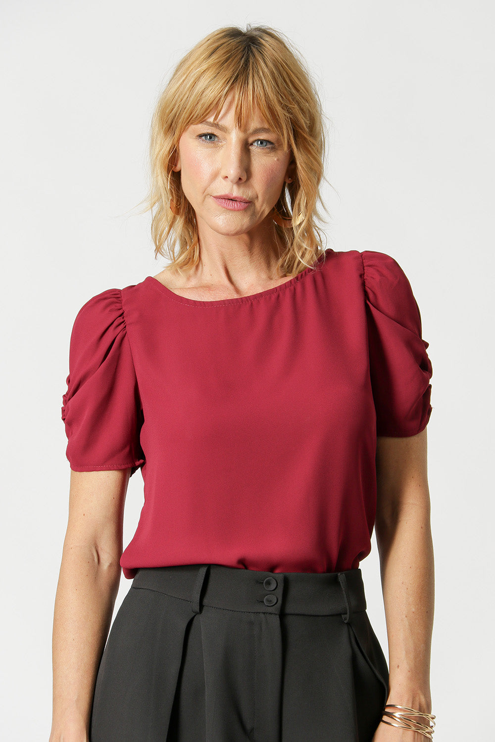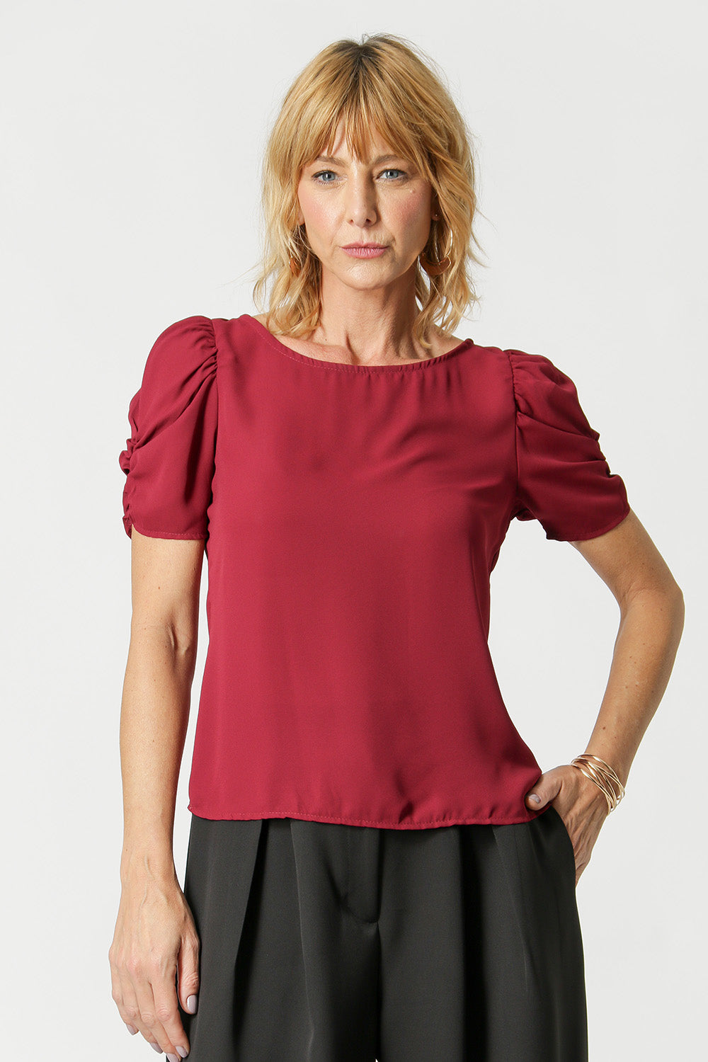 Blusa en tejido crepe de corte fluido, manga midi y volumen con frunces.