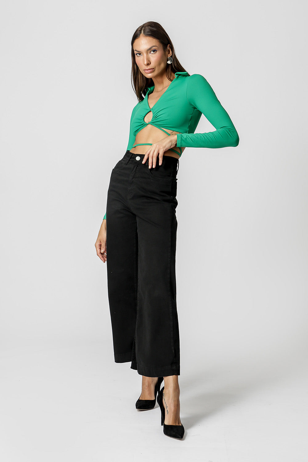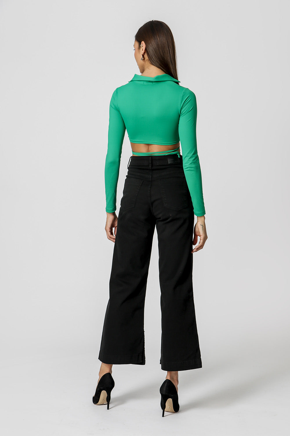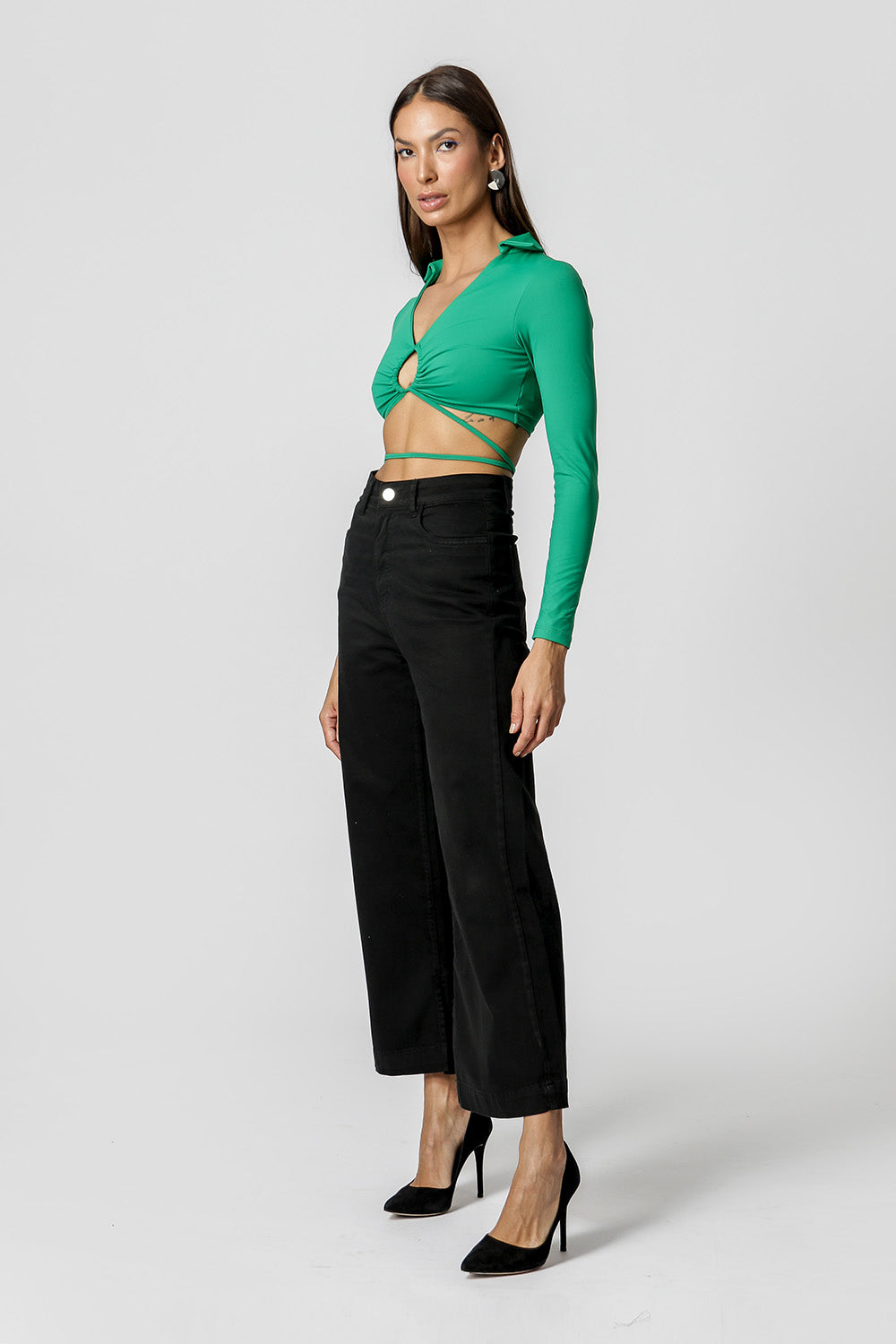 Blusa cropped, de corte ajustado al cuerpo y mangas largas. Tiene cuello y detalle de lazo en el escote. Pieza realizada en malla amni. ¡Son los básicos únicos que estabas buscando!