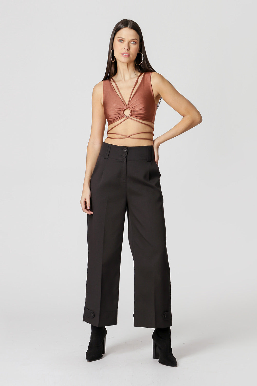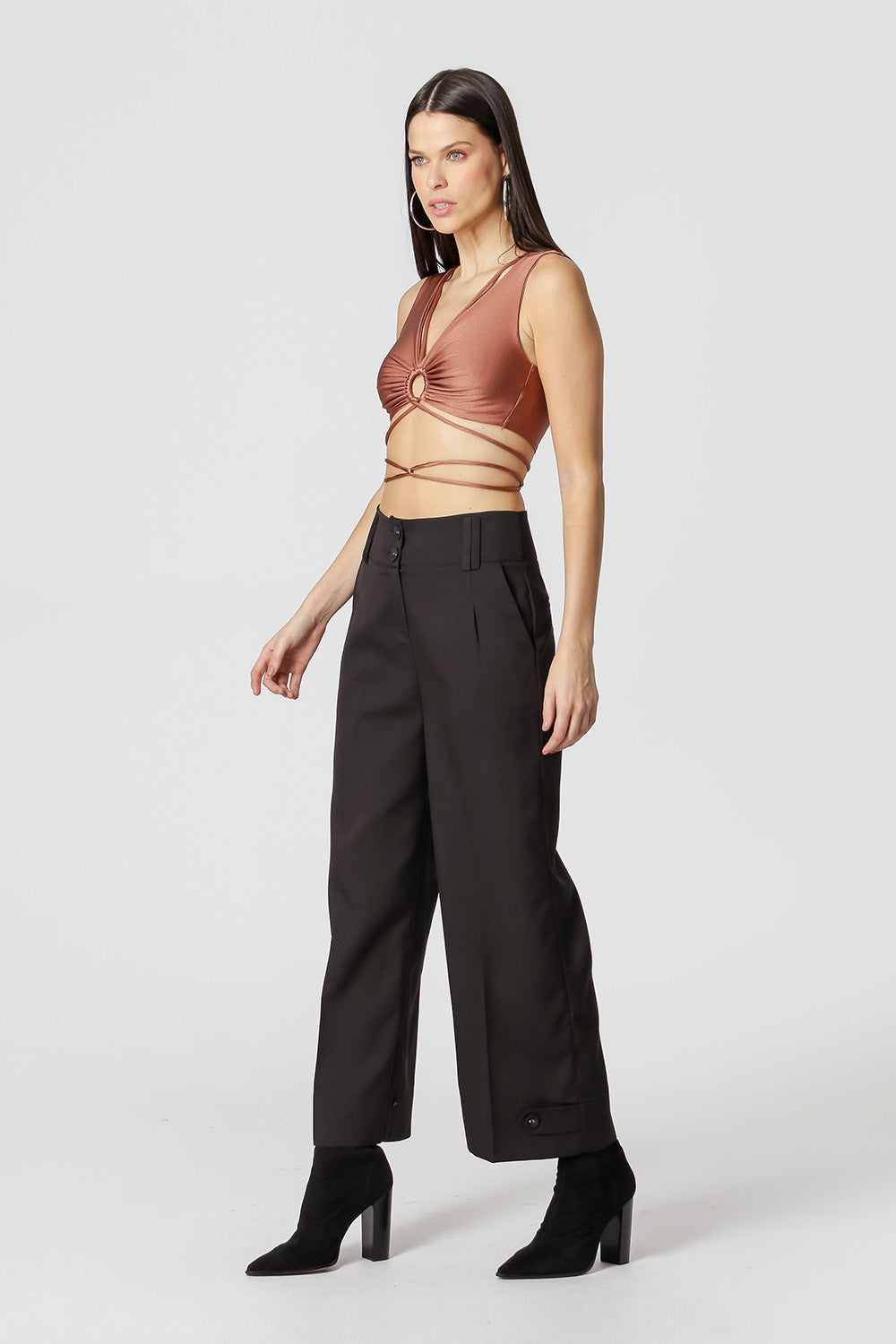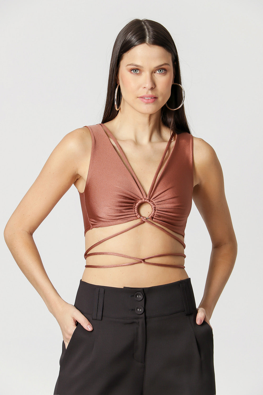 Blusa cropped de corte ajustado al cuerpo, confeccionada en malla metalizada. Tiene escote en pico con detalle de anilla metálica en el busto. ¡Una pieza única que necesitas para completar tu look de noche!