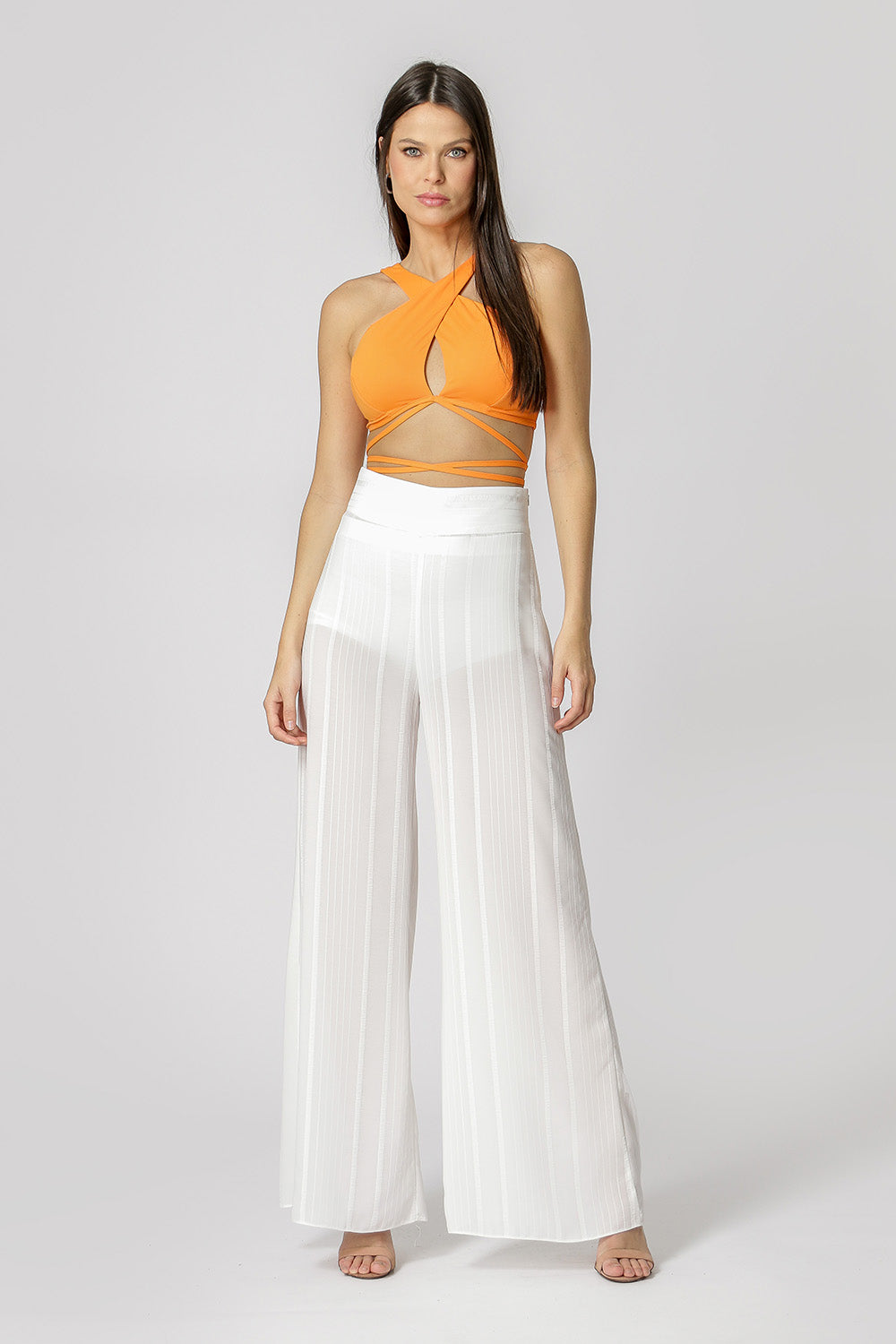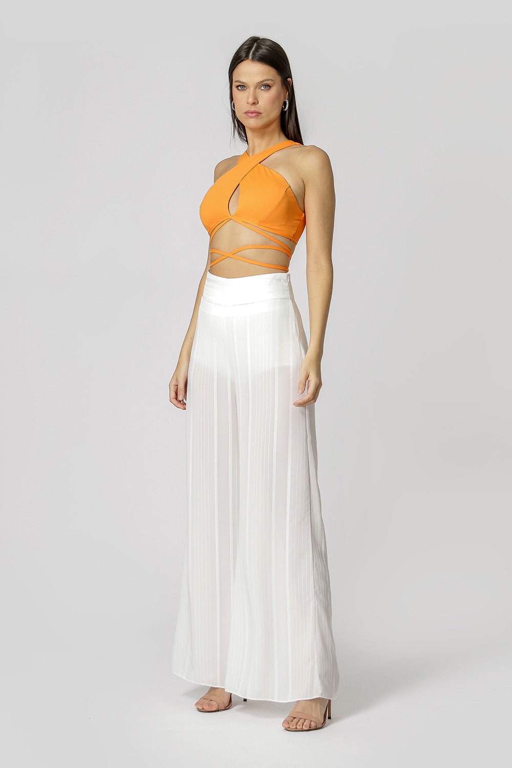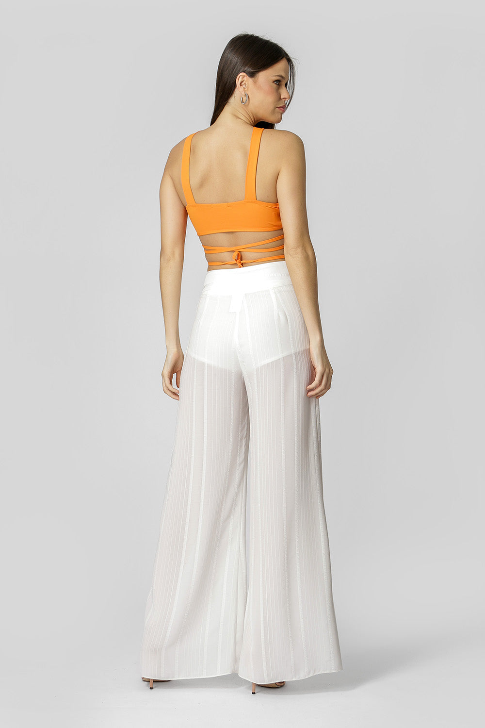 Blusa cropped de tirantes cruzados confeccionada en tejido Amni, con tirantes para atar. Cuenta con copa interna y elástica para brindar mayor seguridad. Pieza ideal para darle un toque especial a tu look de noche.