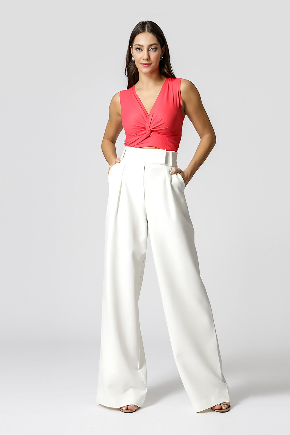 Blusa cropped en tejido de poliamida y elastano. Con escote en pico, tiene un trabajo de torsión en la parte delantera, lo que hace que la pieza sea diferente y fresca.