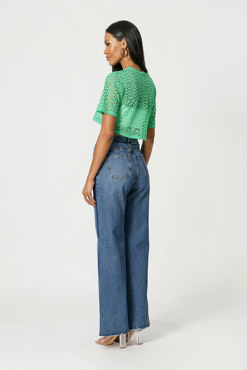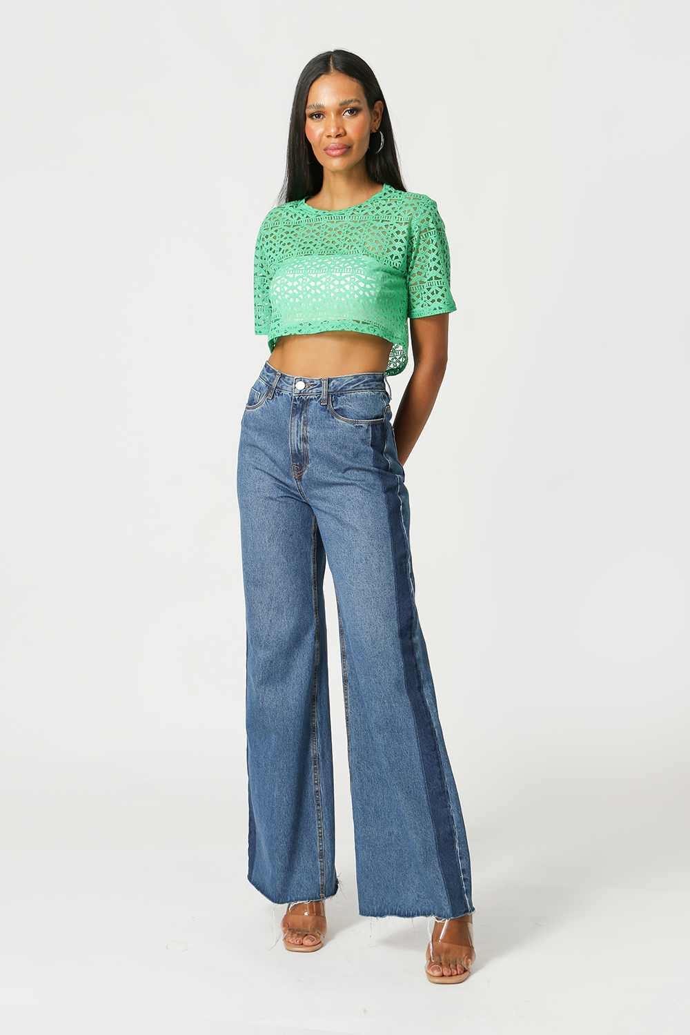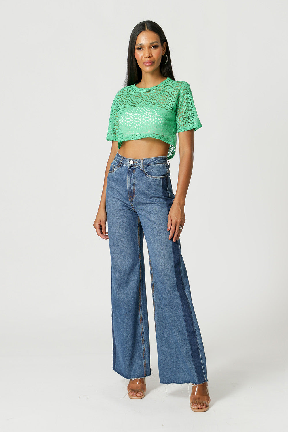 Blusa cropped con transparencia en tejido devoré. Una pieza alegre y destacada para lucir un look casual.