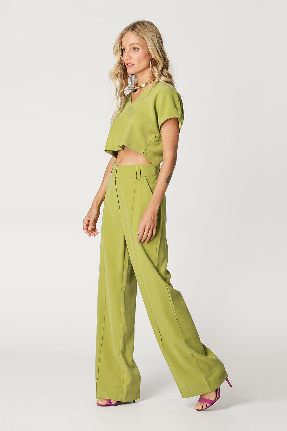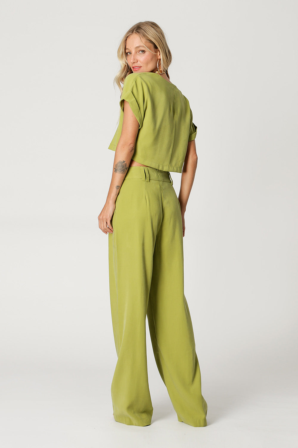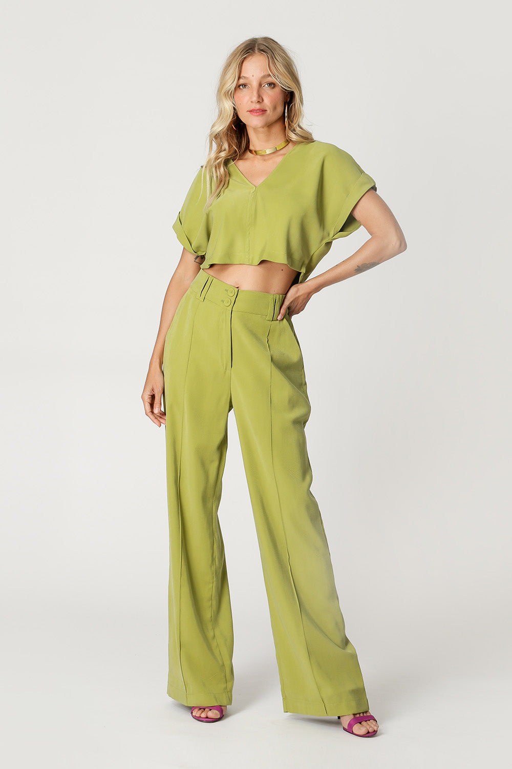 Blusa cropped con escote pico y hombros desplazados, confeccionada en viscosa, aportando un look fresco y casual.