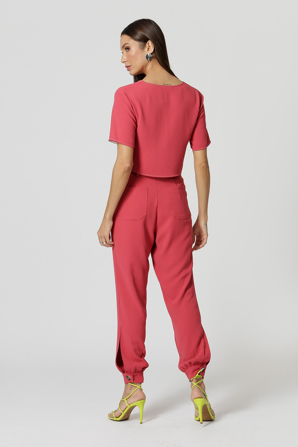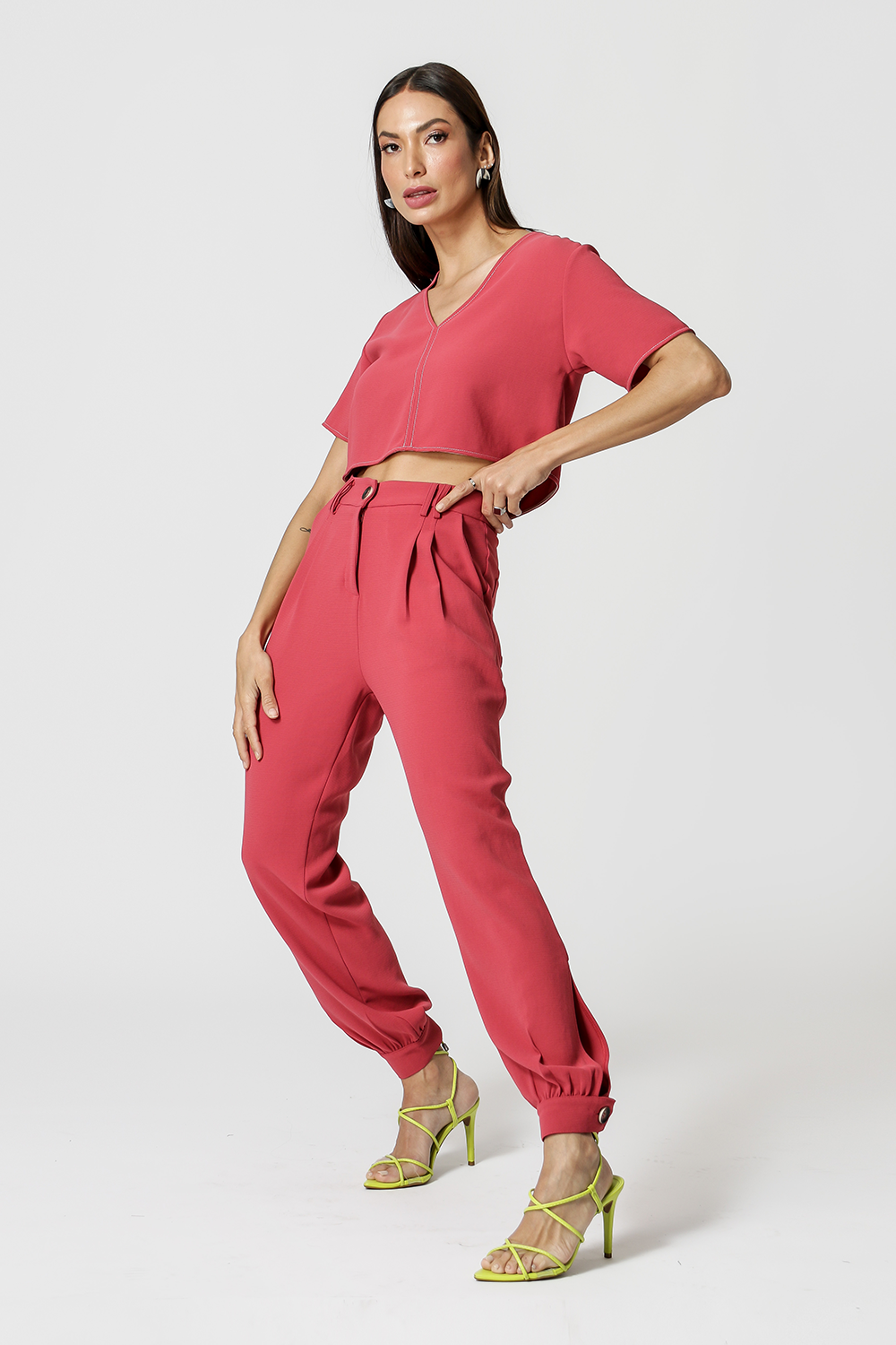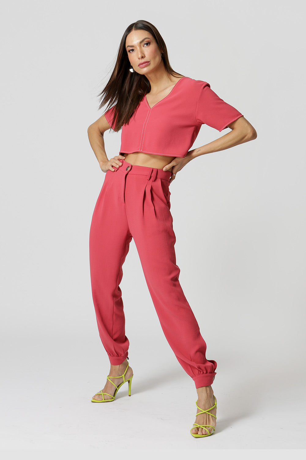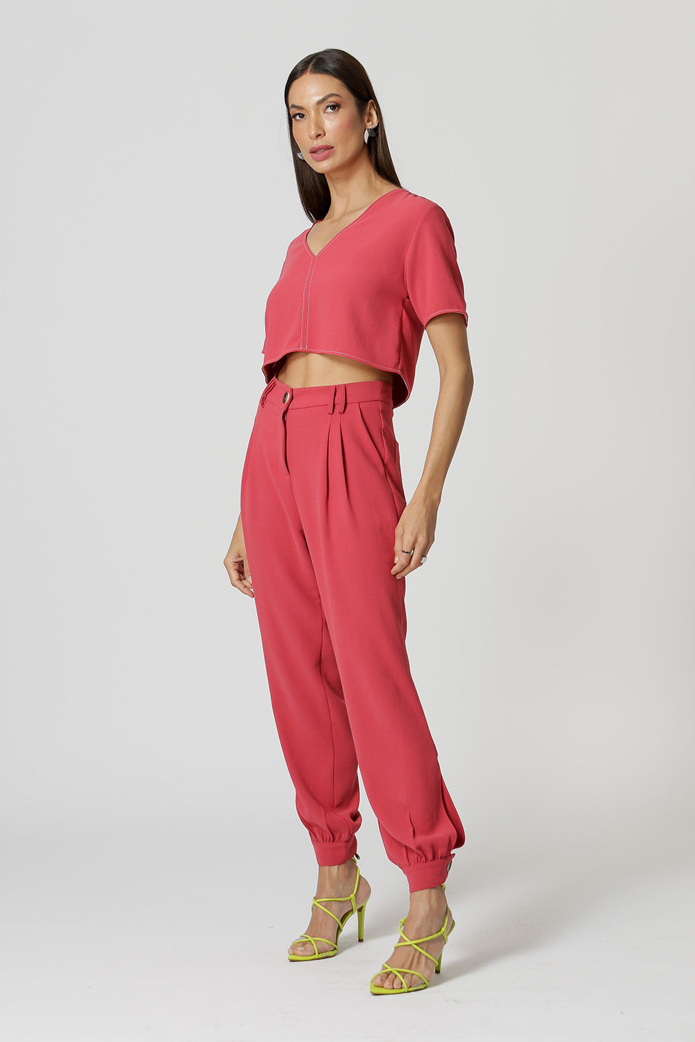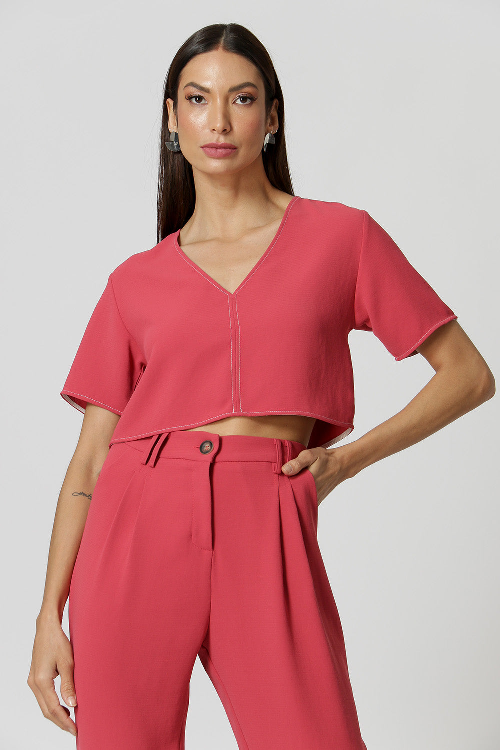 Blusa cropped de corte más holgado, manga corta y escote en pico. Detalle de costura en contraste. Pieza casual y versátil.