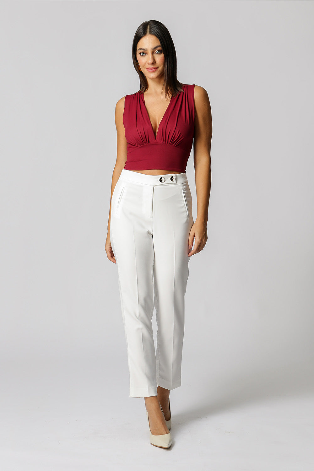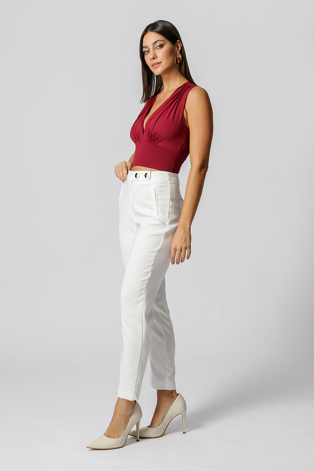 Blusa cropped con escote pico confeccionada en tejido amni. Tiene metal interno que estructura el escote.