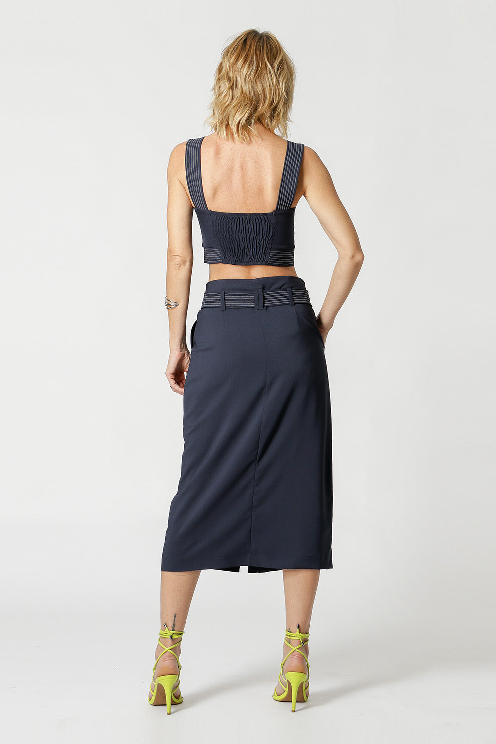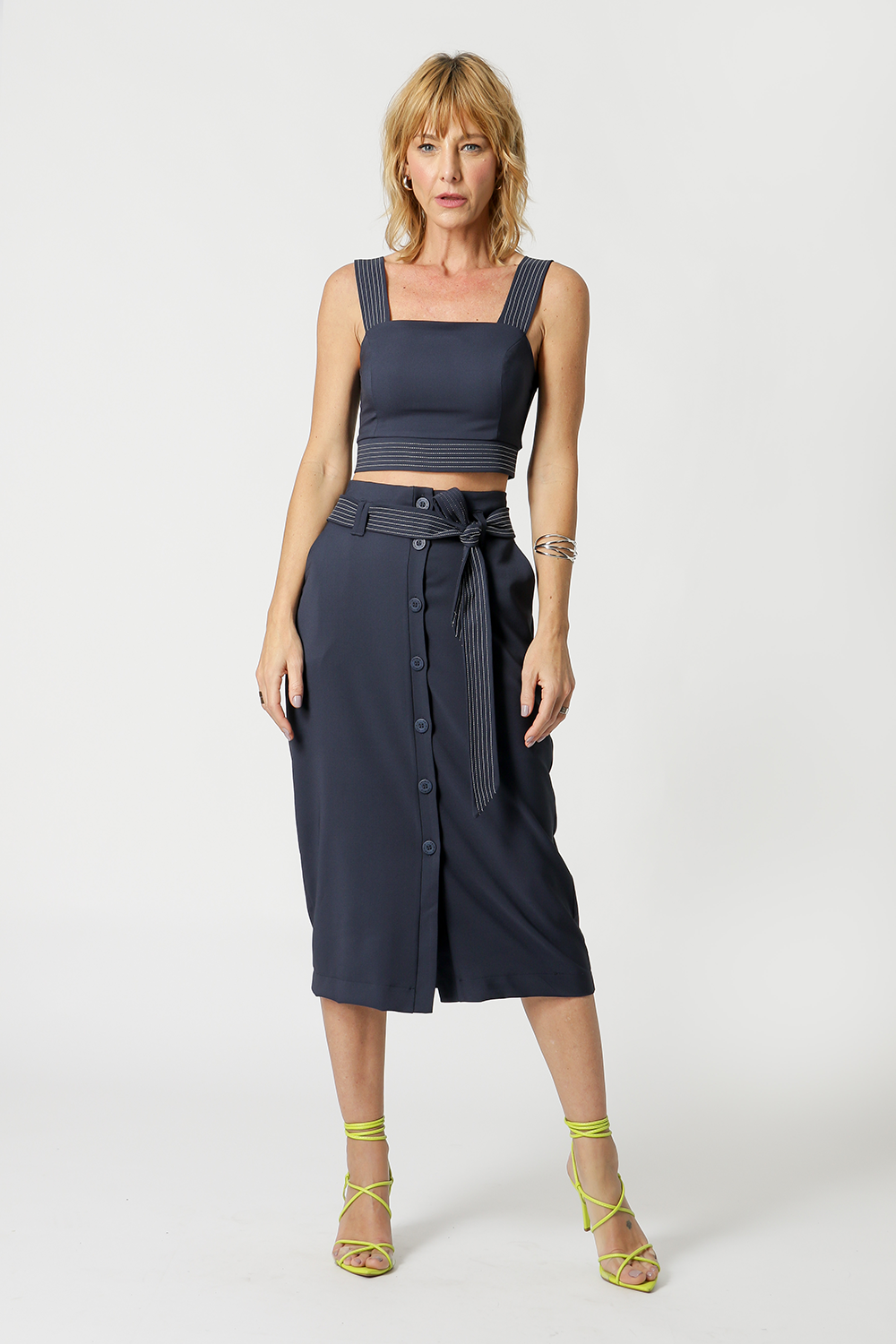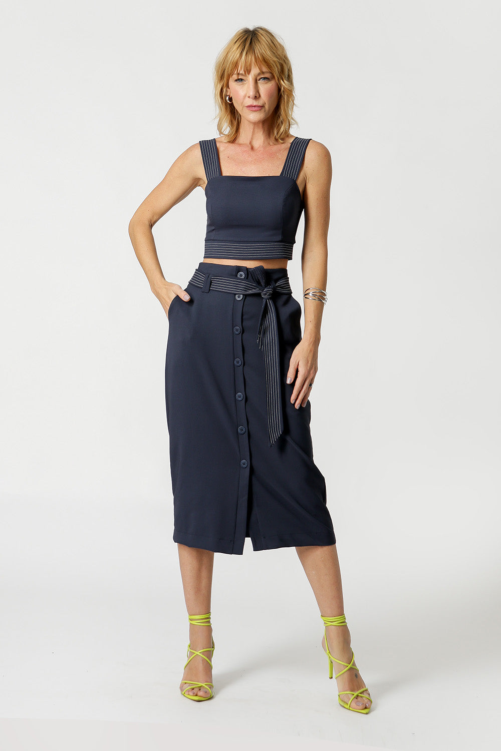 Blusa cropped, de corte más ajustado al cuerpo, tirantes anchos, espalda elástica y detalle de costura en contraste. Pieza confeccionada en crepe de sastrería, ideal para un look casual chic.