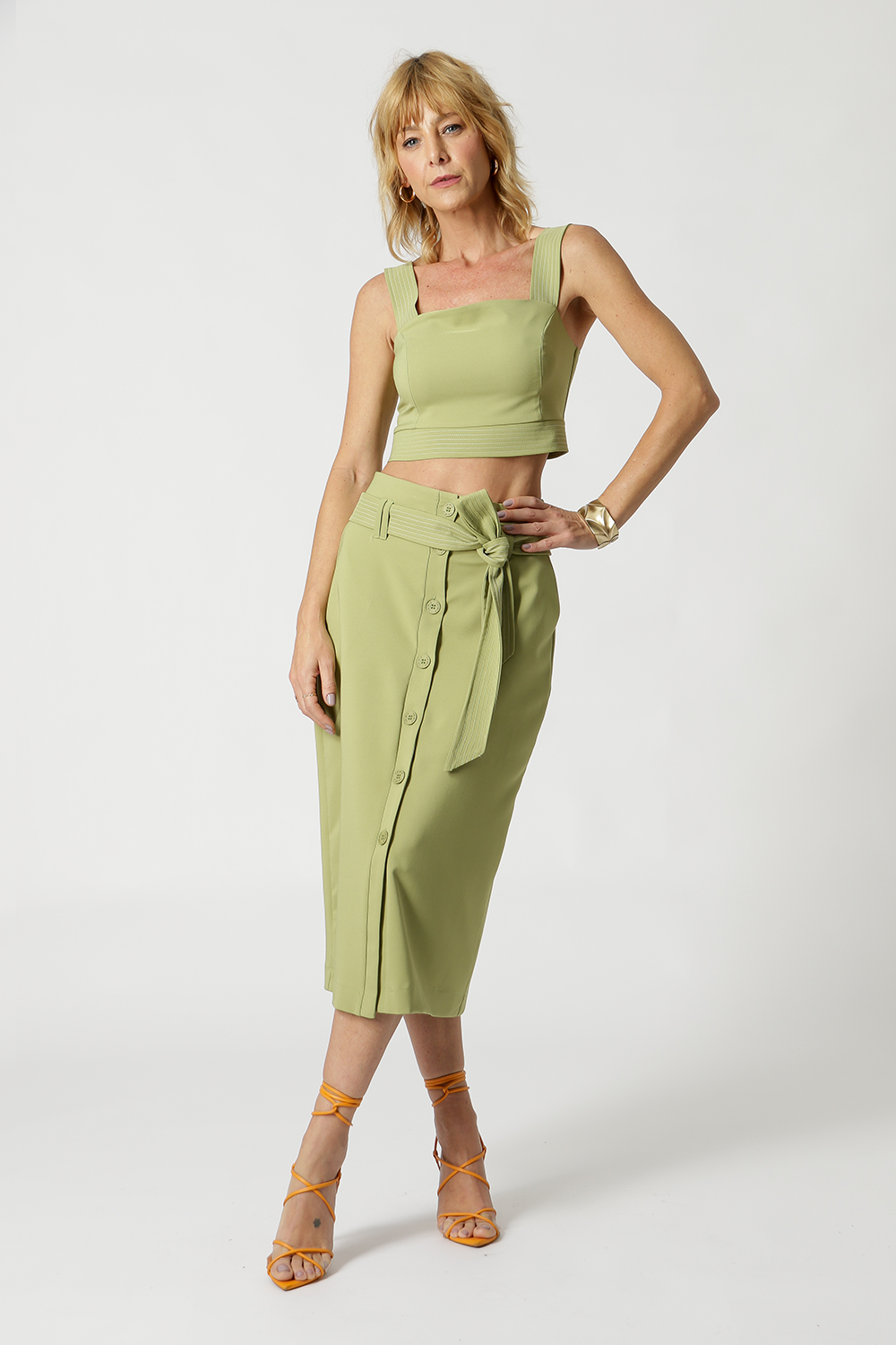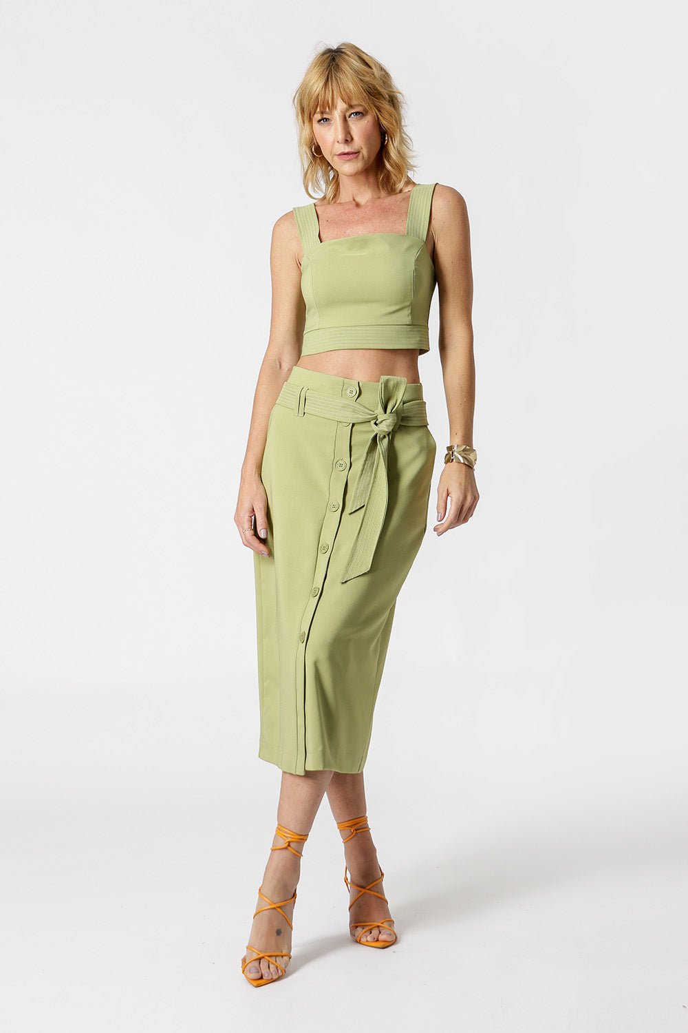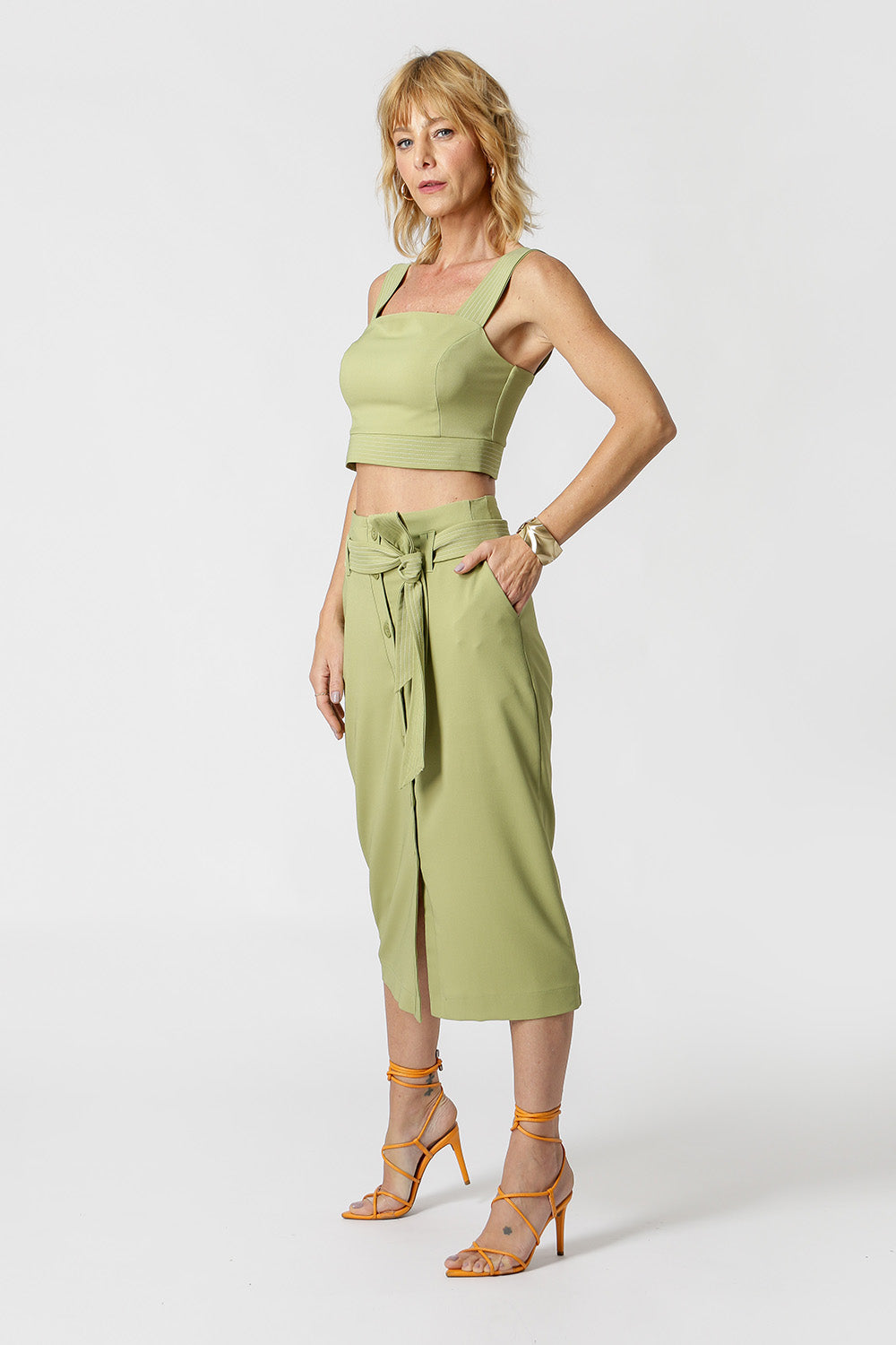 Blusa cropped, de corte más ajustado al cuerpo, tirantes anchos, espalda elástica y detalle de costura en contraste. Pieza confeccionada en crepe de sastrería, ideal para un look casual chic.