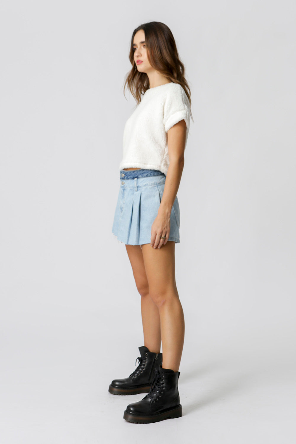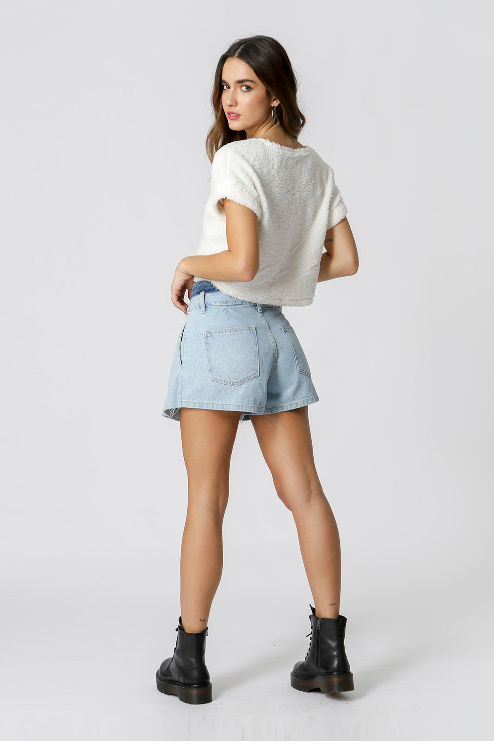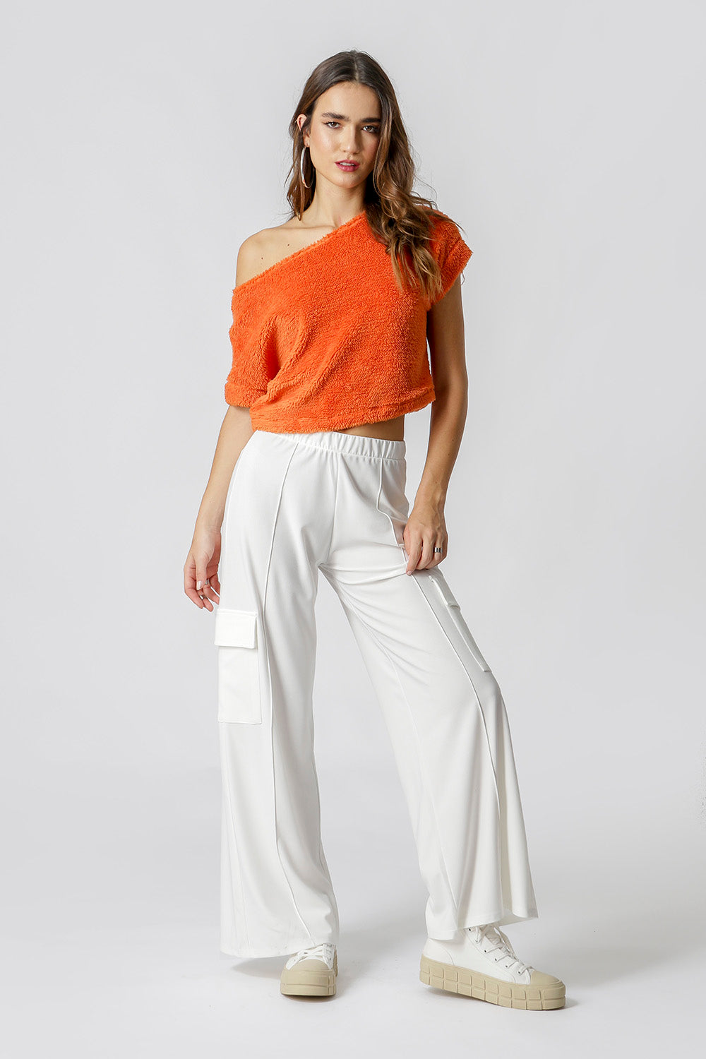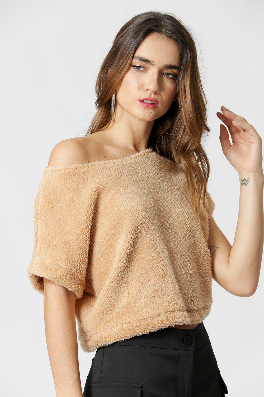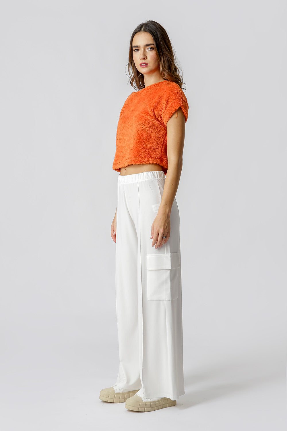 Blusa com comprimento cropped, confeccionado em tecido floc, uma peça ideal para sobreposições com camisas de tricoline. Um look jovem e atual.