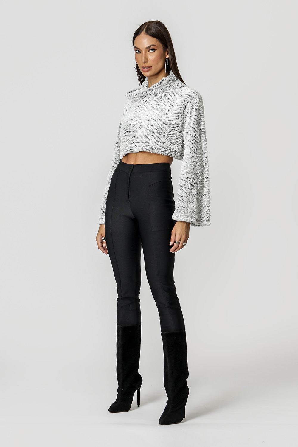 Blusa cropped, de corte holgado en el cuerpo, mangas largas y detalle de cuello voluminoso. Pieza confeccionada en punto de pelo. Una pieza versátil para looks casuales o incluso para una salida nocturna.