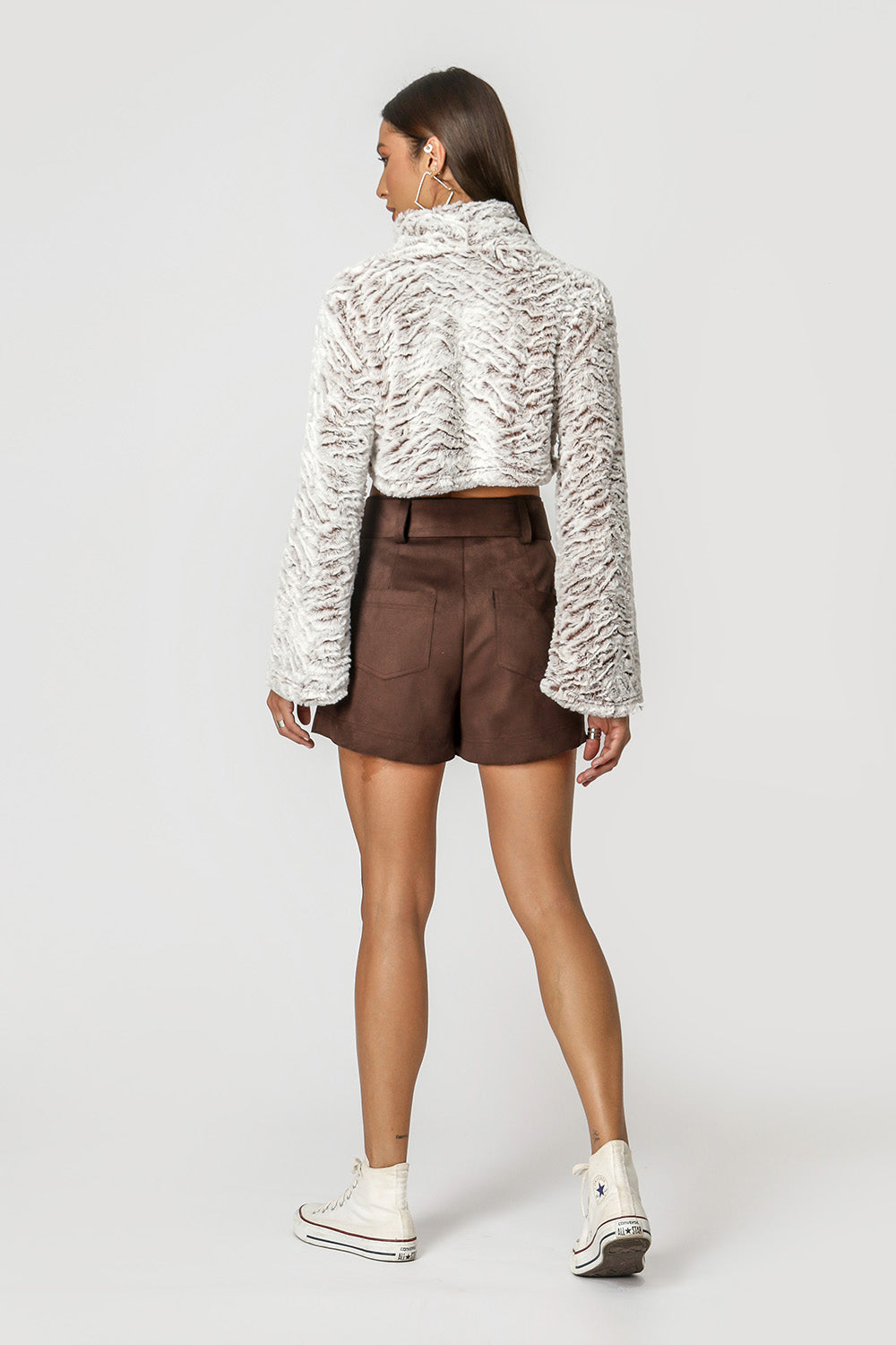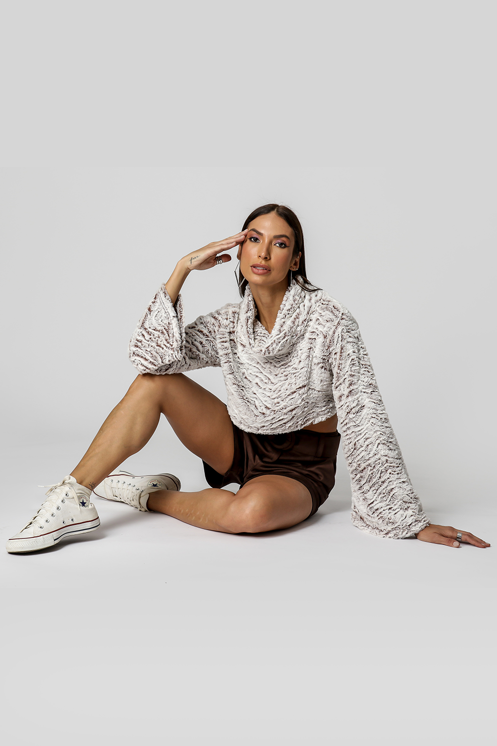 Blusa cropped, de corte holgado en el cuerpo, mangas largas y detalle de cuello voluminoso. Pieza confeccionada en punto de pelo. Una pieza versátil para looks casuales o incluso para una salida nocturna.