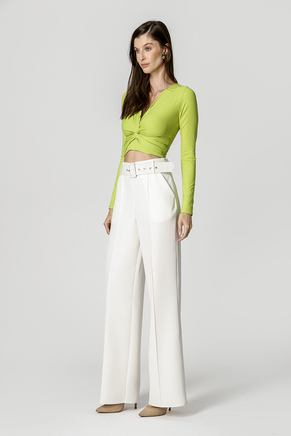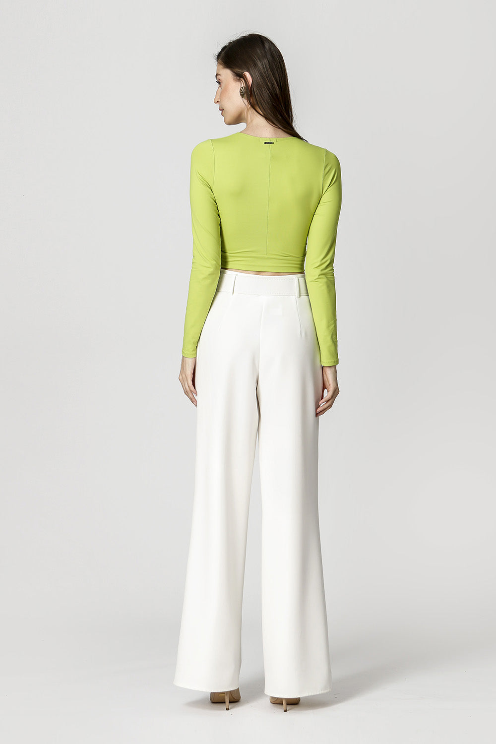 Blusa en tejido de punto Amni, largo crop, manga larga con detalle de giro en la parte delantera y escote en pico. Pieza ideal para looks modernos y cool.