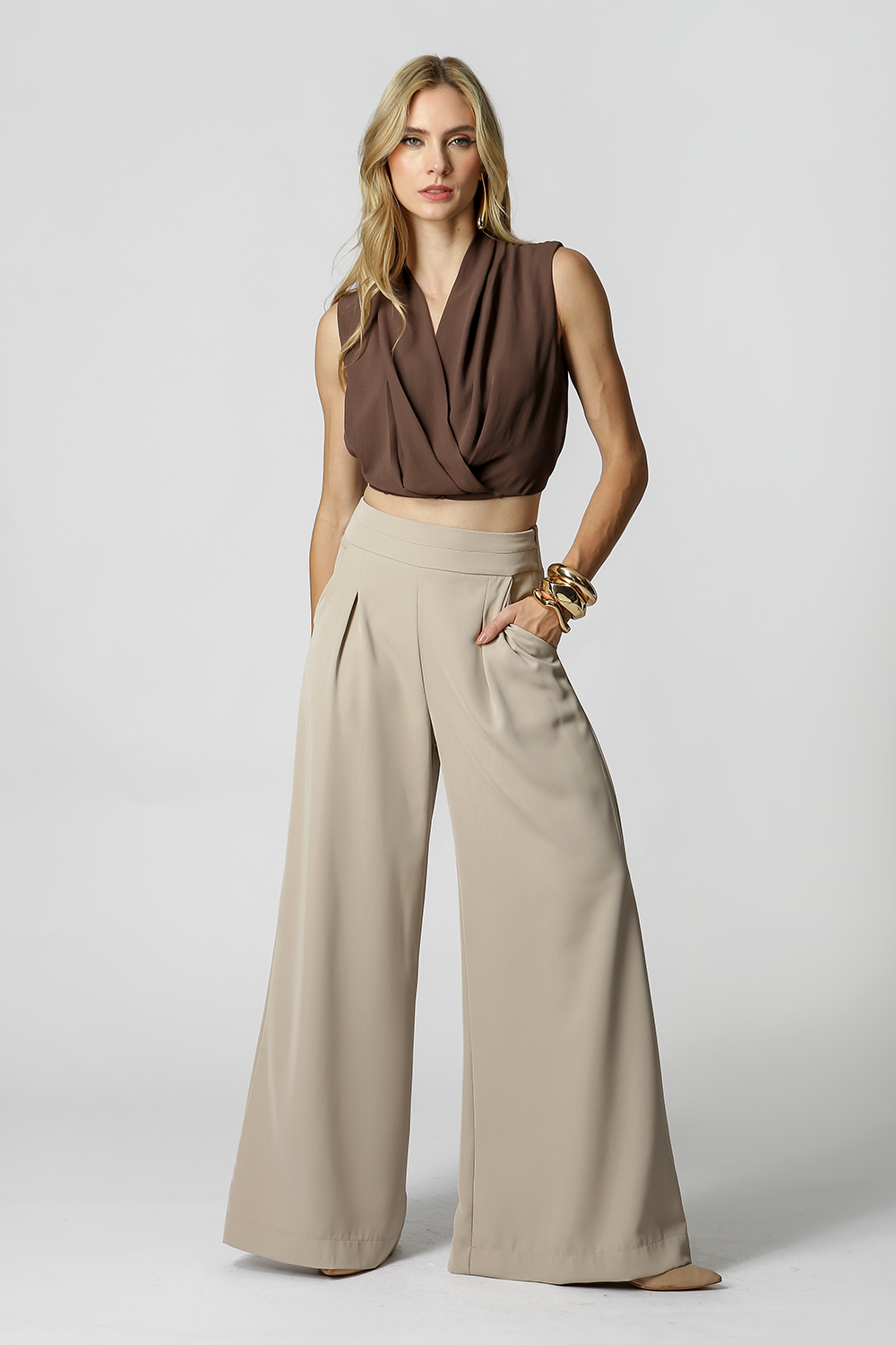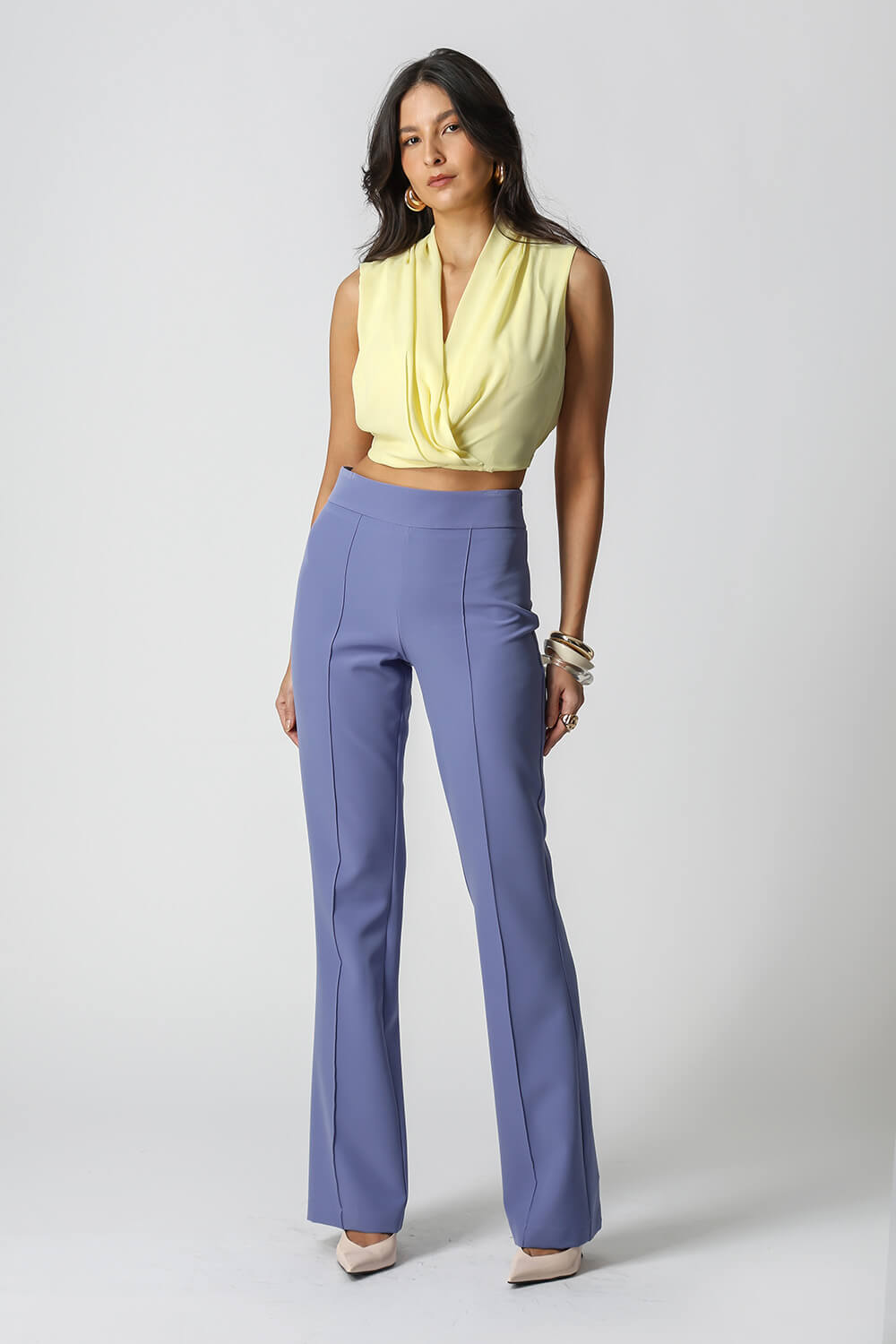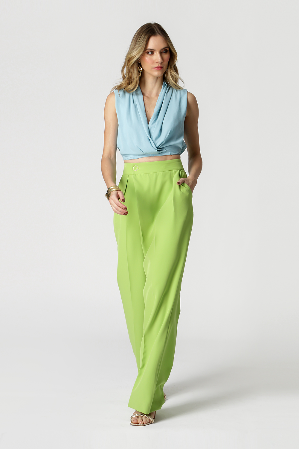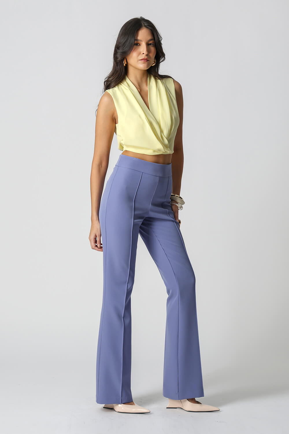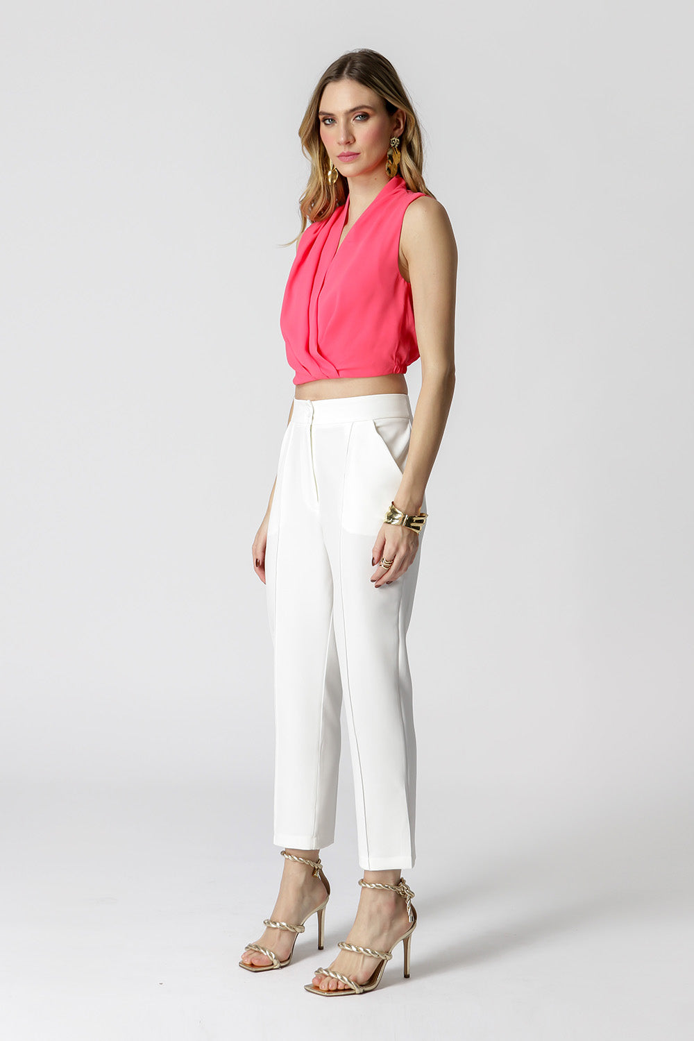 Blusa cropped transpassada e com elástico na barra. Uma peça confeccionada em tecido crepe fluído. Um modelo perfeito para mood work.
