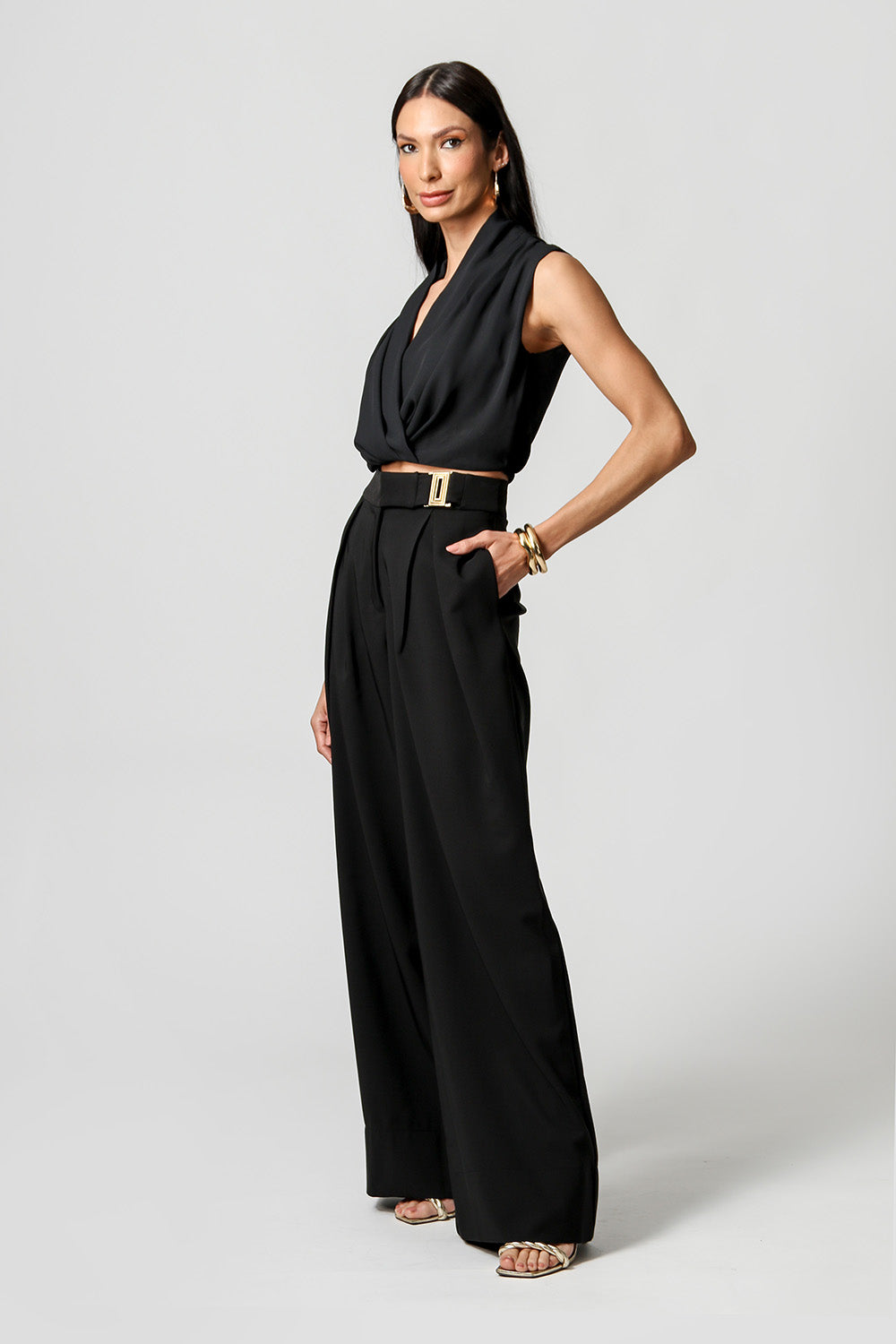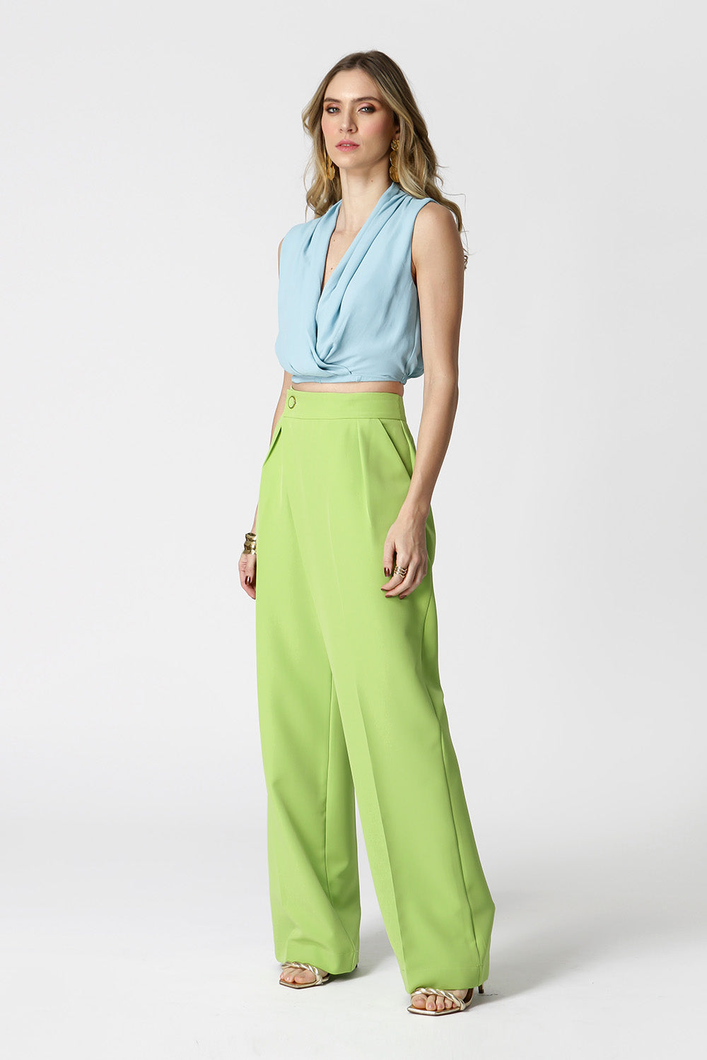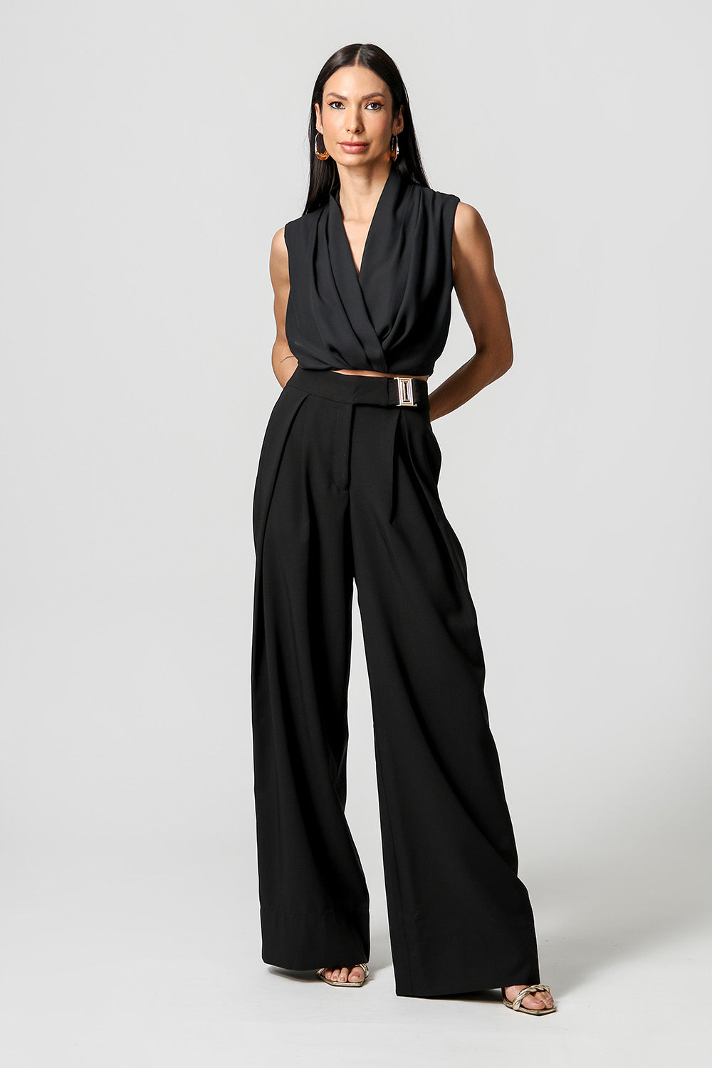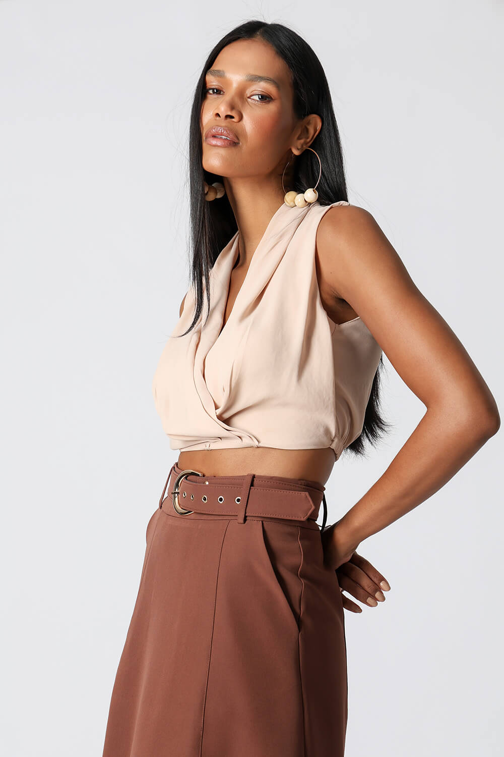 Blusa cropped transpassada e com elástico na barra. Uma peça confeccionada em tecido crepe fluído. Um modelo perfeito para mood work.