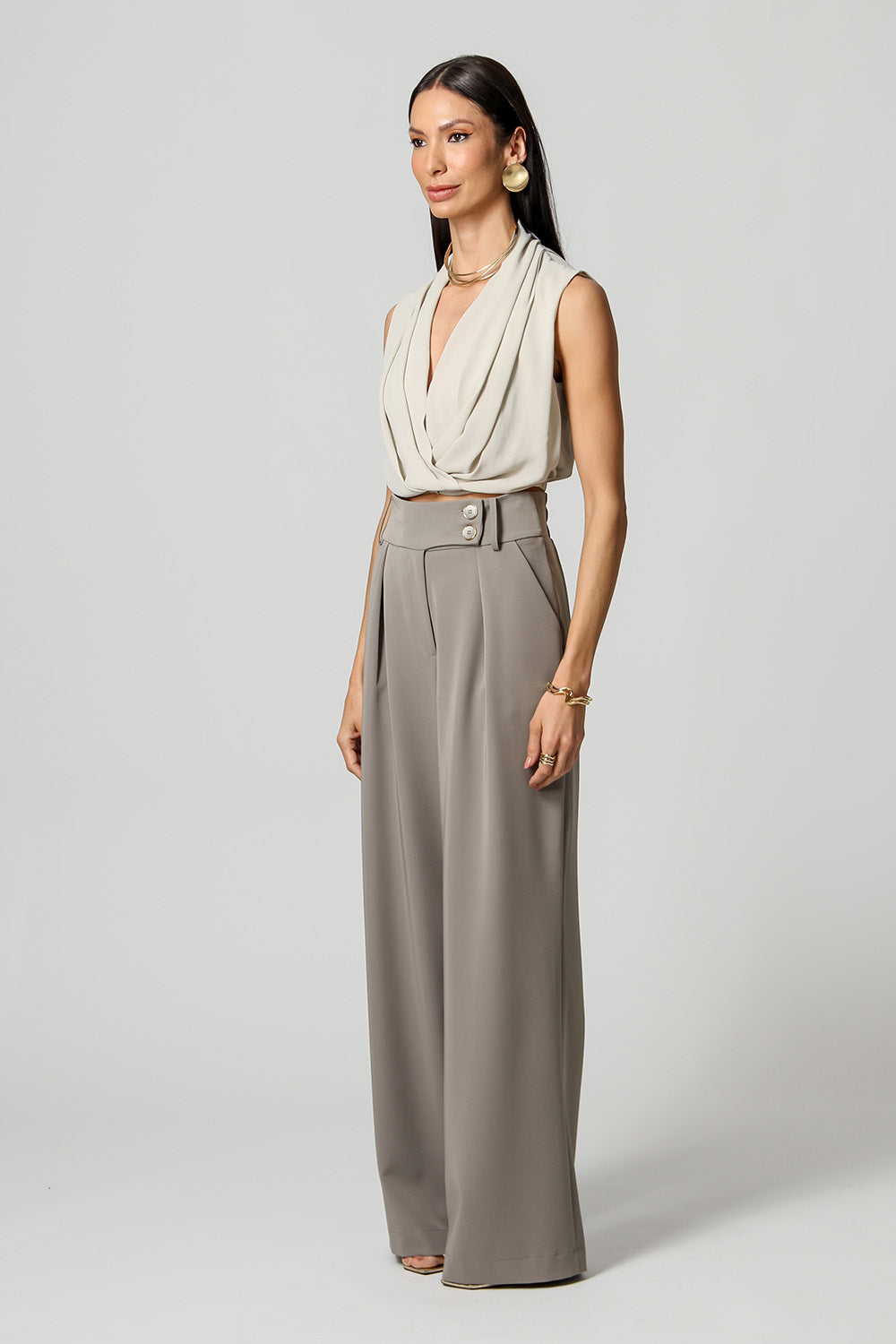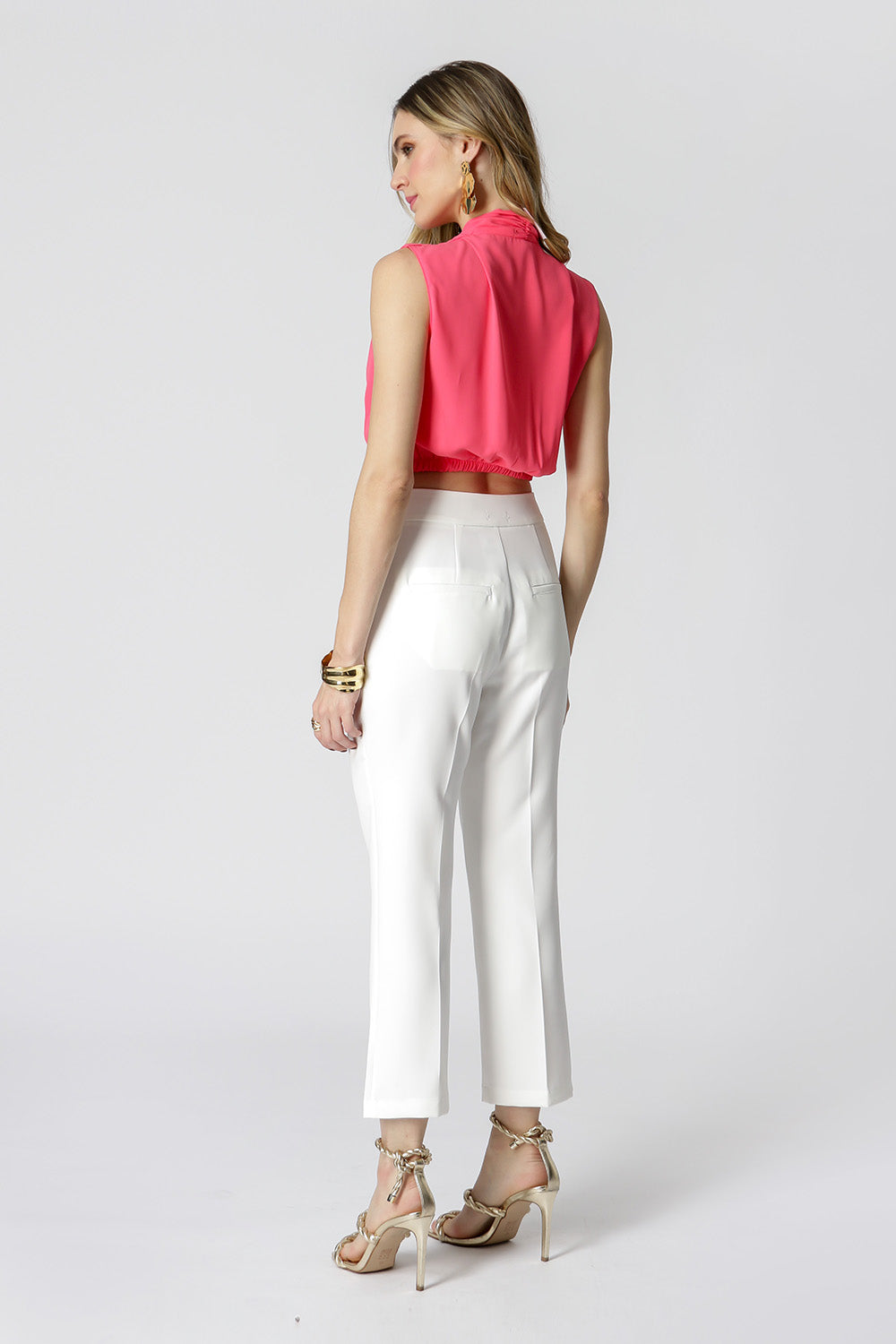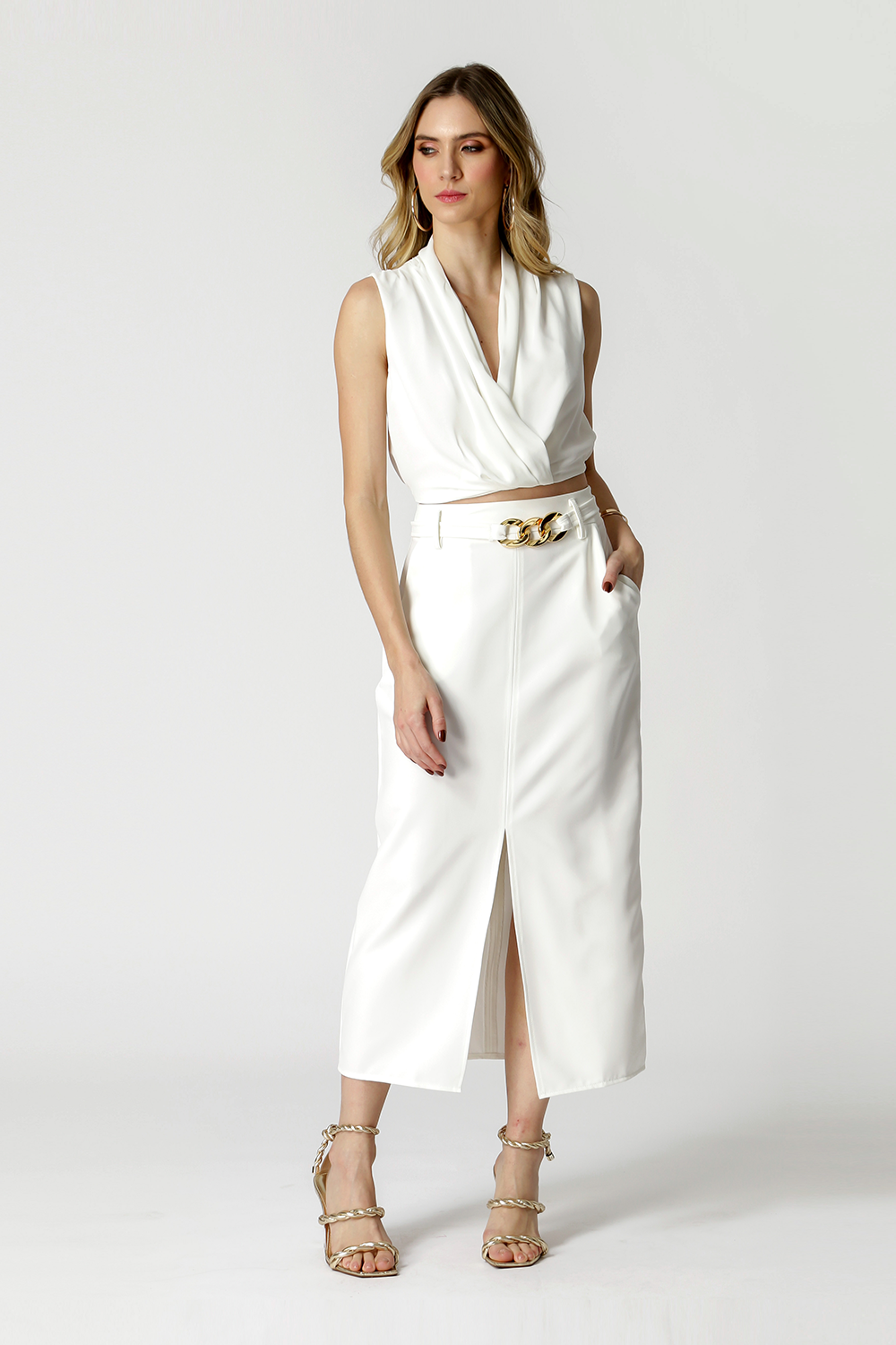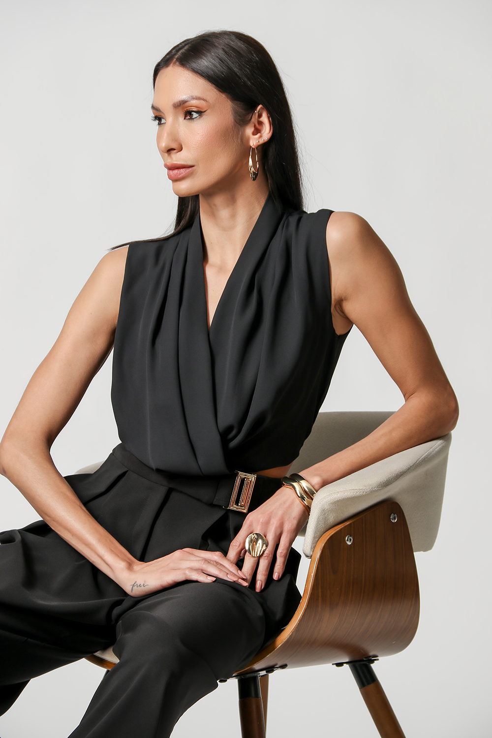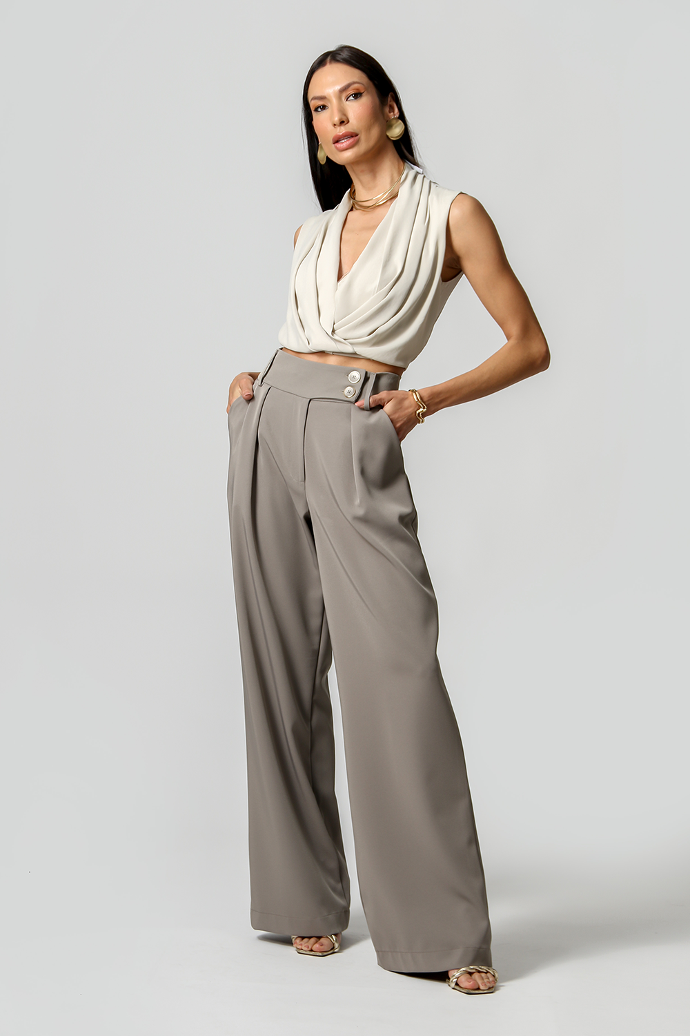 Blusa cropped transpassada e com elástico na barra. Uma peça confeccionada em tecido crepe fluído. Um modelo perfeito para mood work.