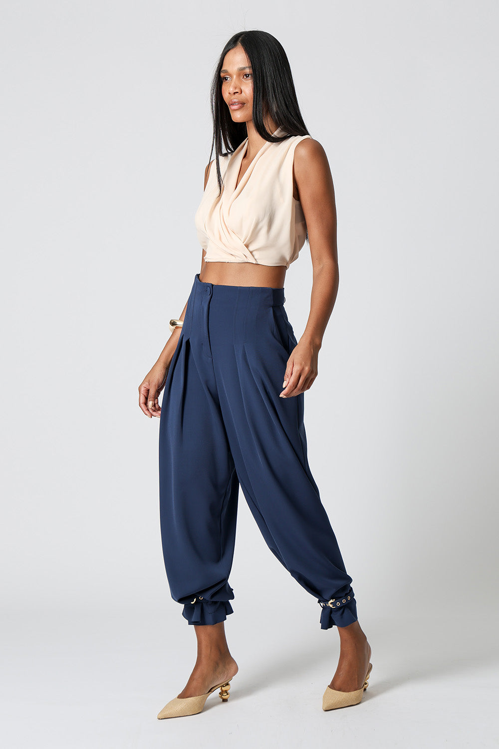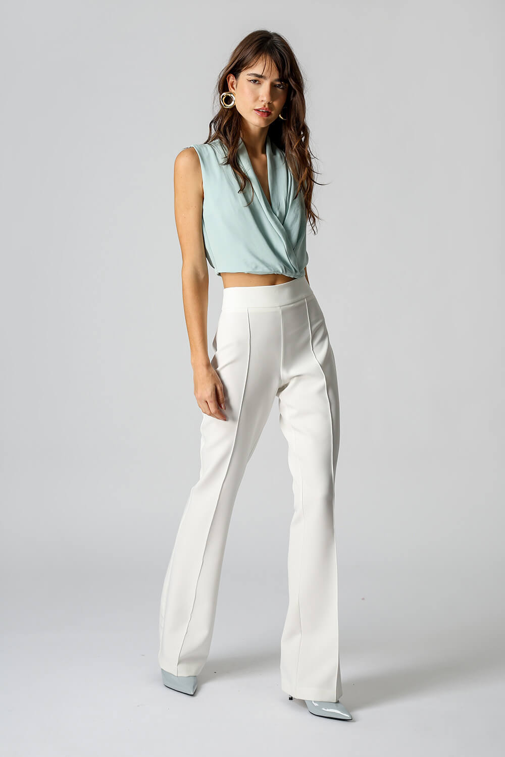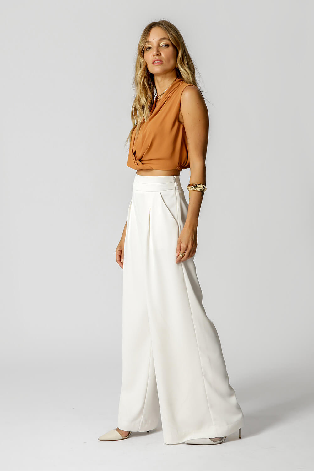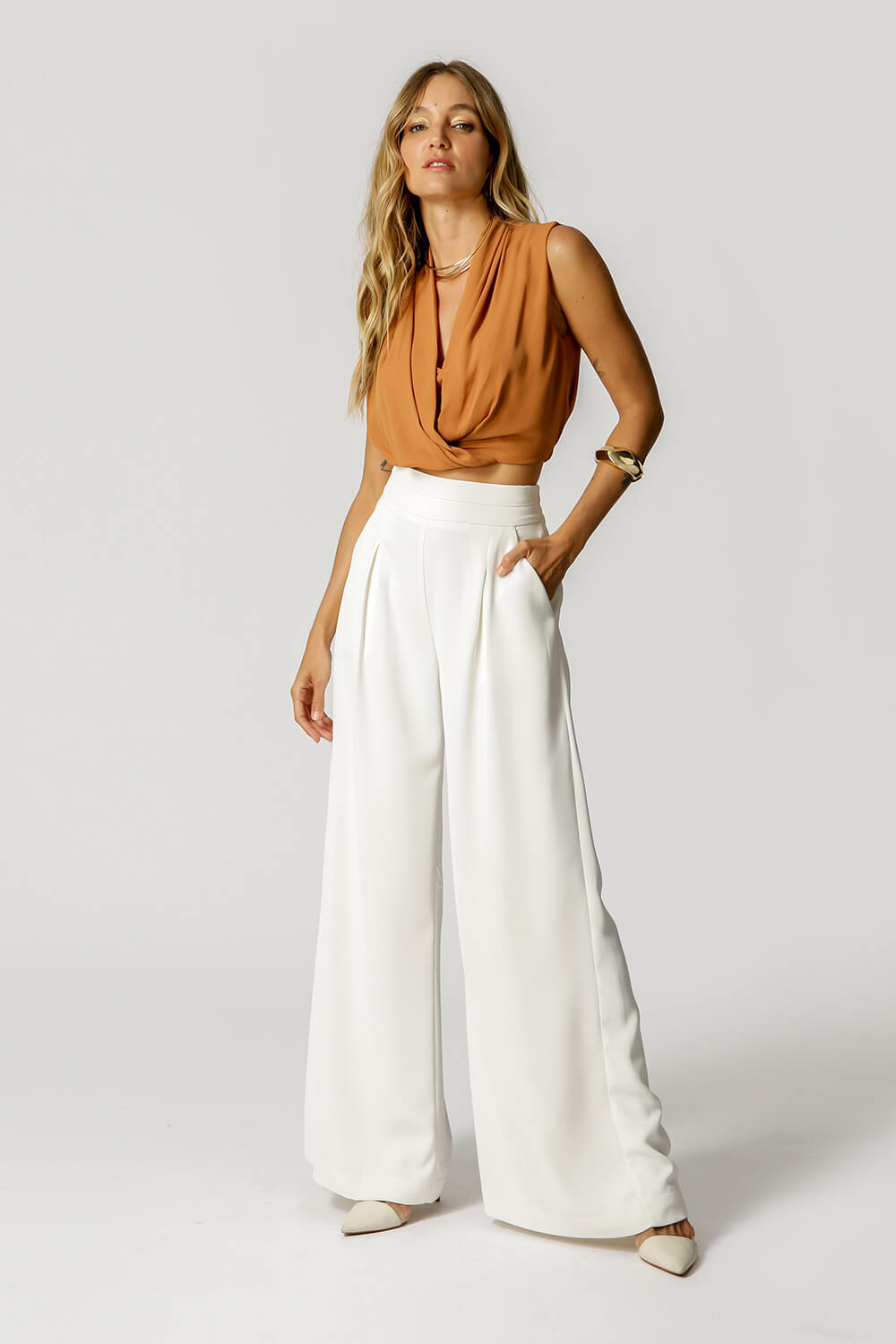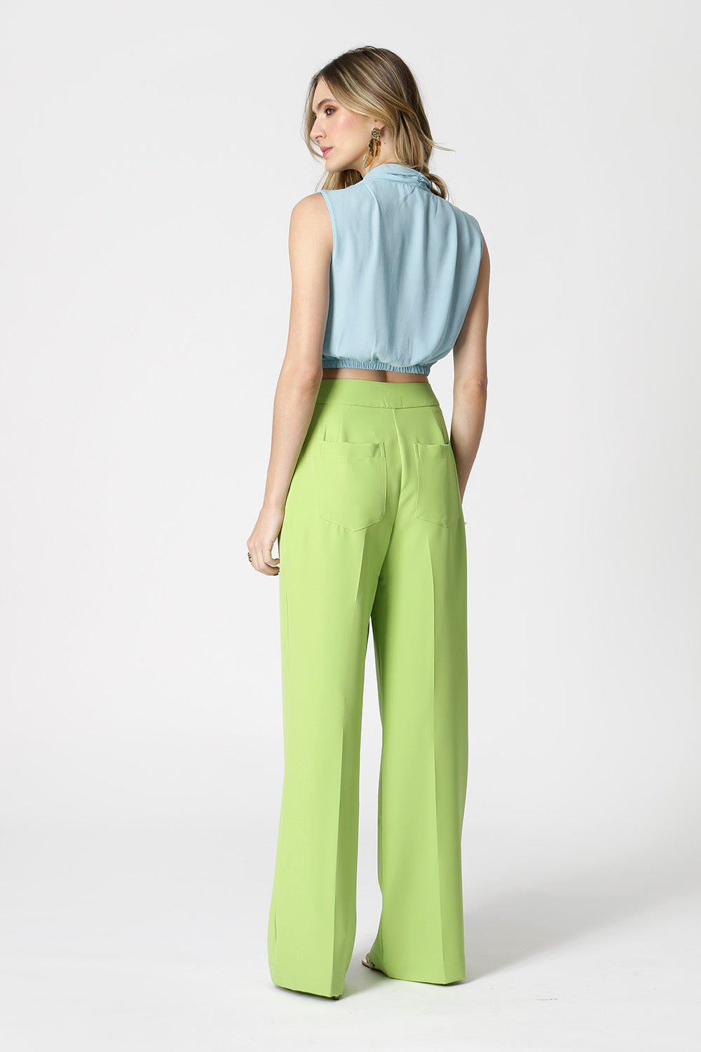 Blusa cropped transpassada e com elástico na barra. Uma peça confeccionada em tecido crepe fluído. Um modelo perfeito para mood work.