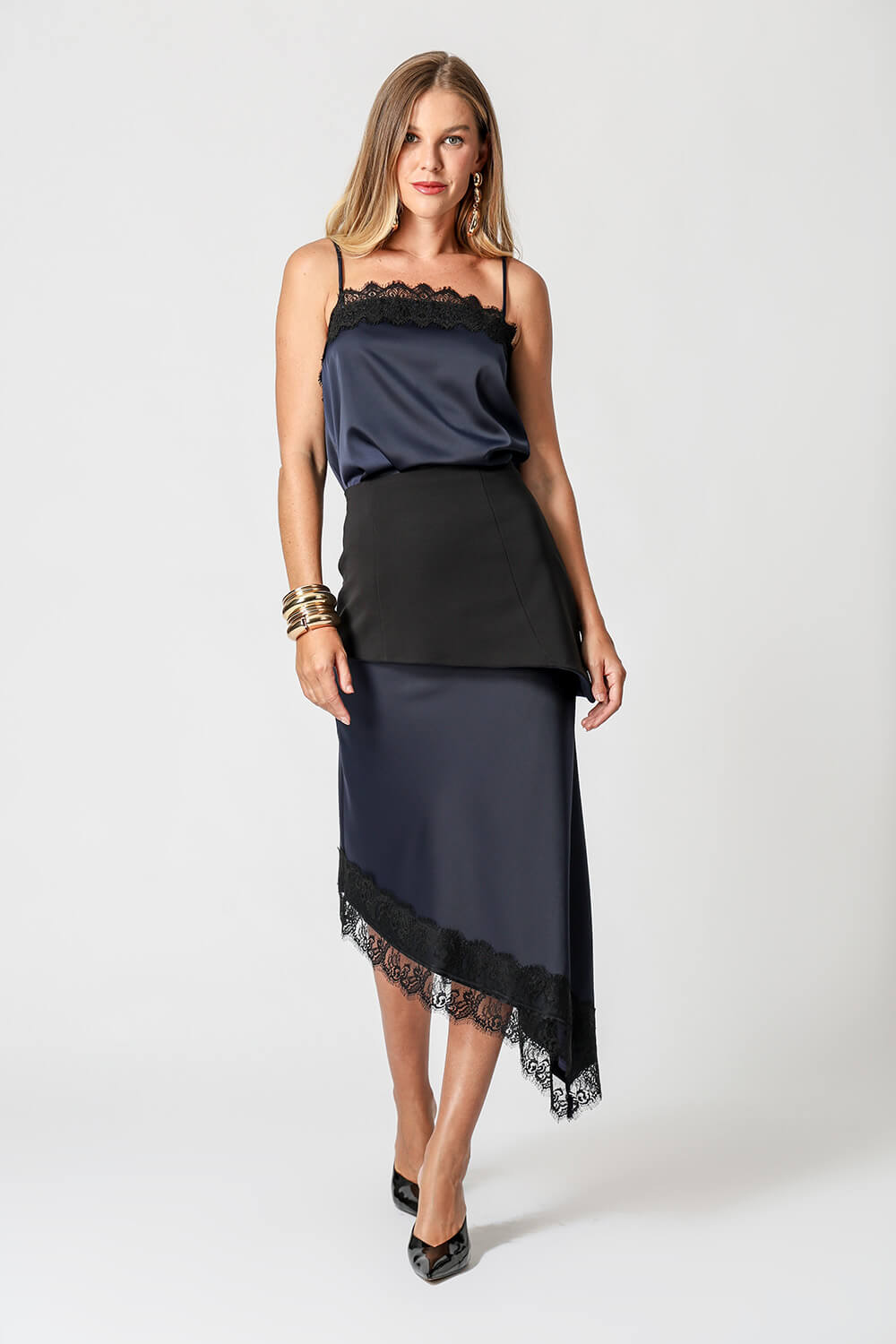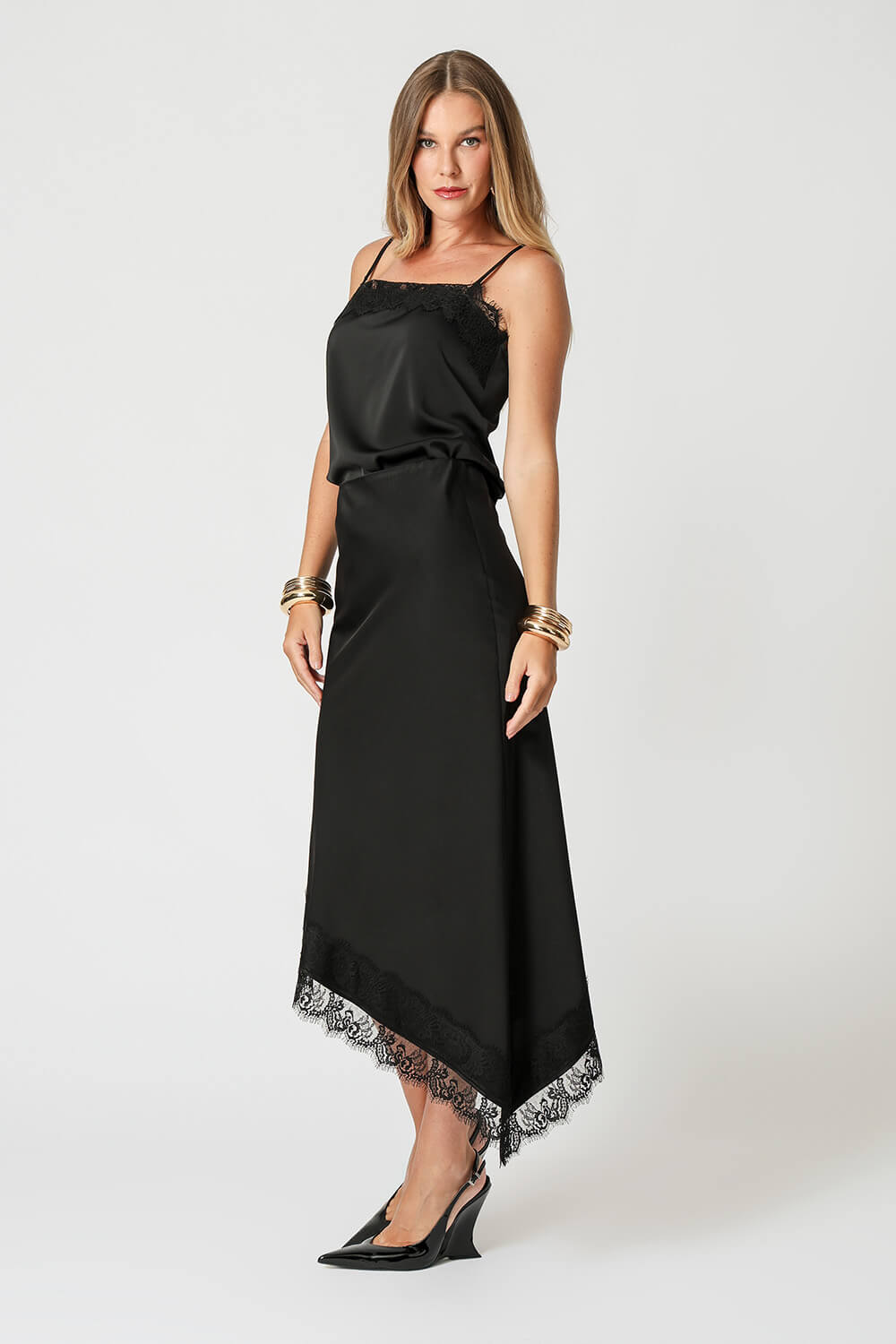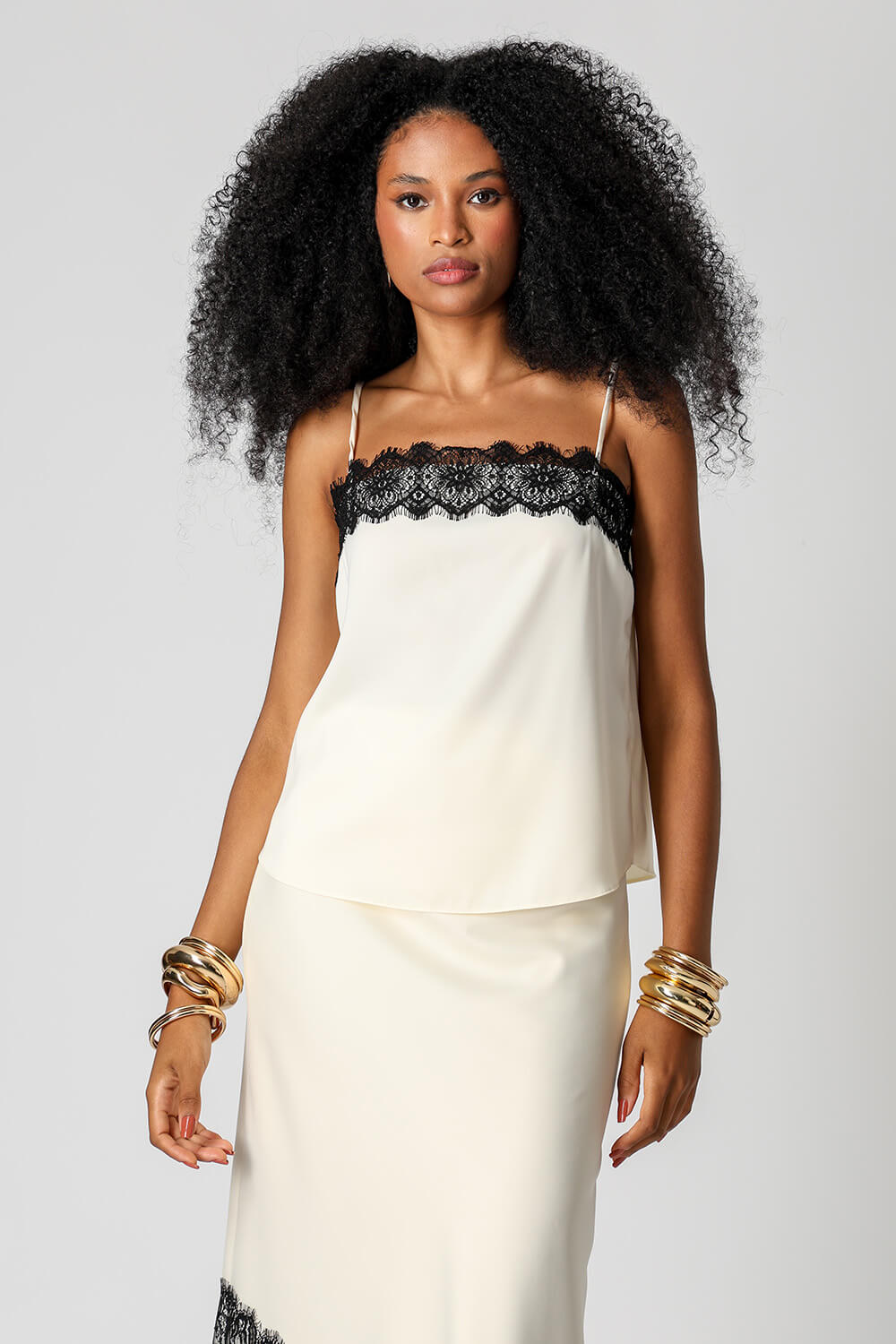 Blusa de cetim com alças finas e delicado detalhe em renda no decote. Peça leve, elegante e perfeita para compor looks sofisticados.