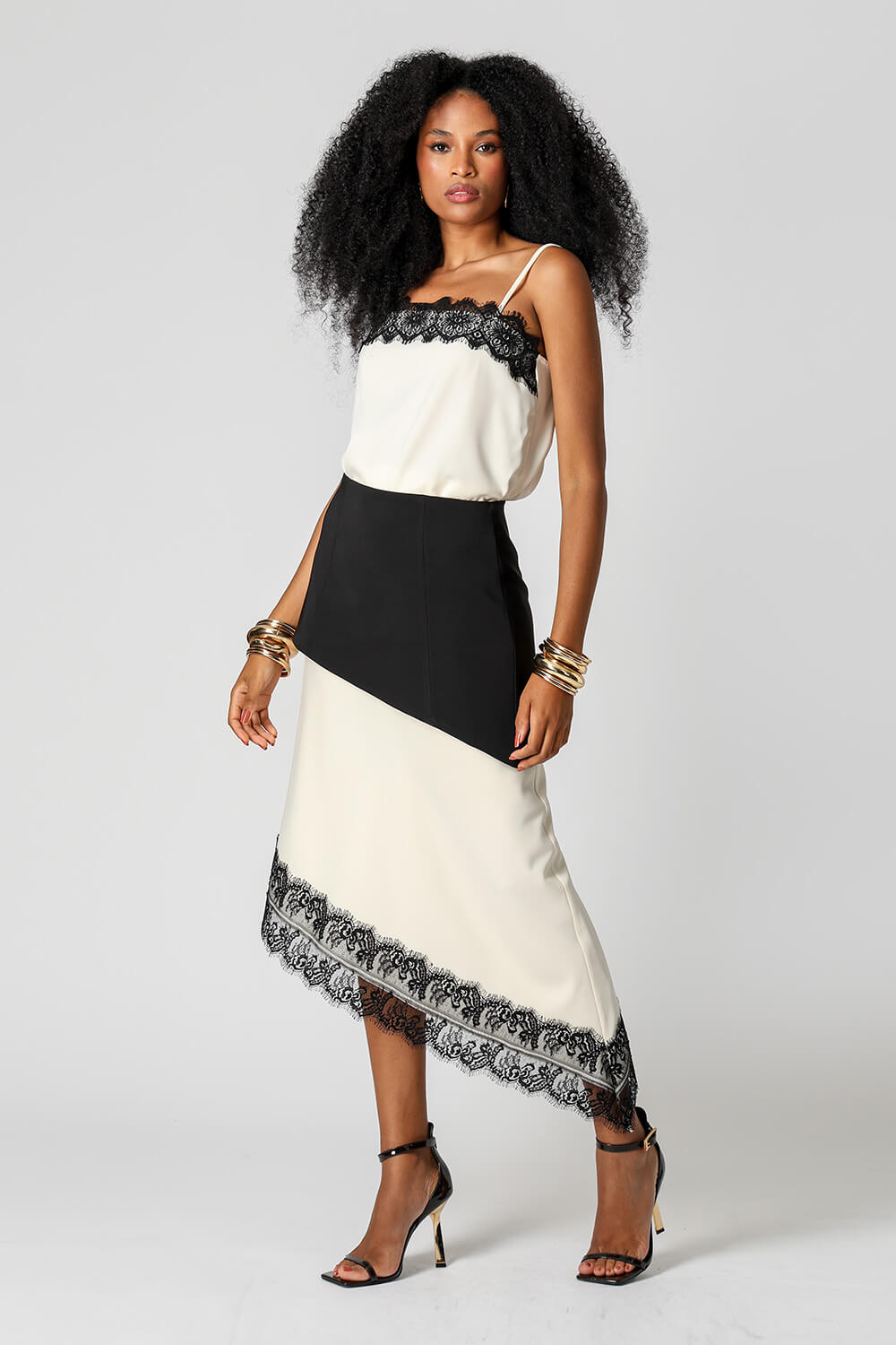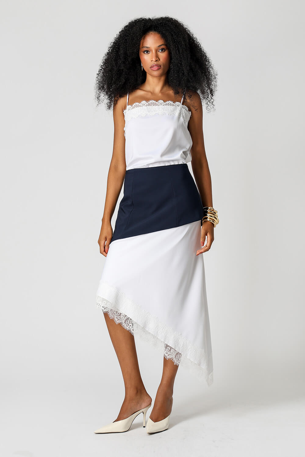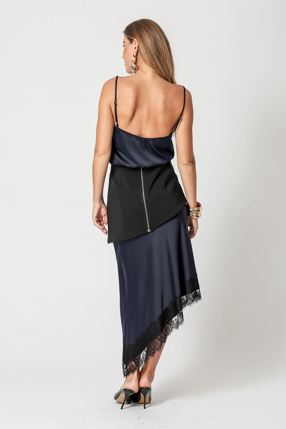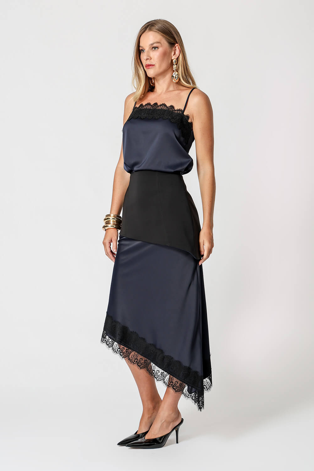 Blusa de cetim com alças finas e delicado detalhe em renda no decote. Peça leve, elegante e perfeita para compor looks sofisticados.