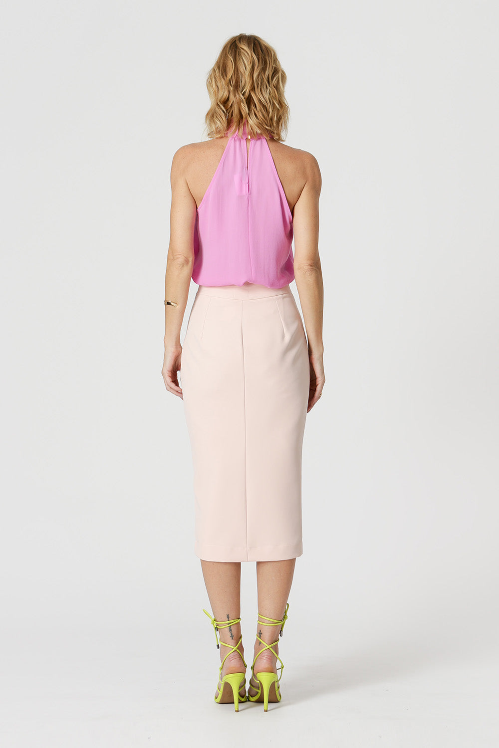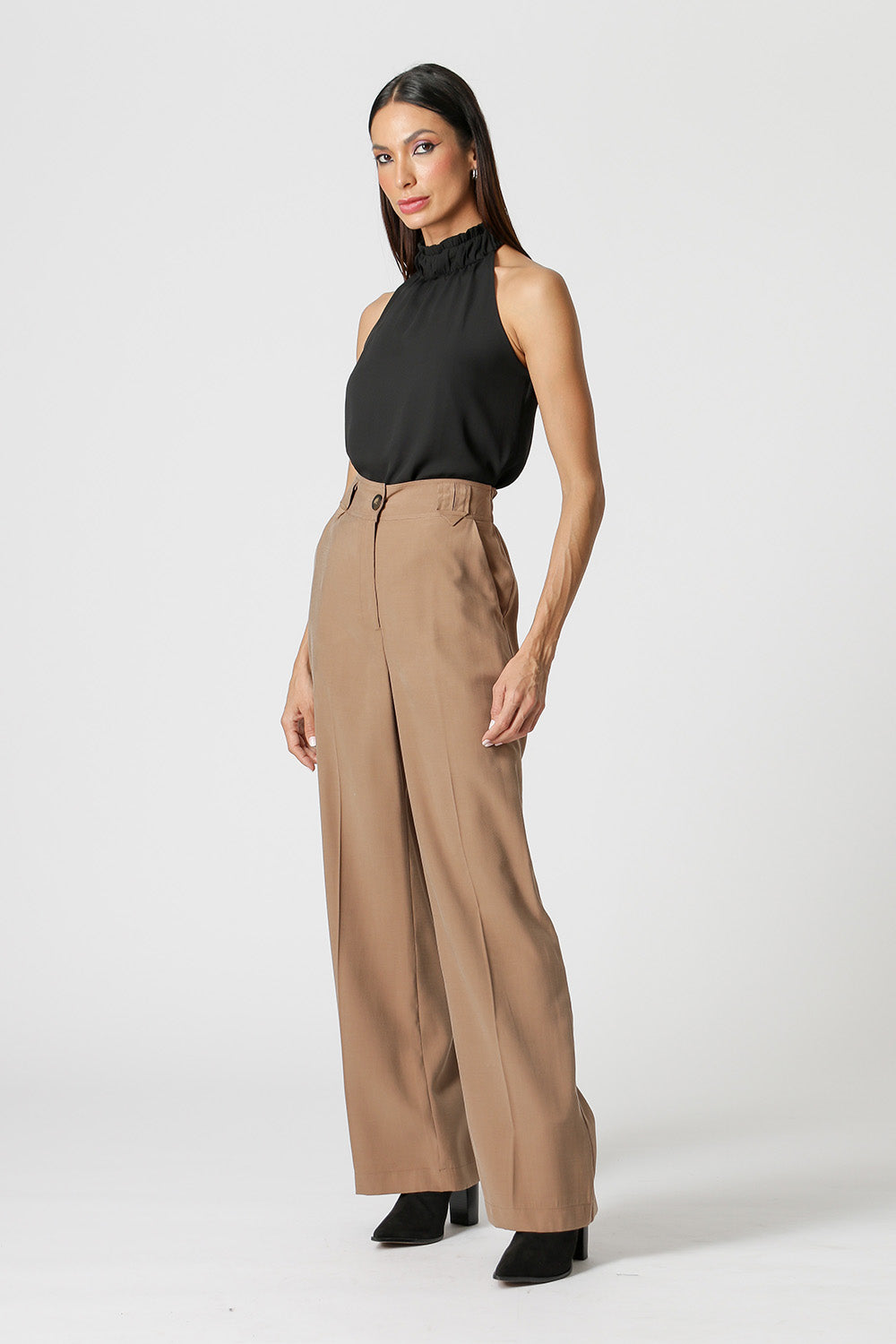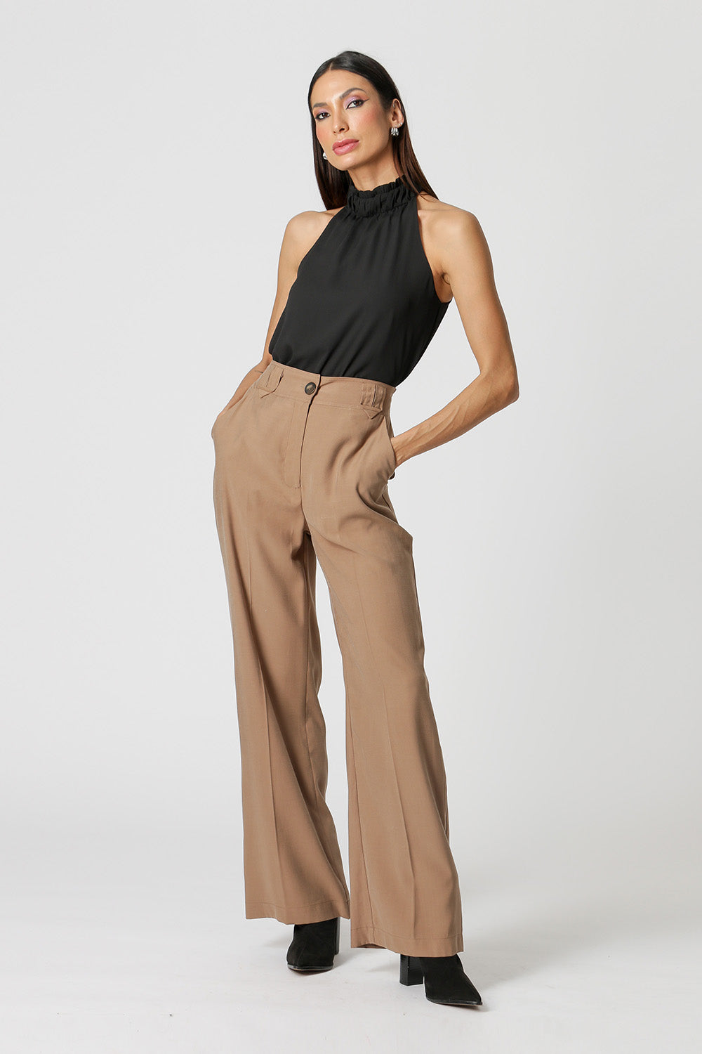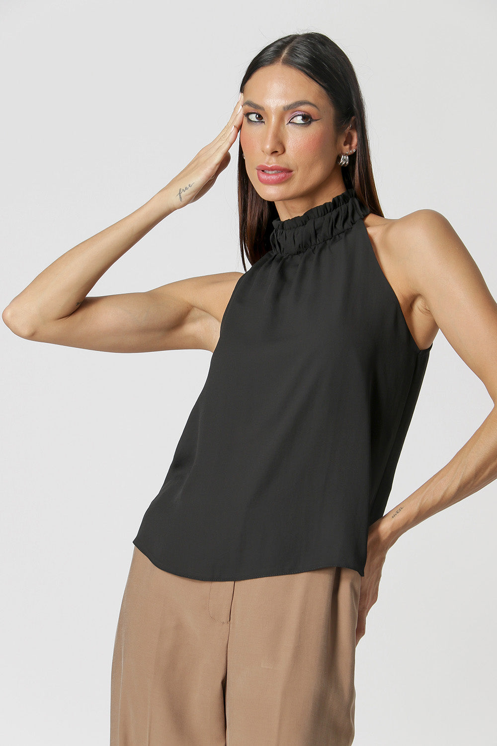 Blusa sem mangas com gola alta franzida e abertura na nuca. Peça com toque fashionista, para você arrasar nas suas produções.