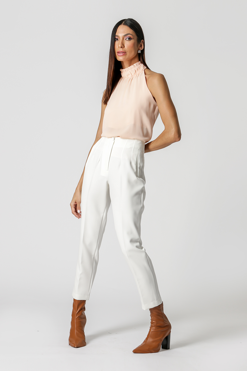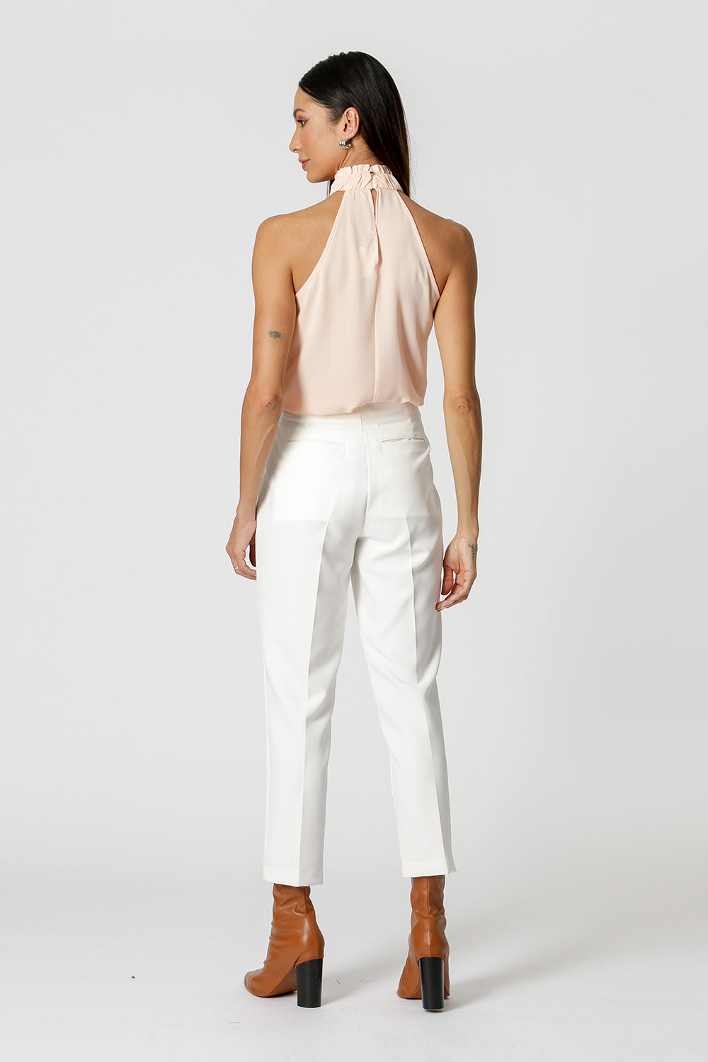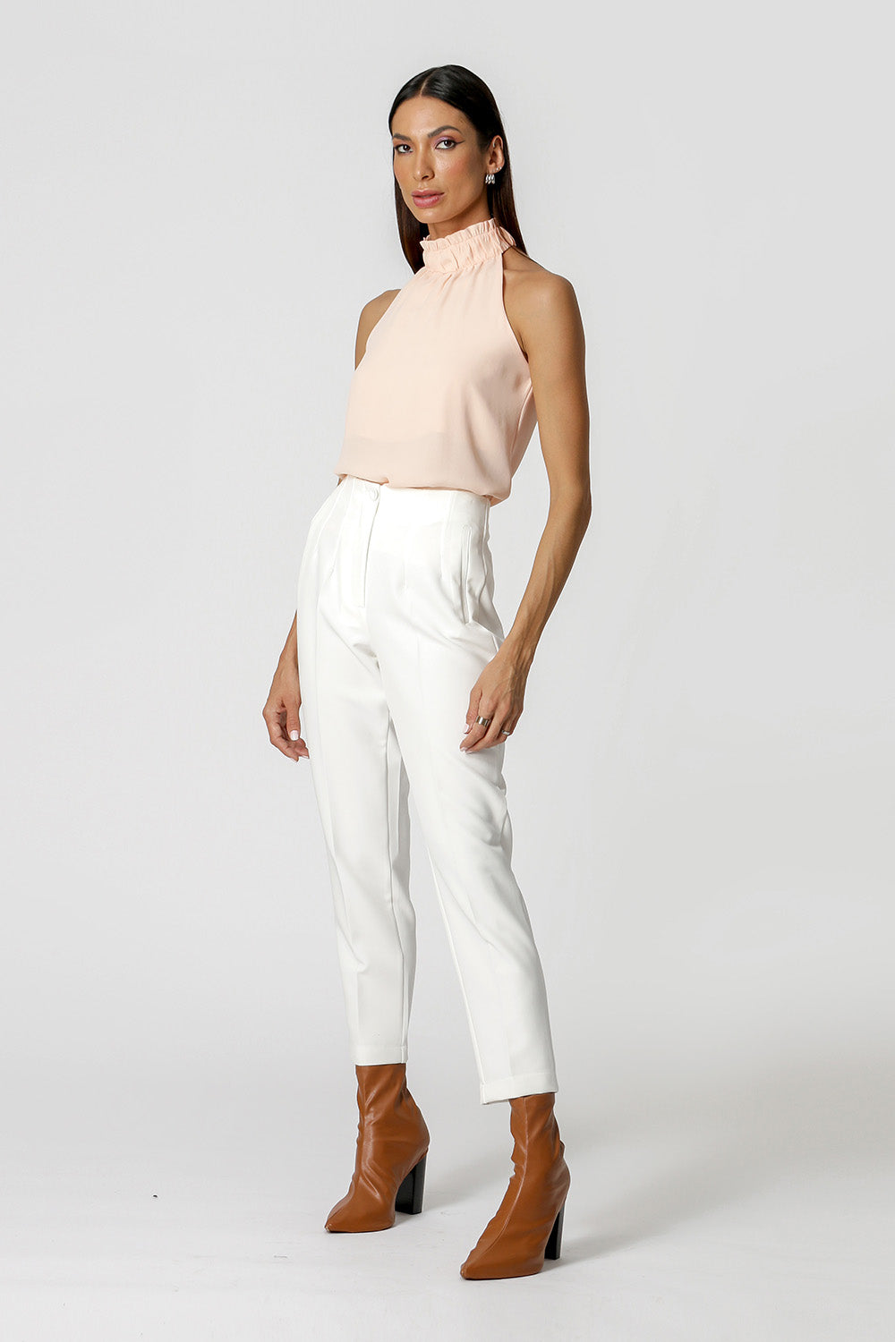 Blusa sin mangas con cuello alto fruncido y abertura en la nuca. Una pieza con un toque fashionista para que puedas lucir tus looks.