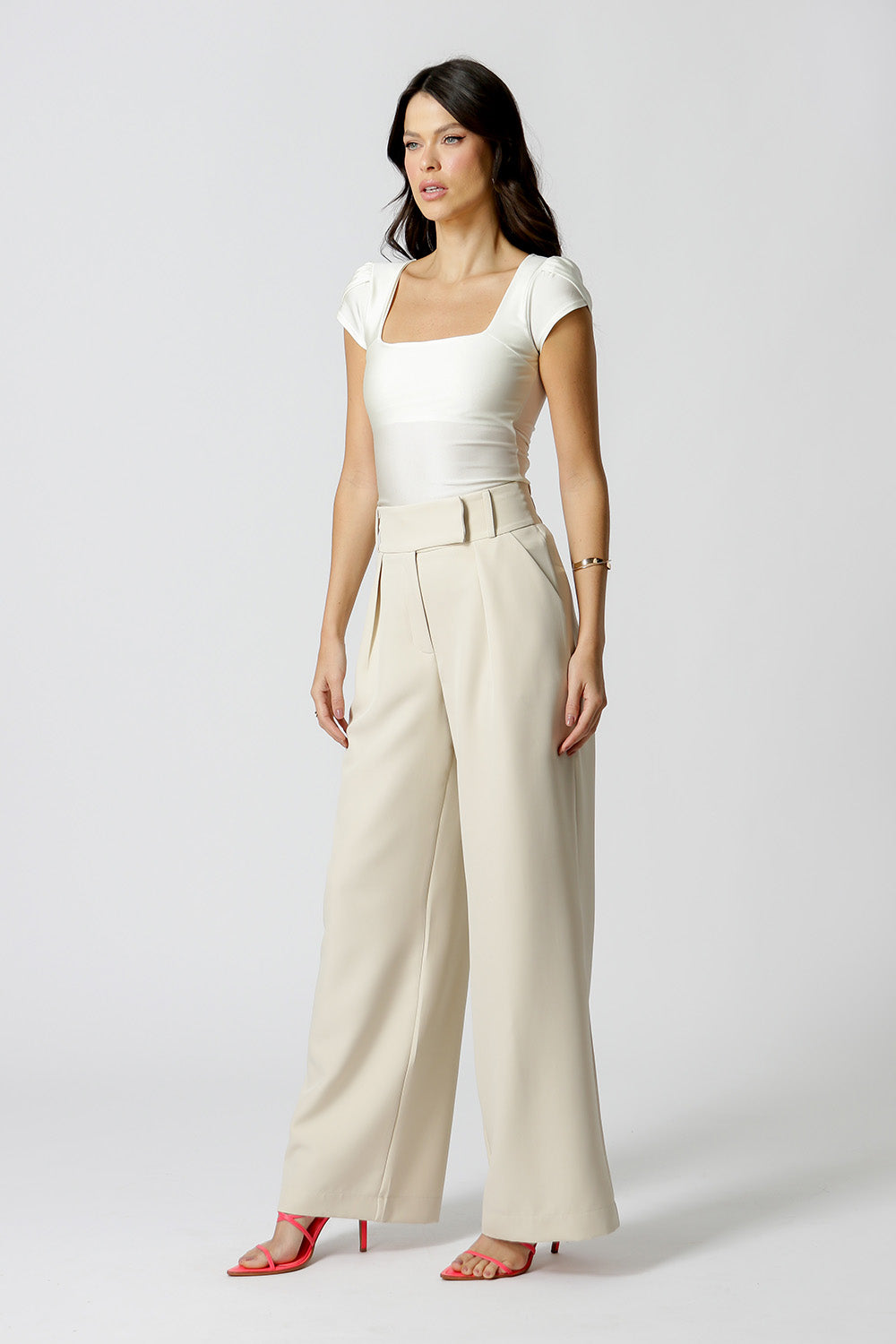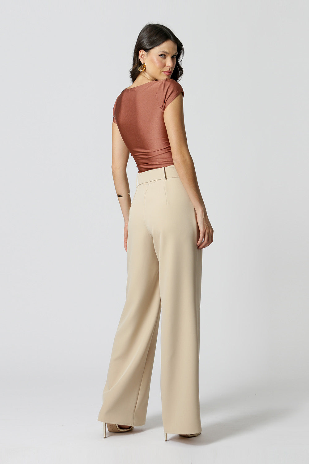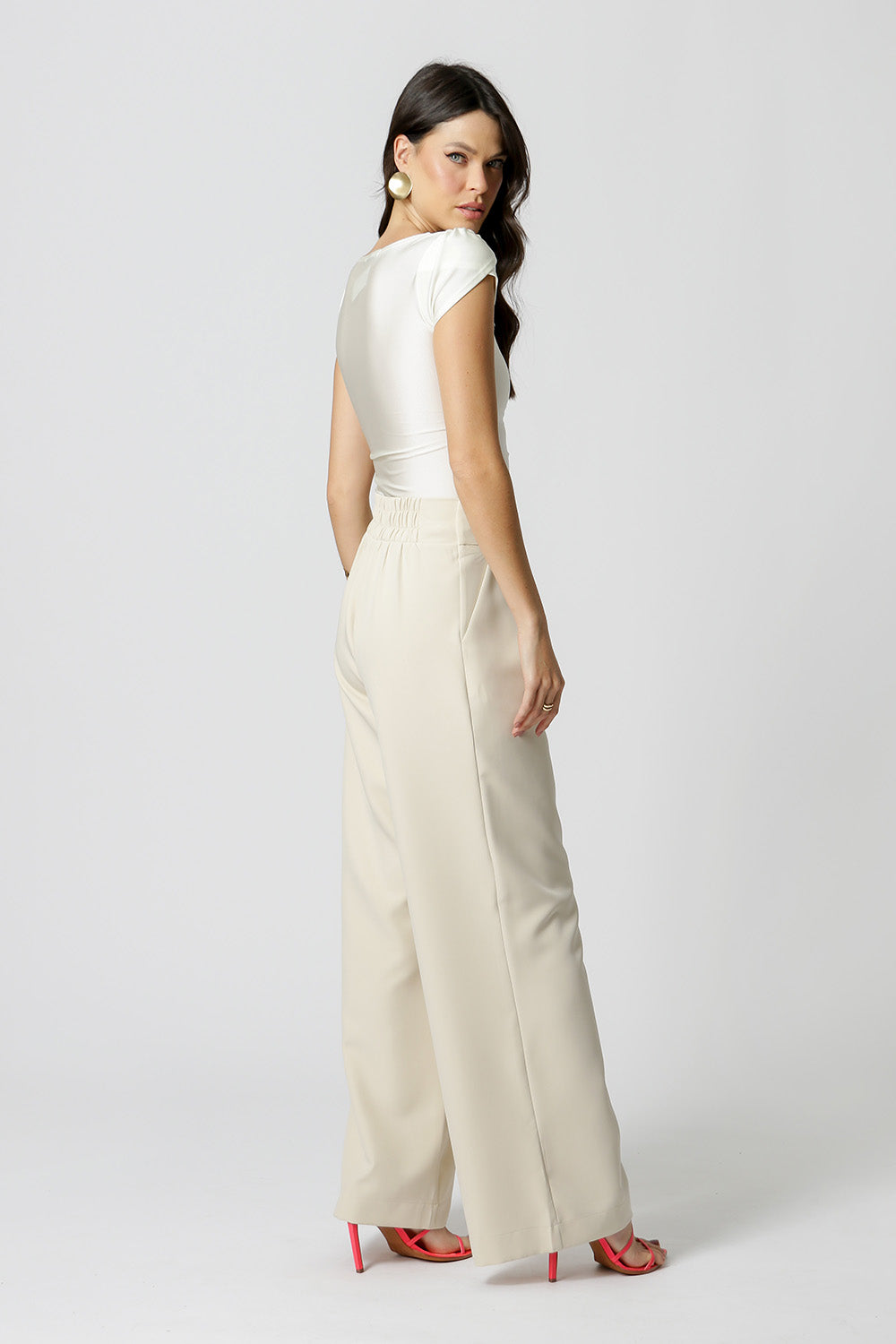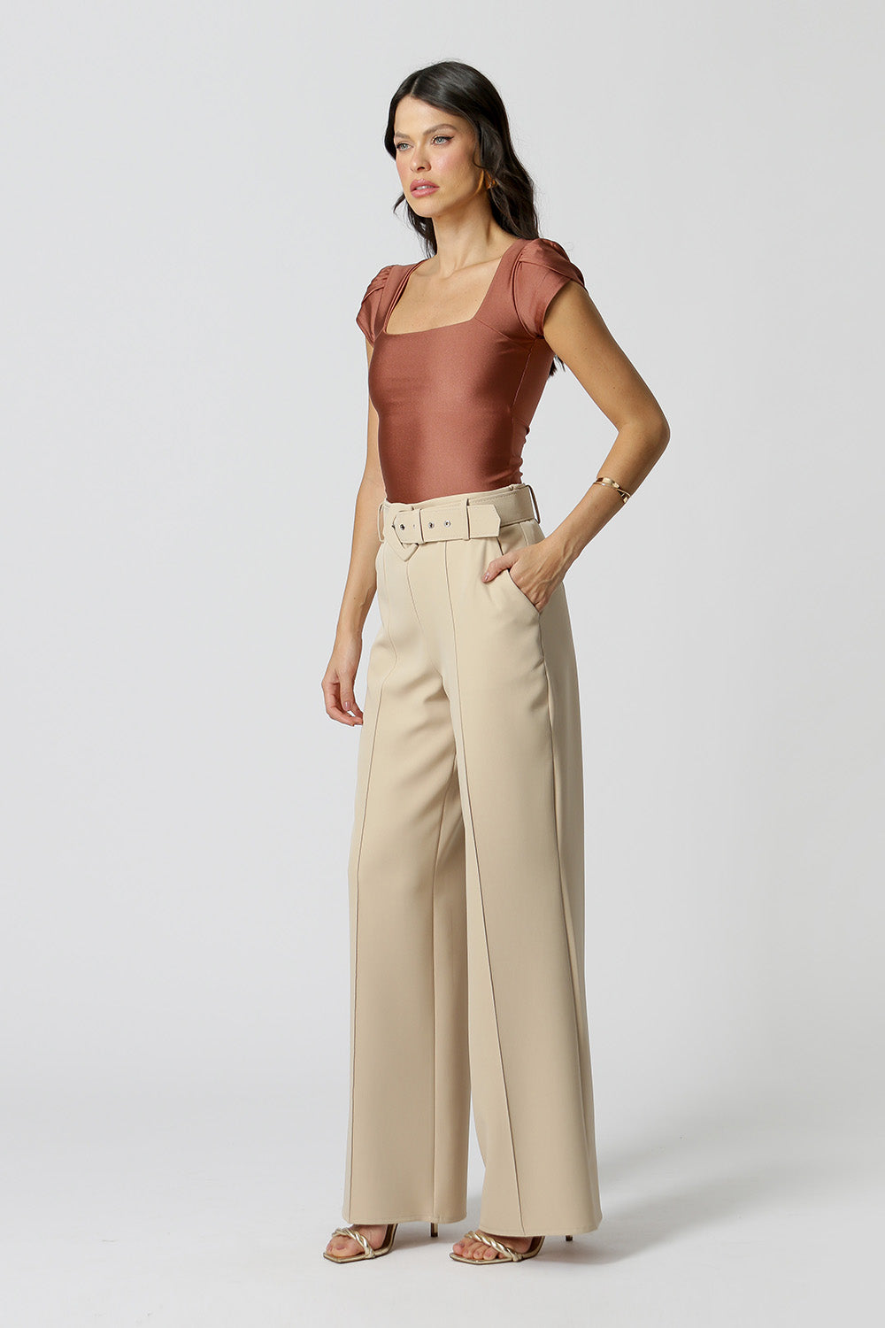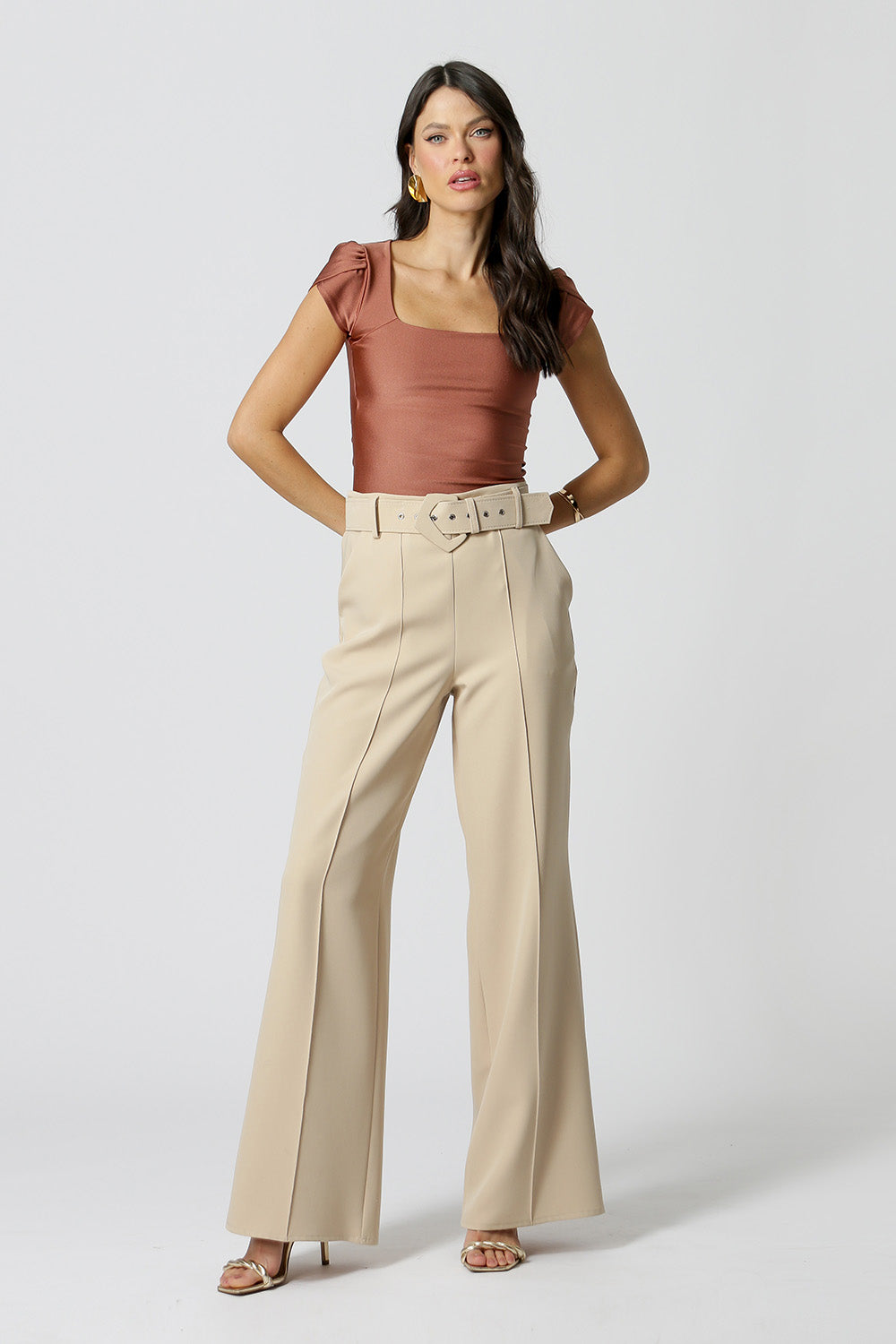 Blusa com manga tulipa, decote quadrado e detalhe de franzido no ombro. Peça confeccionada no tecido malha metalic.