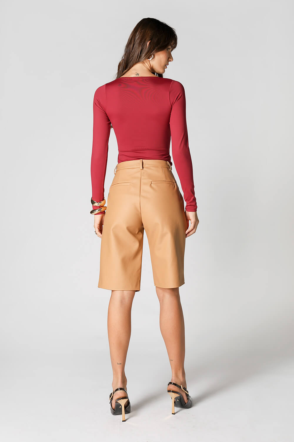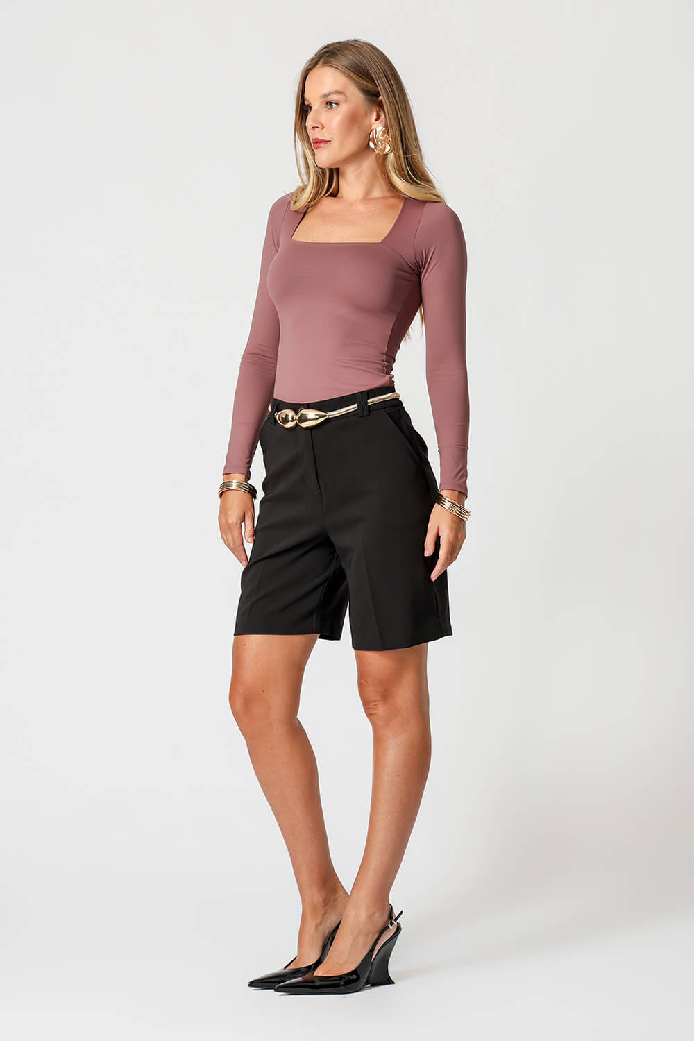 Blusa de manga longa com decote quadrado e recorte no ombro, que une sofisticação e estilo moderno, perfeita para quem busca um look elegante e original.