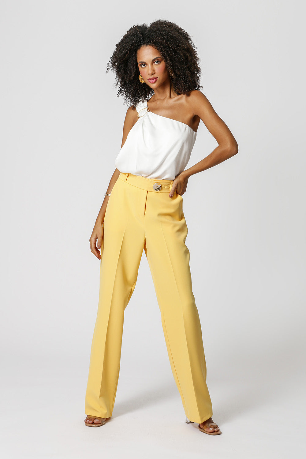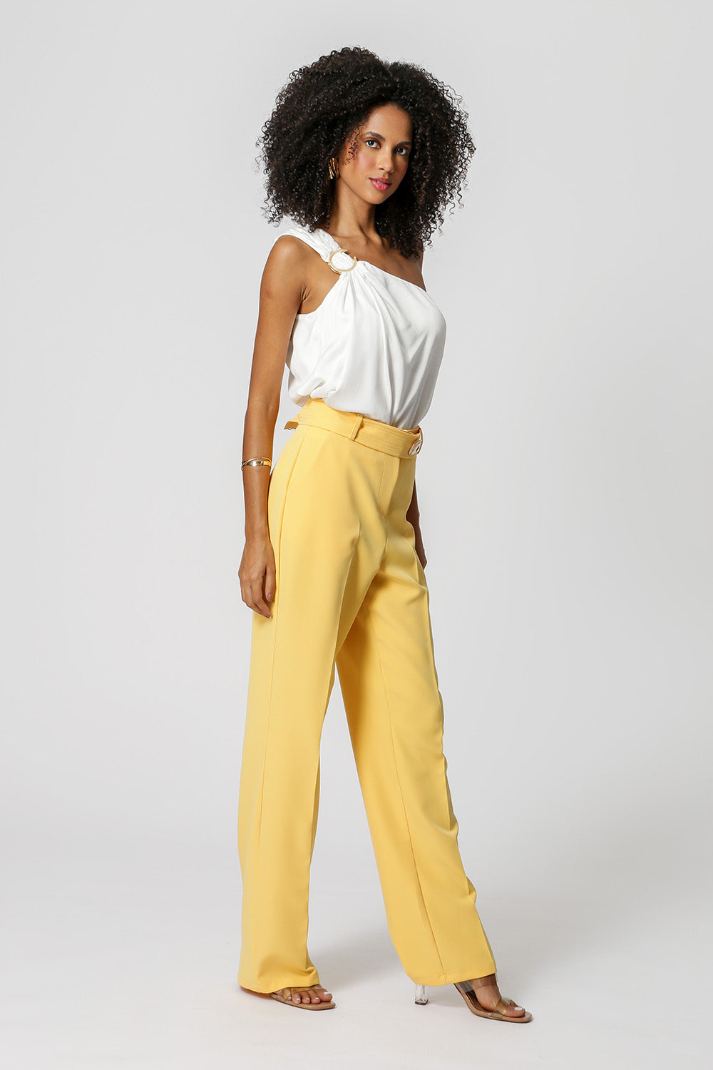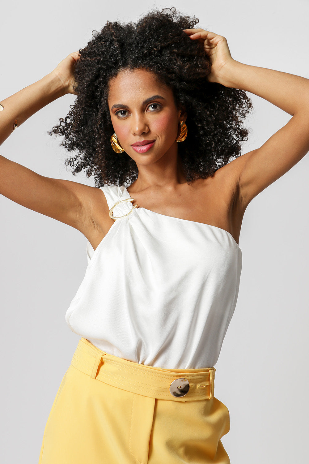 Blusa de un solo hombro con detalle de hebilla metálica. Pieza confeccionada en tejido fluido de viscosa. Un modelo elegante y ligero, perfecto para crear looks casuales para el día a día.