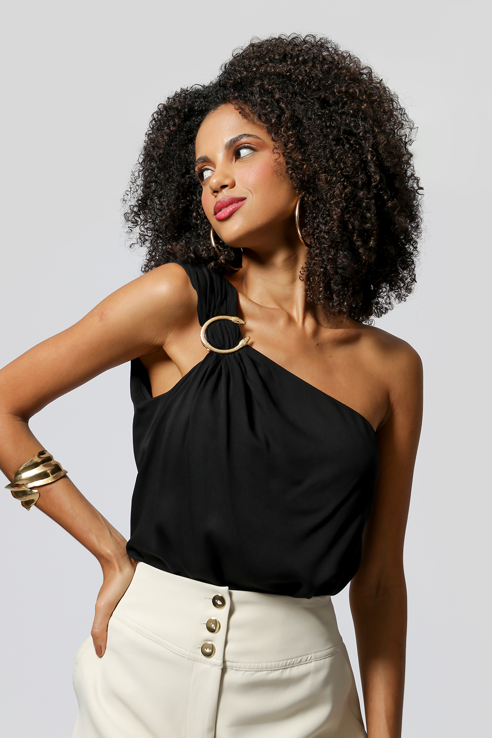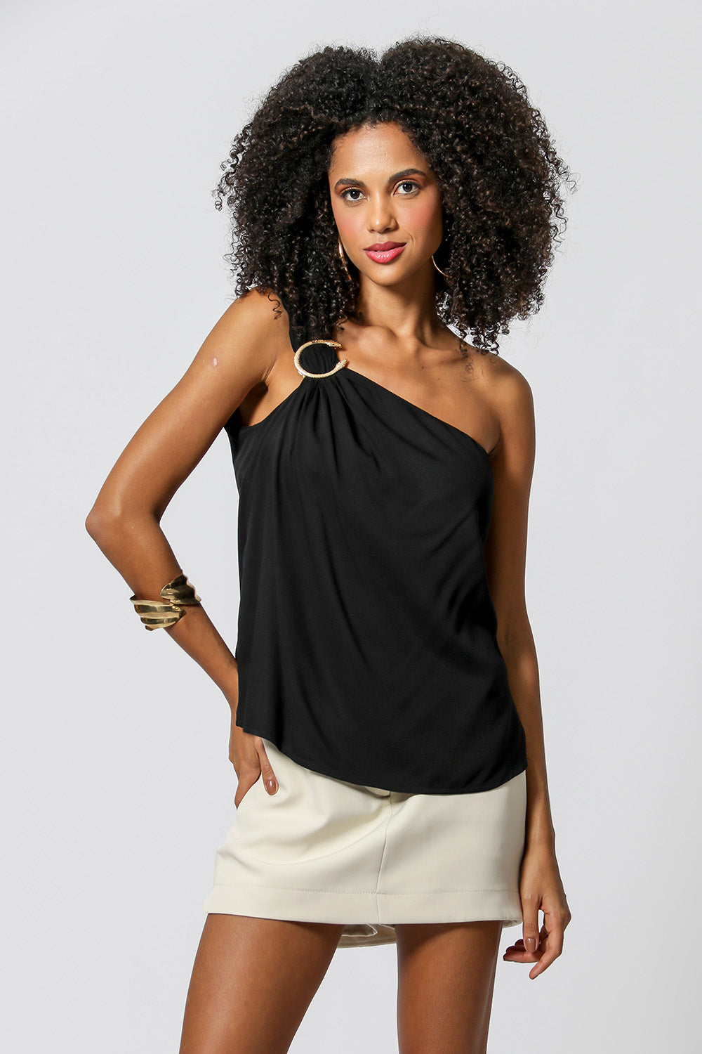 Blusa de un solo hombro con detalle de hebilla metálica. Pieza confeccionada en tejido fluido de viscosa. Un modelo elegante y ligero, perfecto para crear looks casuales para el día a día.