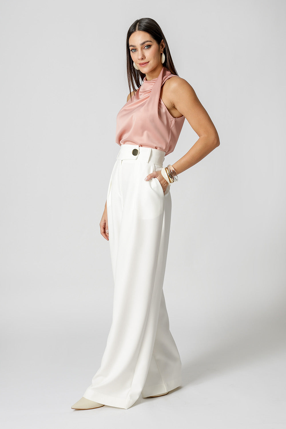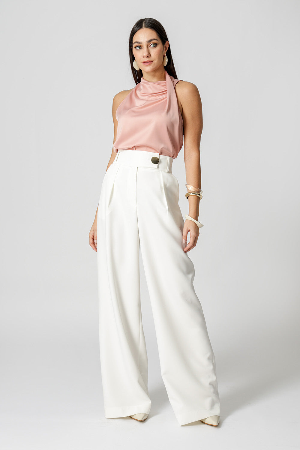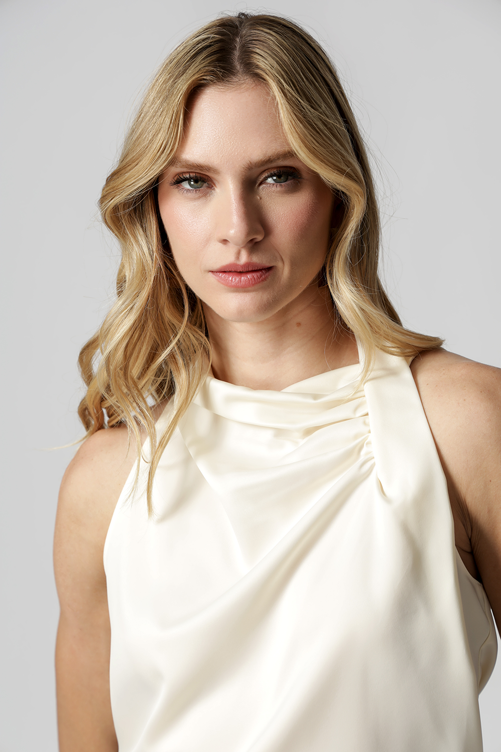 Blusa em cetim com decote drapeado com pregas sobrepostas, que adiciona elegância e sofisticação ao look. Tecido leve, com brilho sutil e toque macio. Ideal para composições modernas e versáteis.