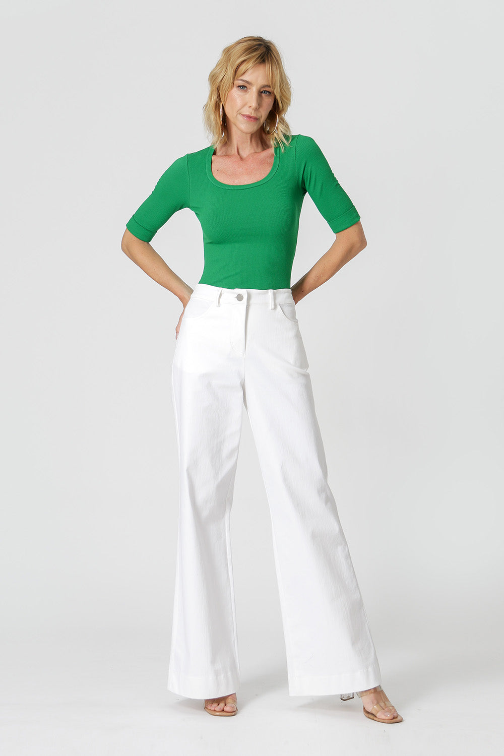 Blusa con mangas midi y detalle plisado en la manga, una pieza con escote lágrima que realza el busto femenino, confeccionada en punto canalé fino, atemporal y muy práctica para el día a día.