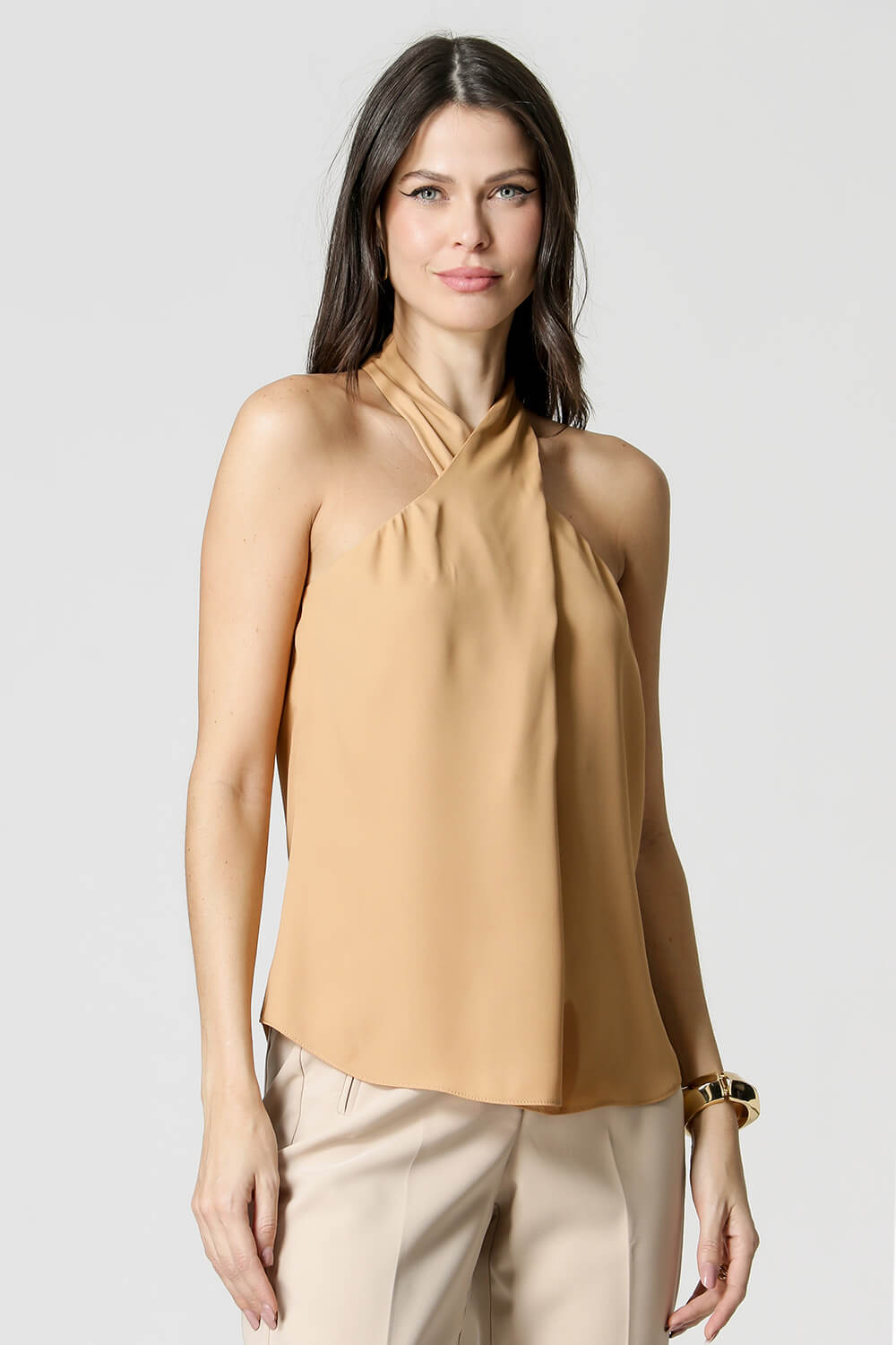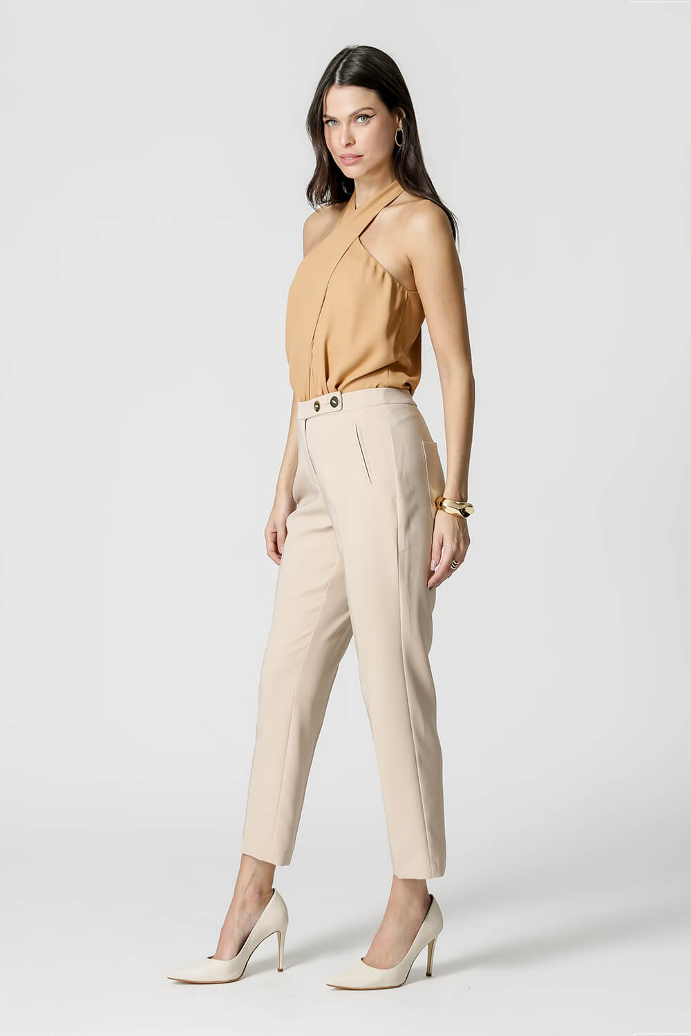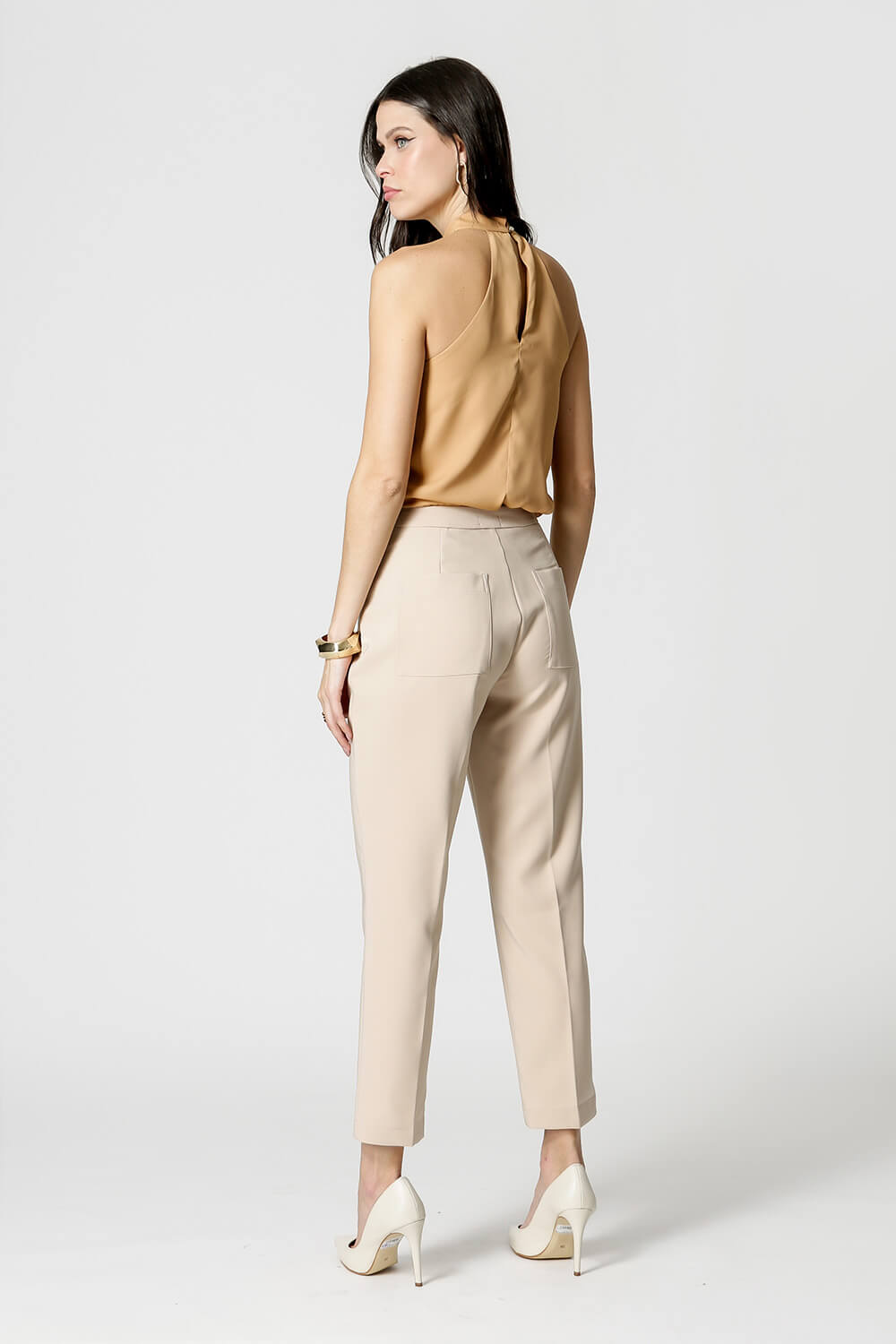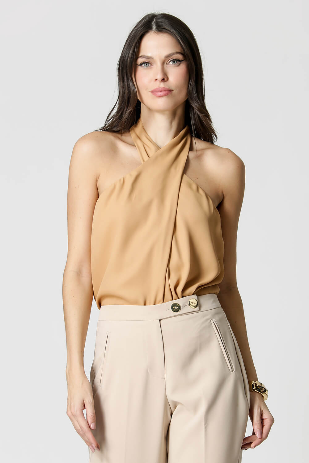 Blusa con escote cruzado y botones en la espalda. Fabricado en tejido crepé de flujo ligero. Un modelo de corte holgado, cómodo para un ambiente laboral.
