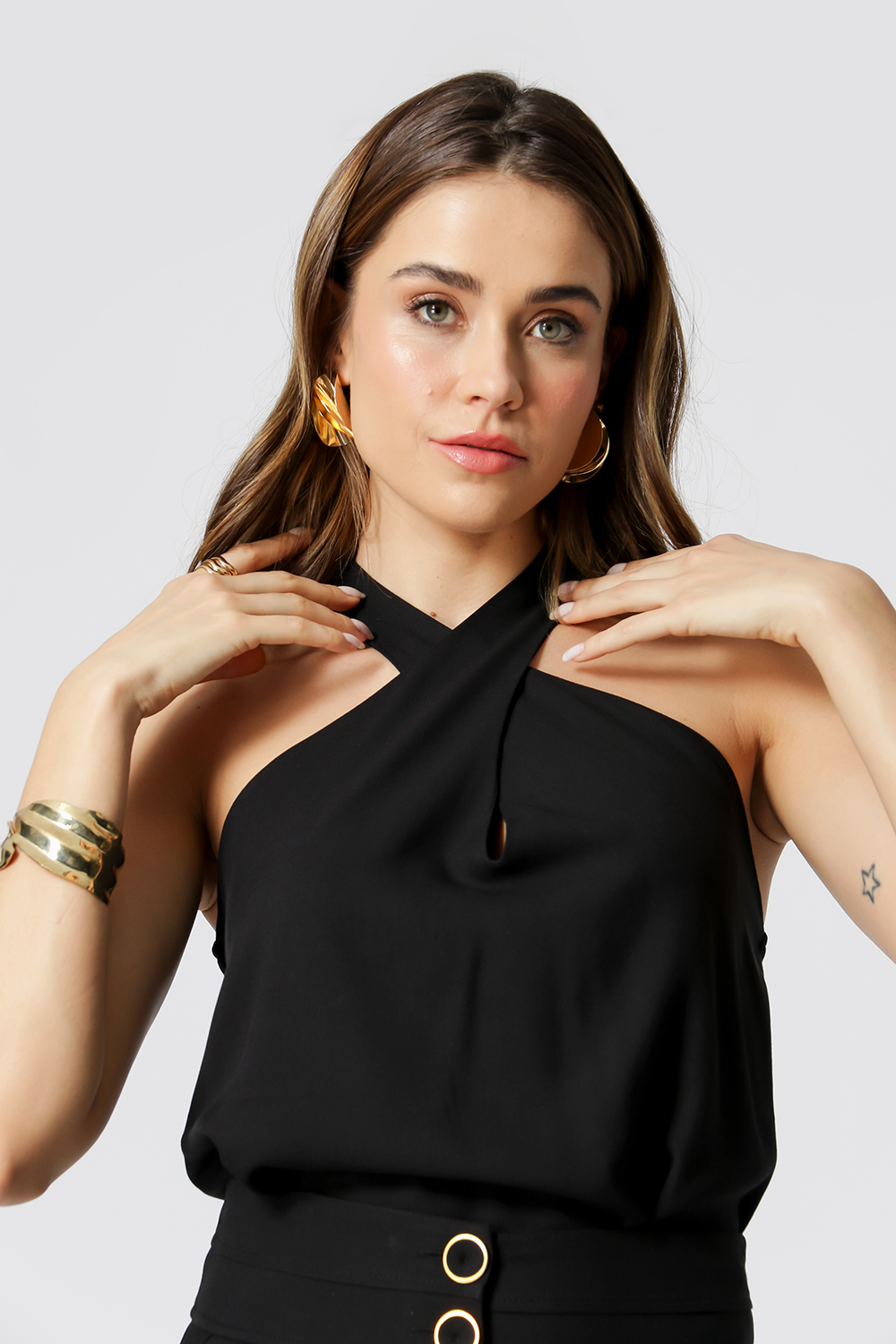 Blusa con escote cruzado y botones metálicos en la espalda. Pieza confeccionada en tejido de viscosa de textura ligera. Un modelo con una forma más suelta y súper cómodo para un estado de ánimo de trabajo.