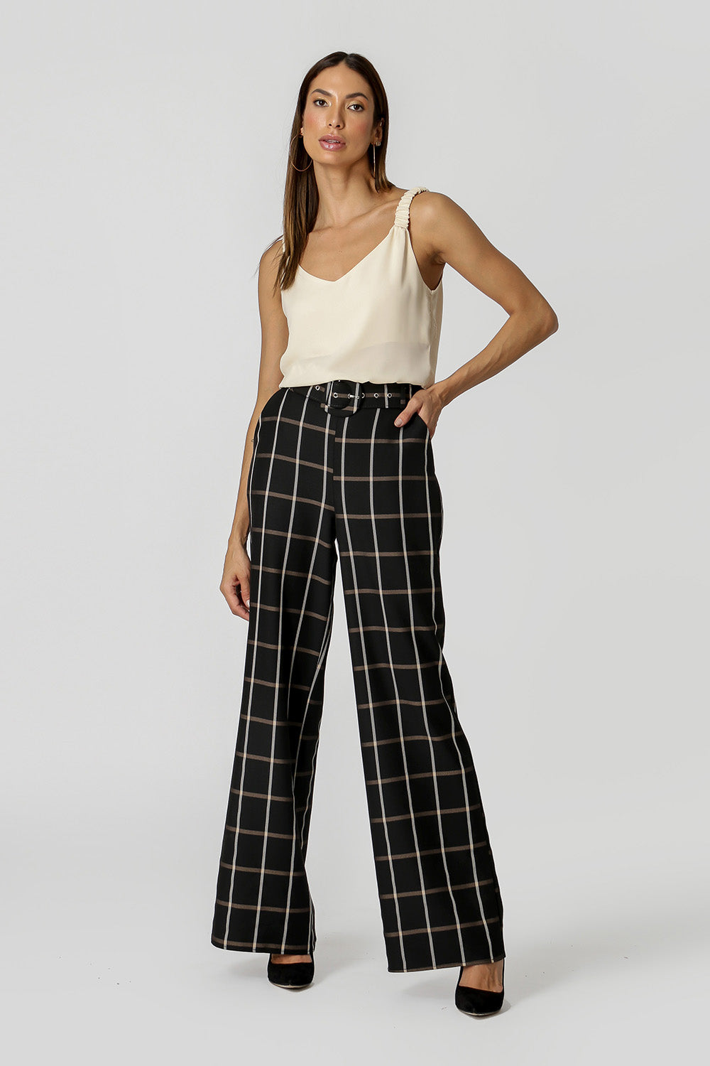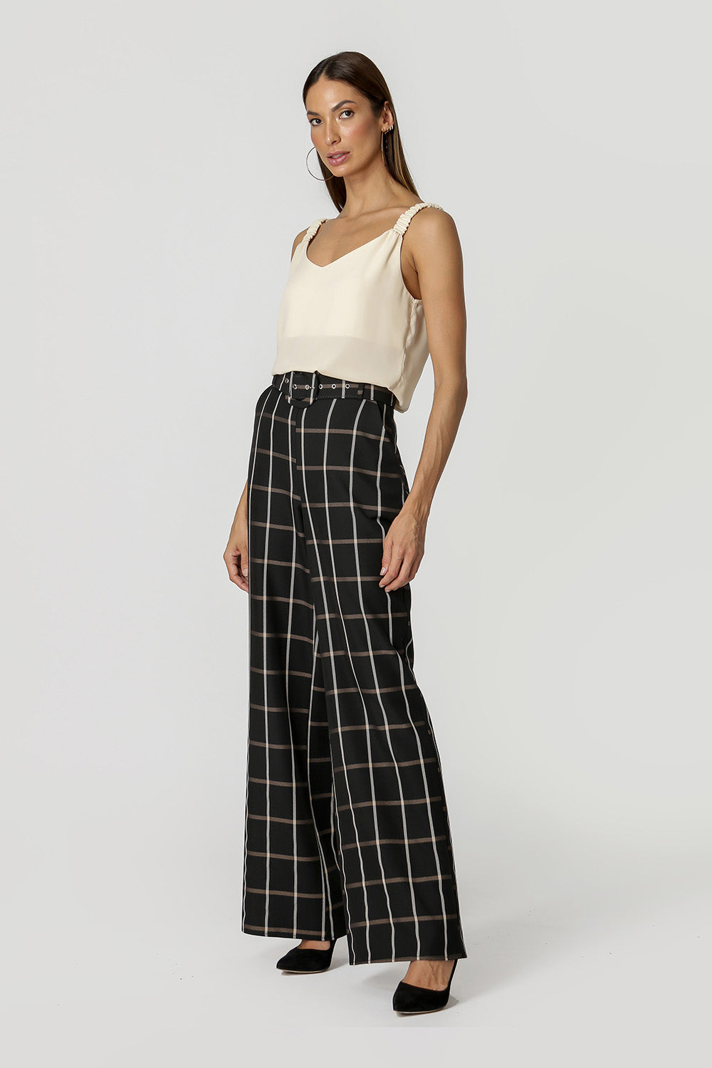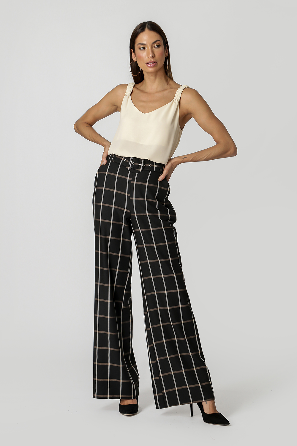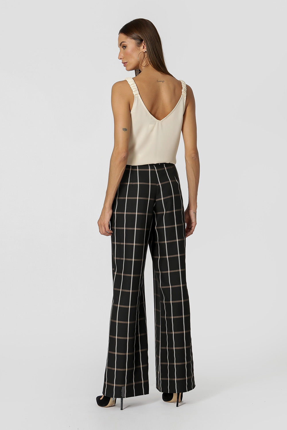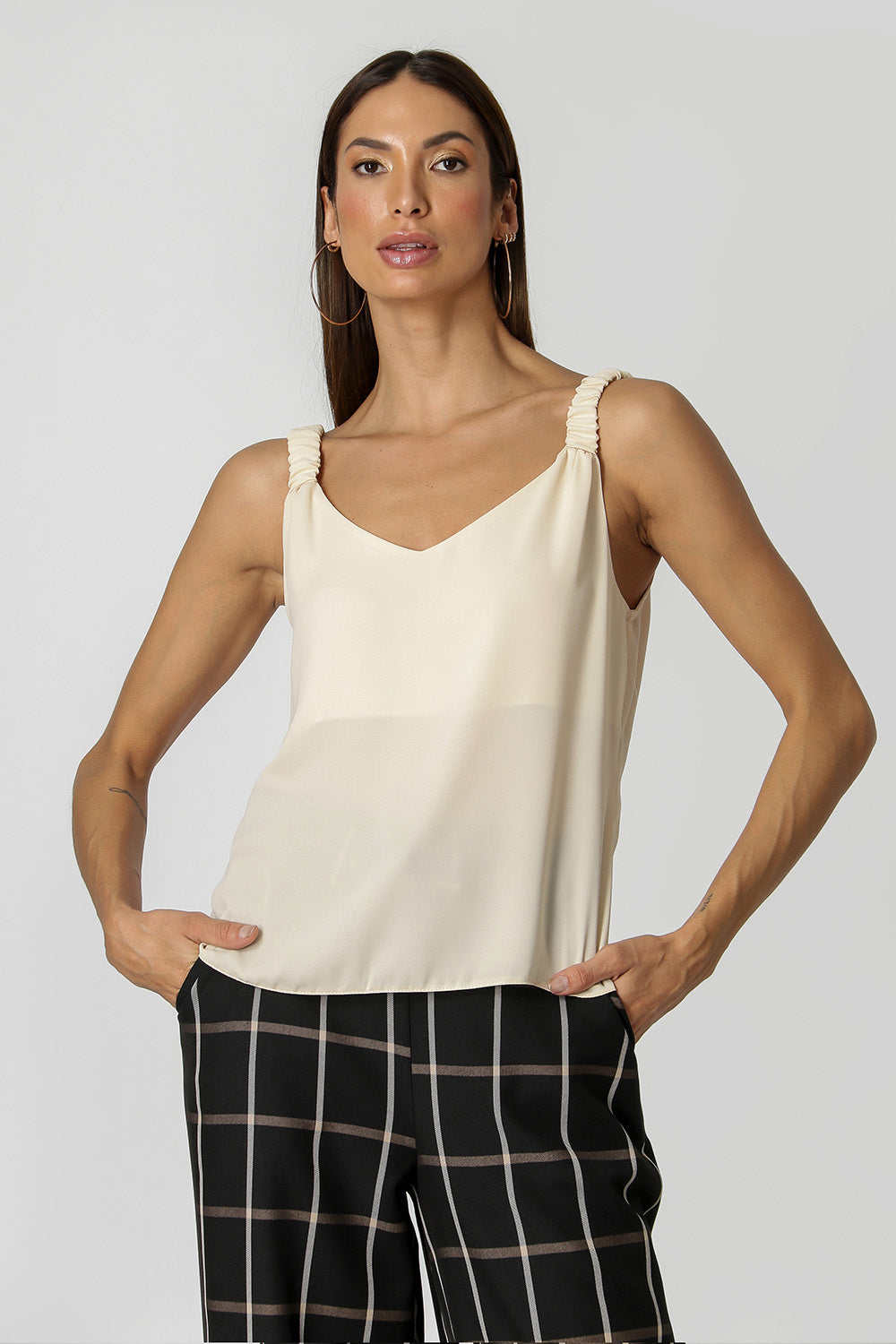 Camiseta de tirantes confeccionada en crepe fluido. Tiene tirantes anchos con elástico incorporado que crean varios frunces y un bonito escote en pico en la parte delantera y trasera. Una pieza no básica que faltaba en tu armario.