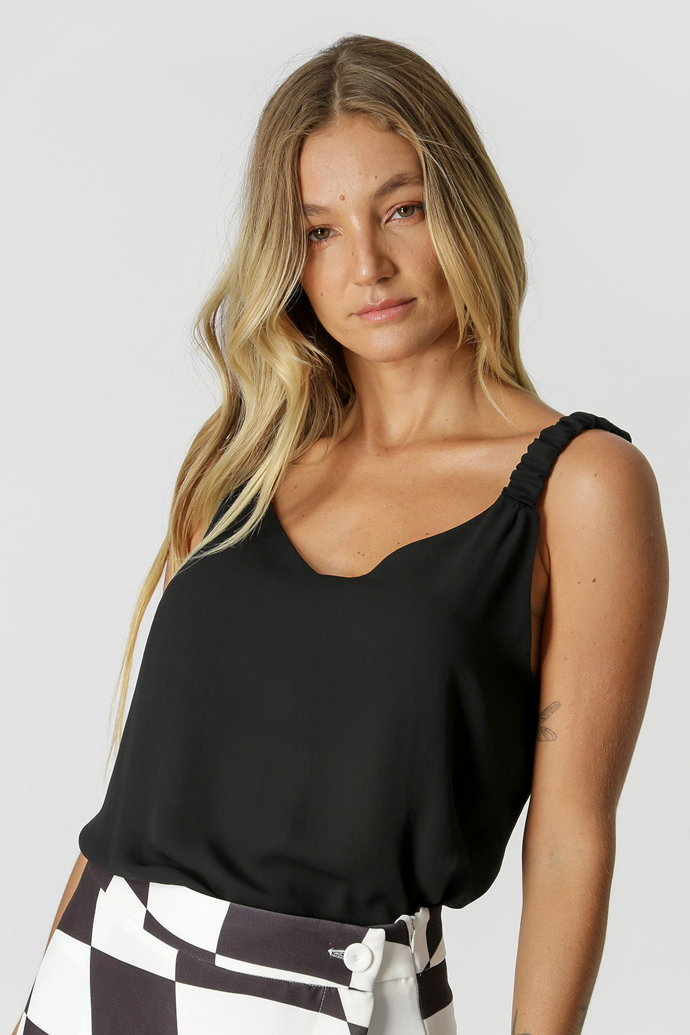 Camiseta de tirantes confeccionada en crepe fluido. Tiene tirantes anchos con elástico incorporado que crean varios frunces y un bonito escote en pico en la parte delantera y trasera. Una pieza no básica que faltaba en tu armario.