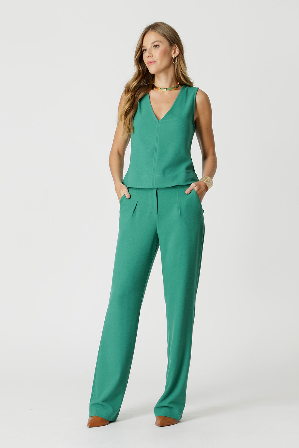 Blusa sin mangas escote en pico, pieza confeccionada con tejido ligero y muy cómodo, aportando una pieza ideal para componer un look de trabajo.