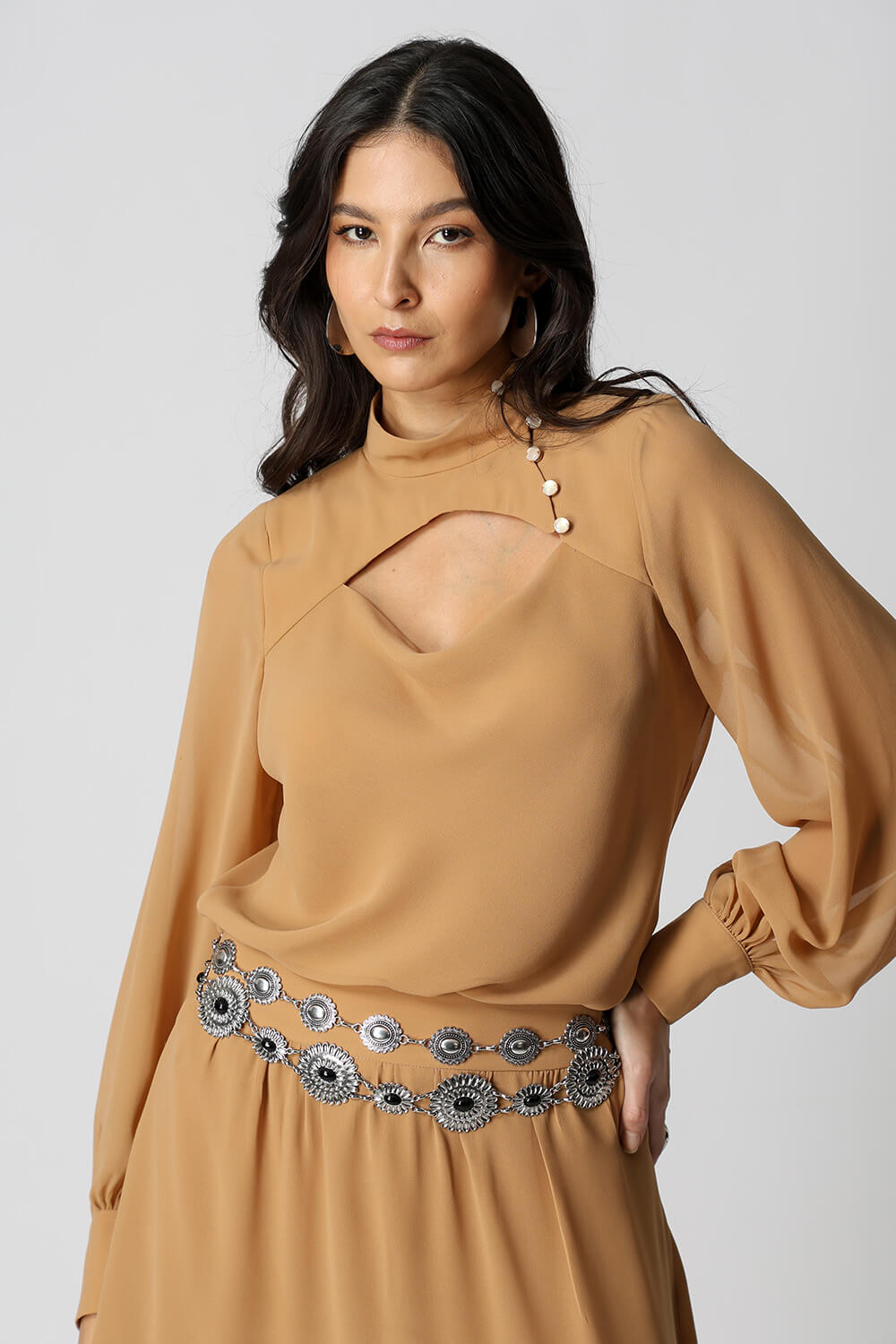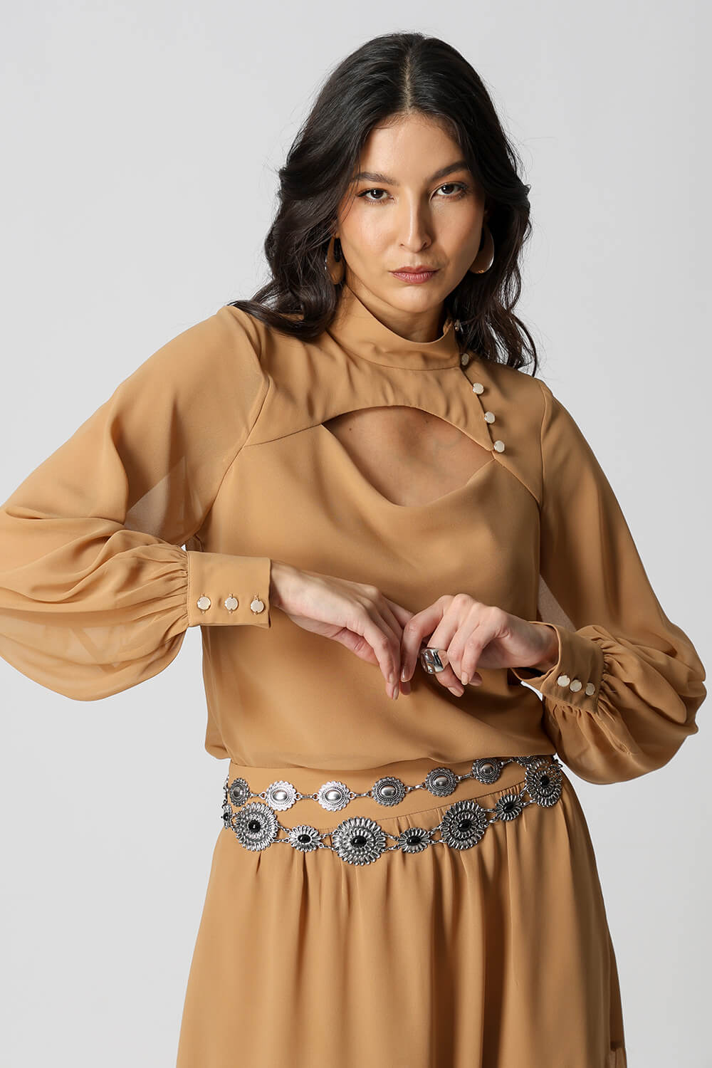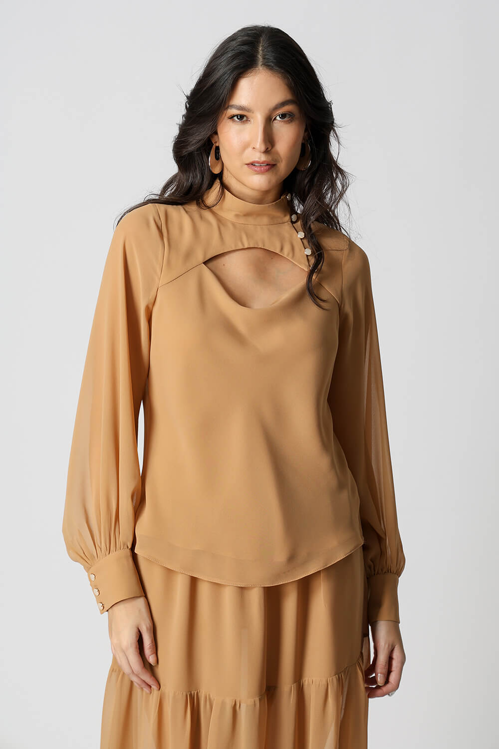 Blusa com caimento leve e toque sofisticado, possui mangas longas bufantes com punhos ajustados por botão, que trazem volume na medida certa. O destaque fica por conta da abertura frontal degagê com botões, que adiciona um charme extra ao visual. Ideal para compor looks elegantes e versáteis, do dia a dia a ocasiões especiais.
