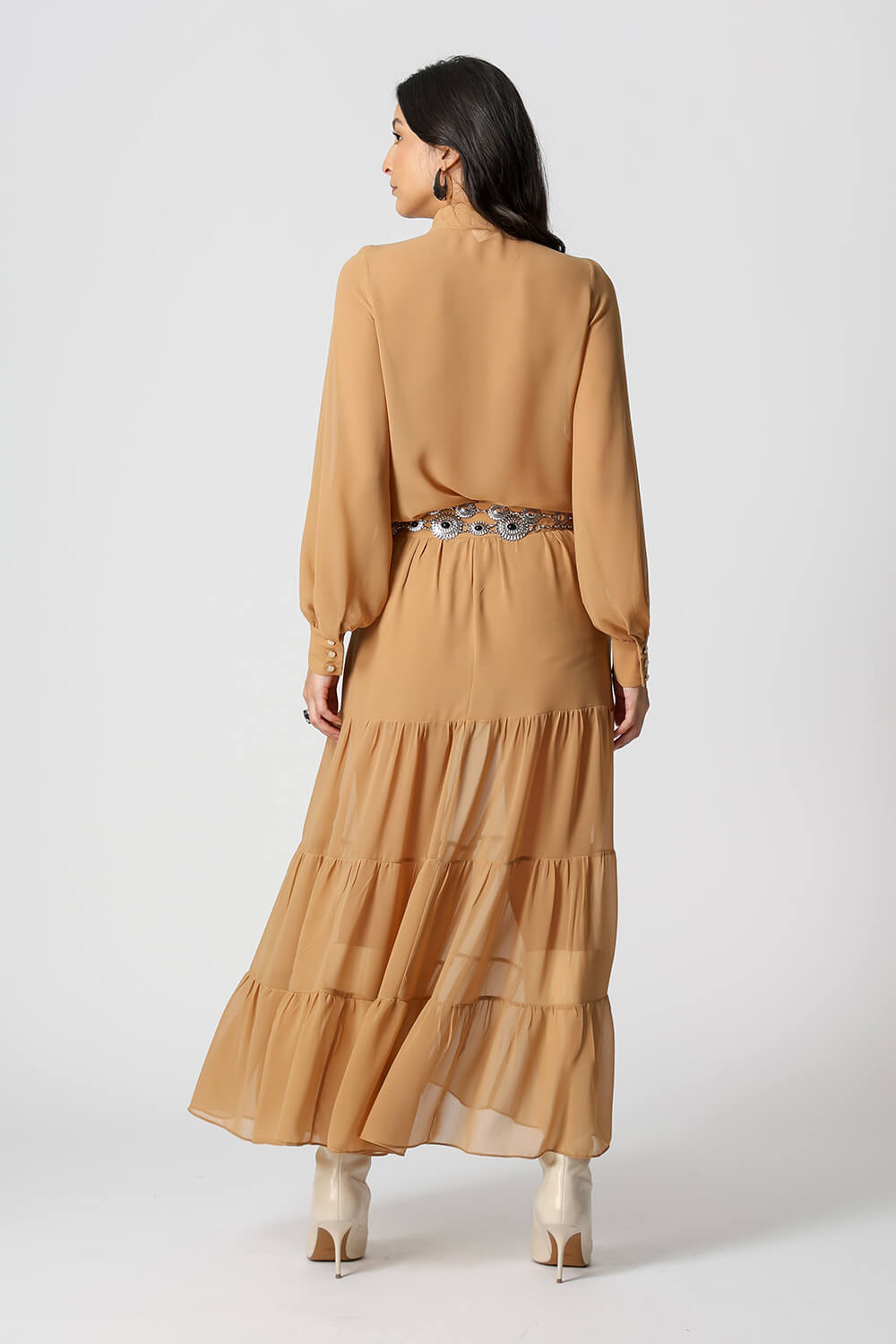 Detalhe de mangas bufantes com punho e botões