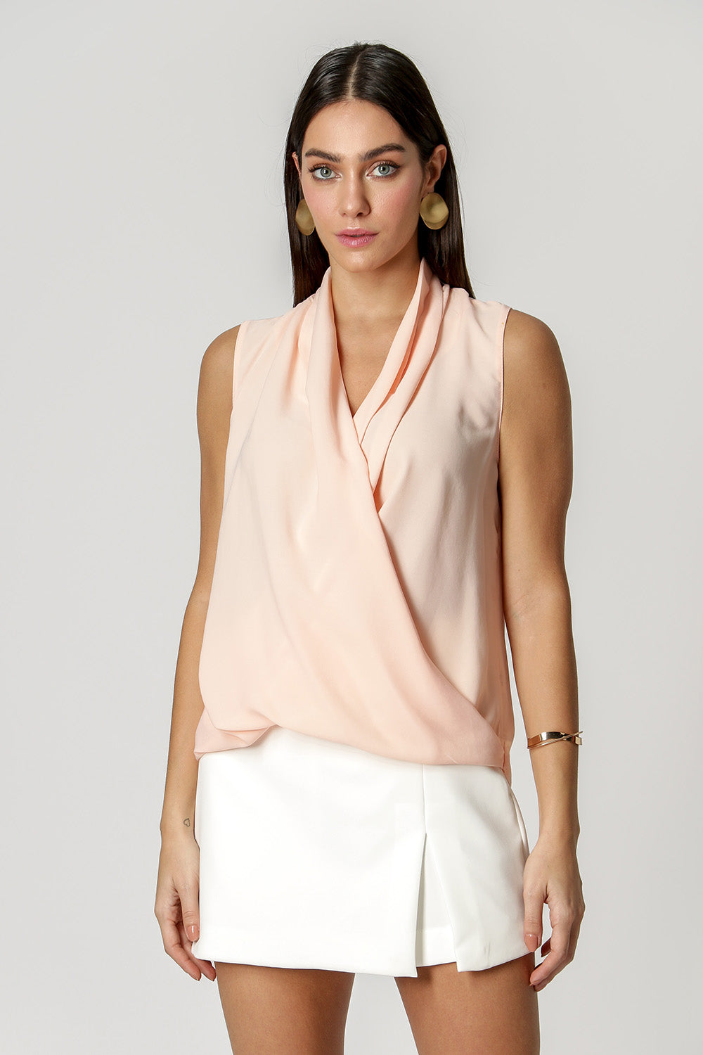 Blusa confeccionada en crepe fluido, con diseño tipo pañuelo, detalle en el hombro con pliegues que realza el escote, una pieza atemporal y clásica para diferentes ocasiones.