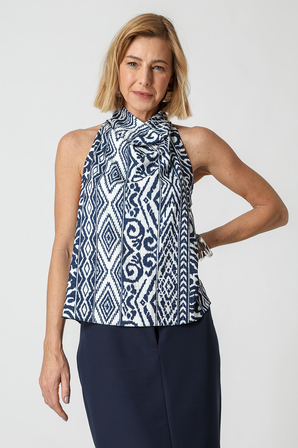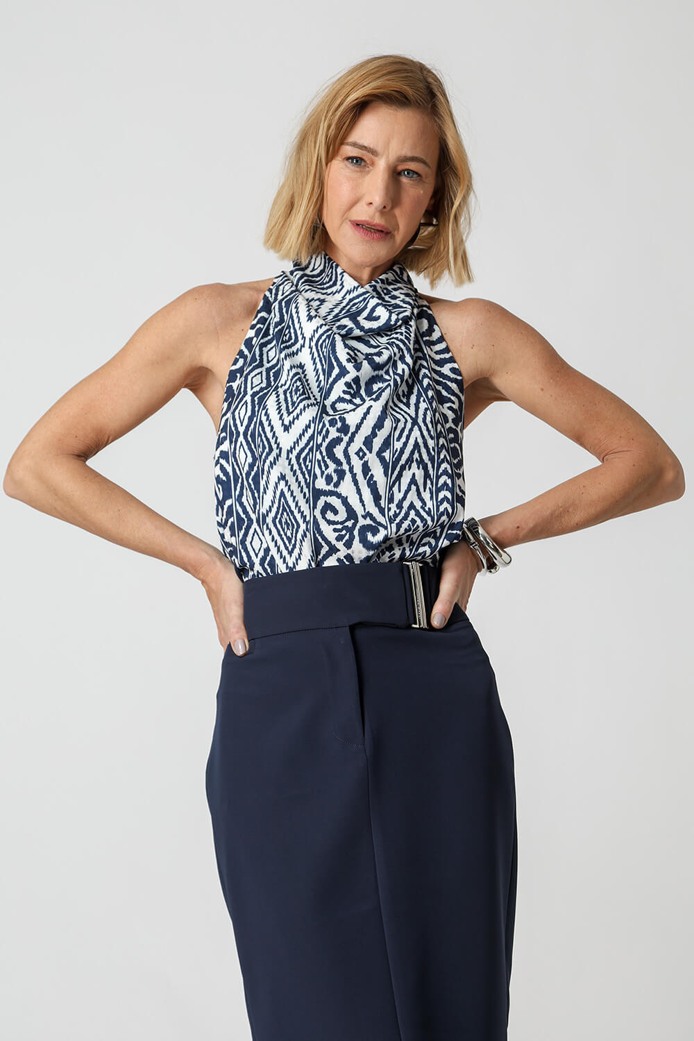 Blusa Cuello Degagé. Una pieza realizada en satén dobby poa. Pieza con información de moda actual y moderna.