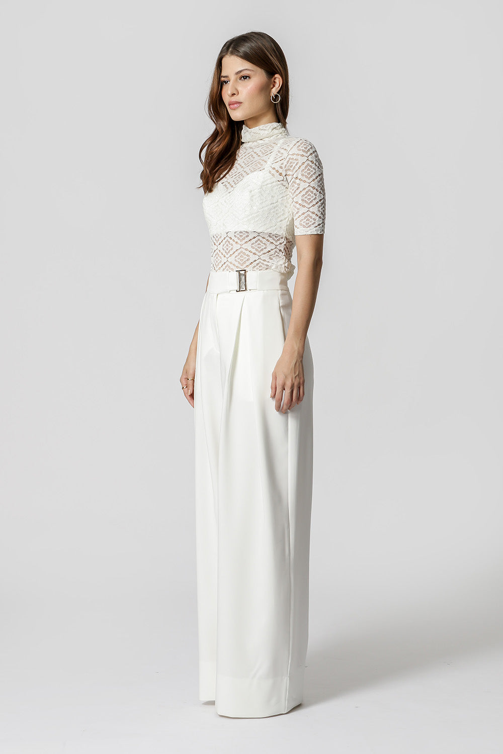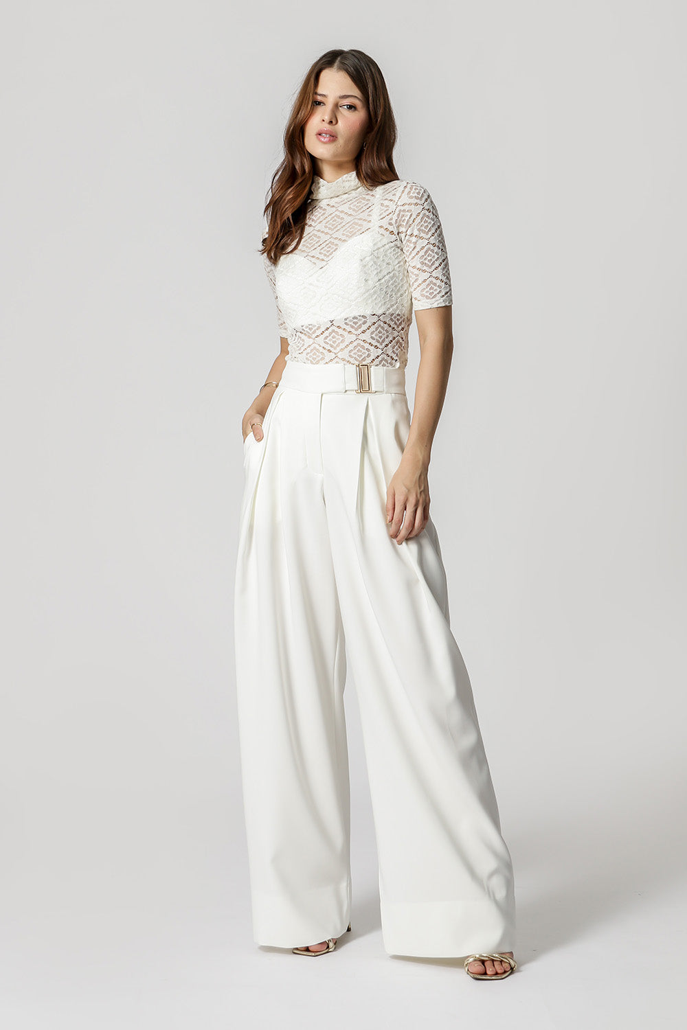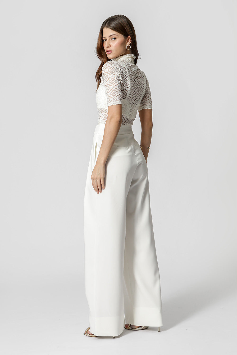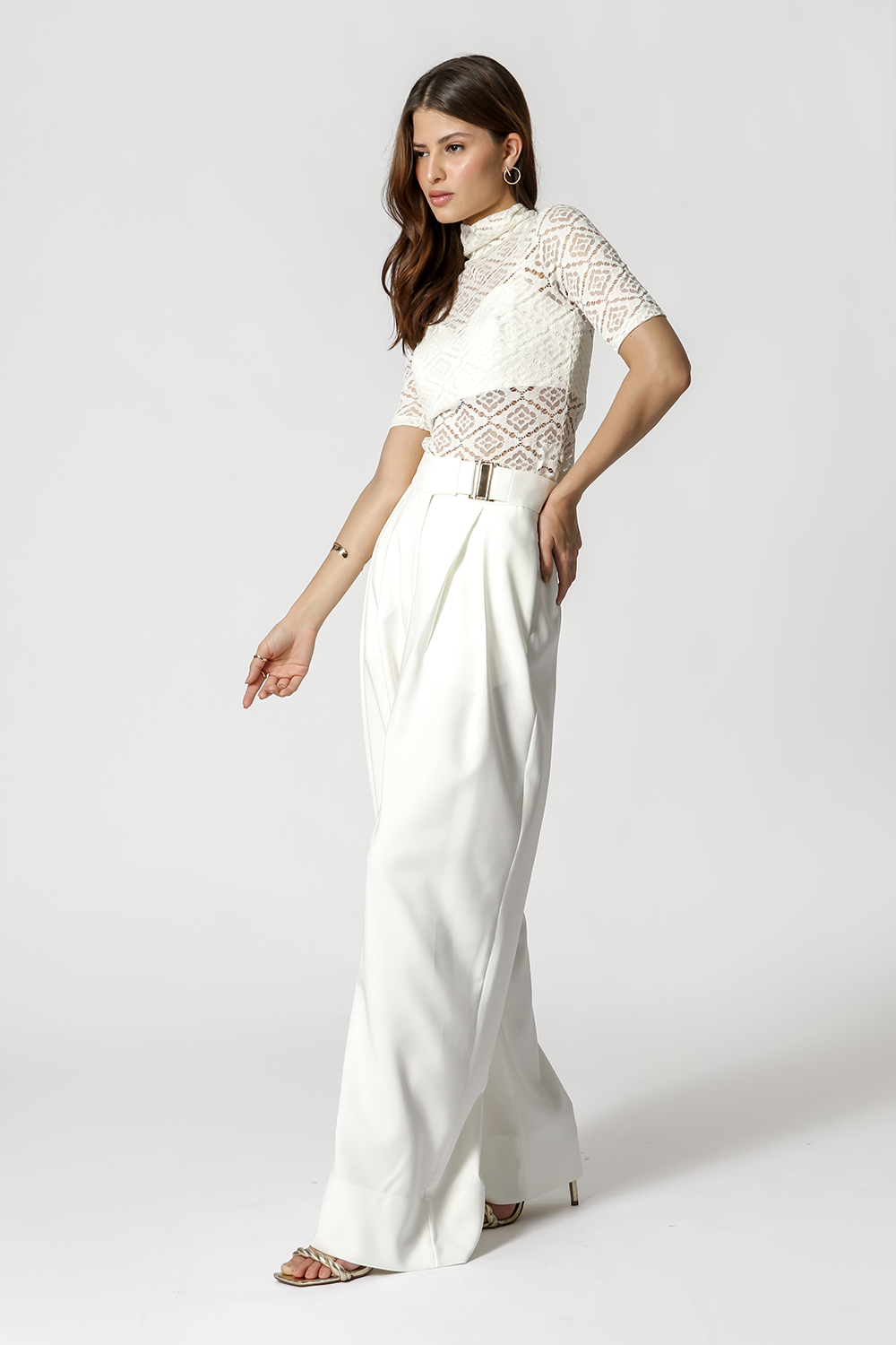 Blusa de cuello fruncido, de corte ajustado al cuerpo, confeccionada en encaje con elastano. Una pieza para modernizar cualquier look.