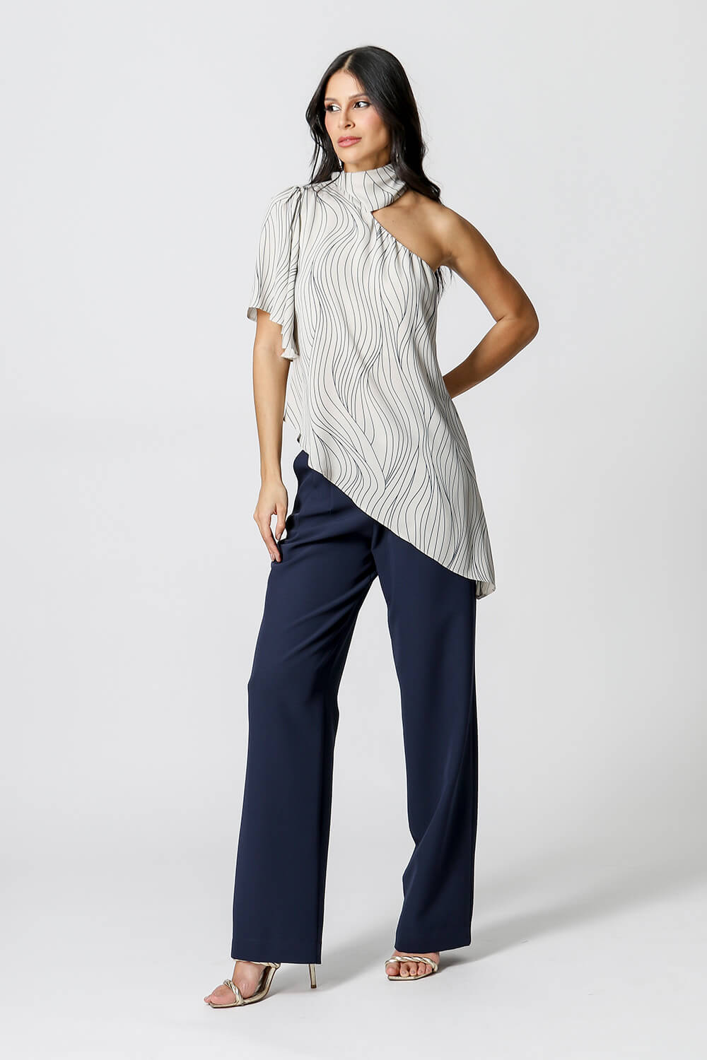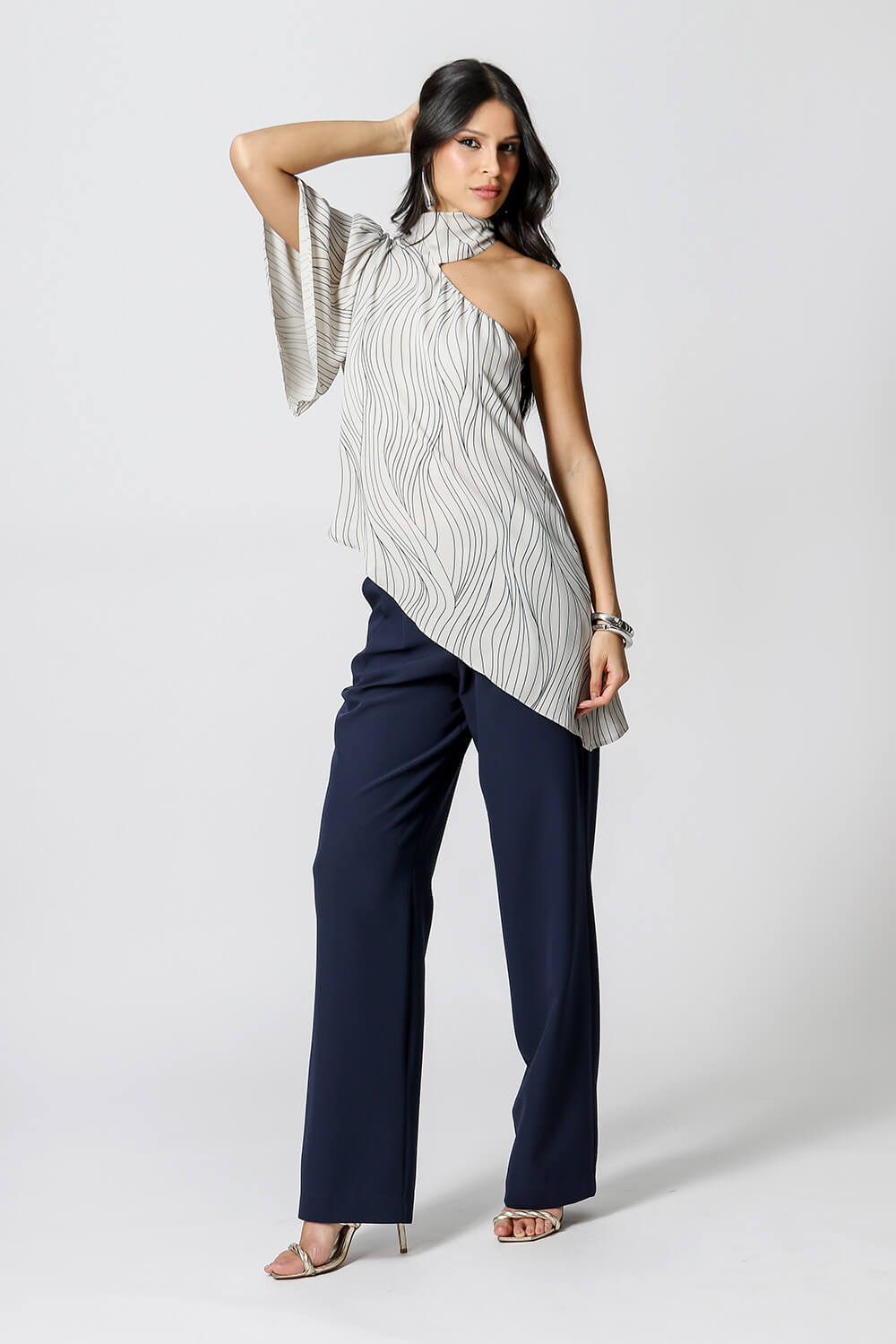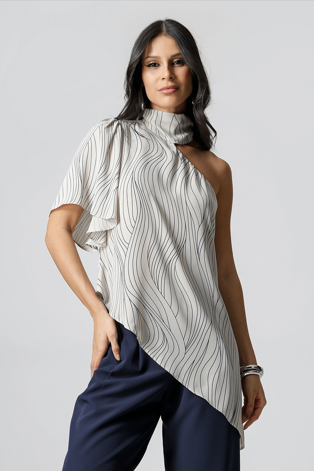 Blusa estampada de um ombro só com assimetria na barra e manga angel. Peça fluída e com muita informação de moda, aposte!