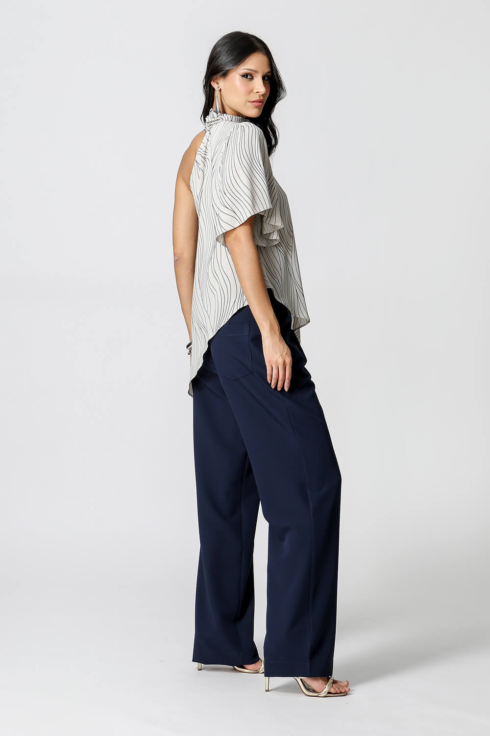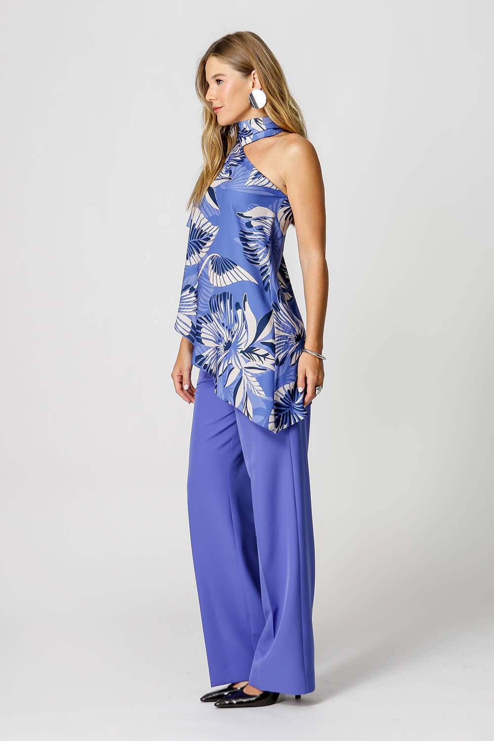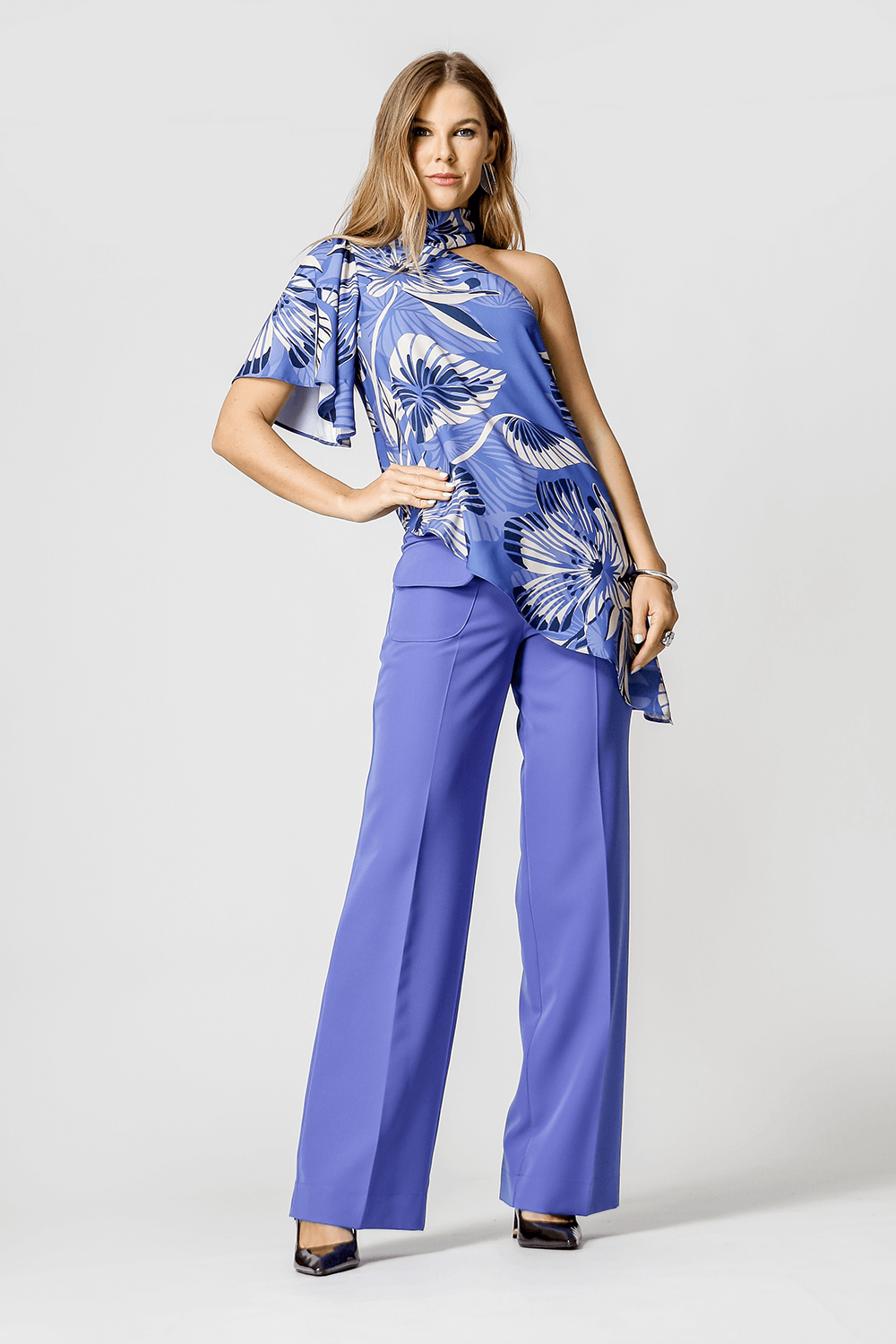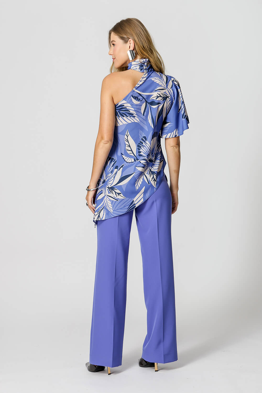Blusa estampada de um ombro só com assimetria na barra e manga angel. Peça fluída e com muita informação de moda, aposte!