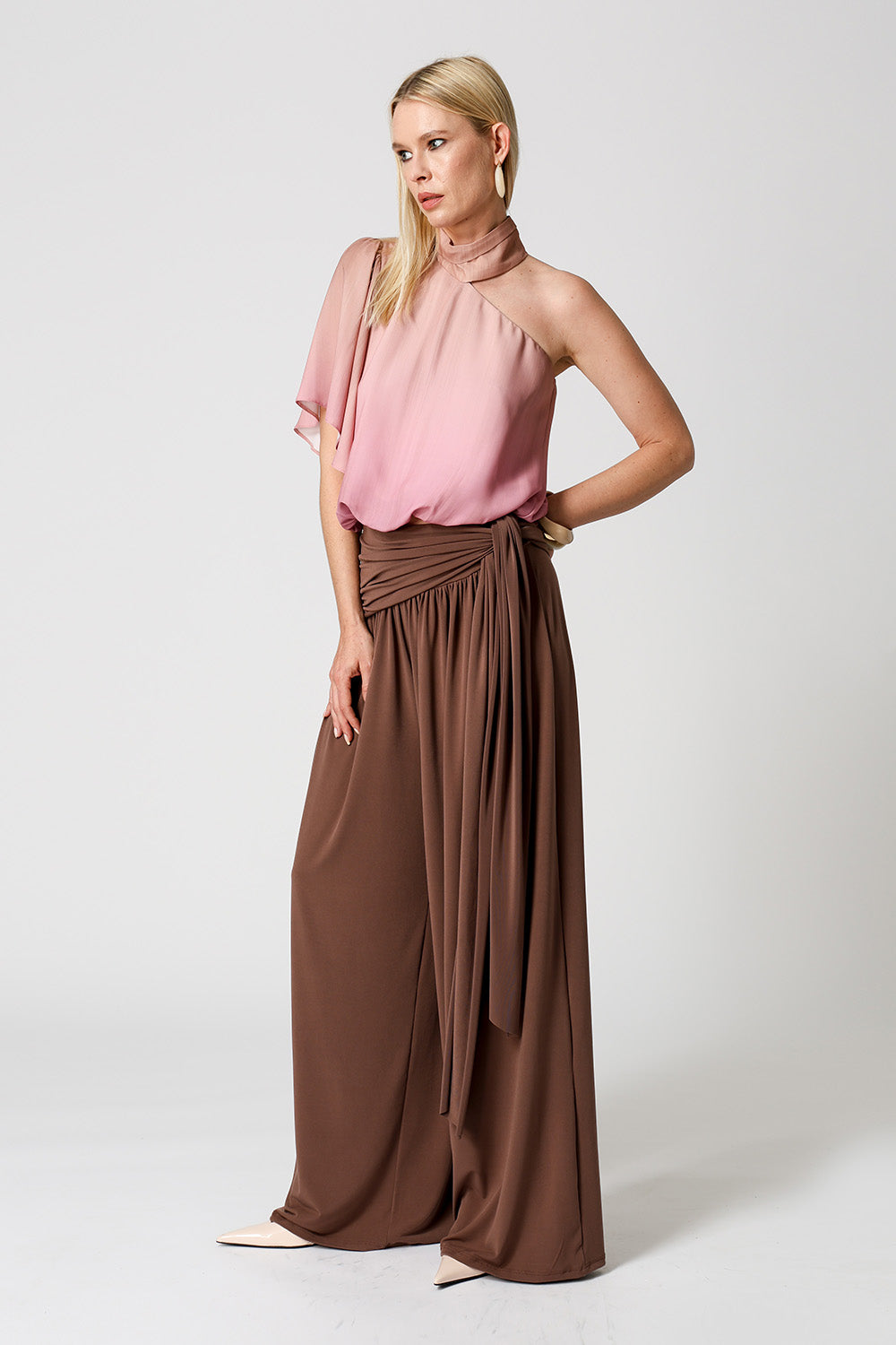 Blusa estampada em crepe fluido com modelagem balonê, gola alta e manga angel em um ombro só. Uma peça leve e sofisticada, que une estilo e movimento para compor looks modernos e elegantes.