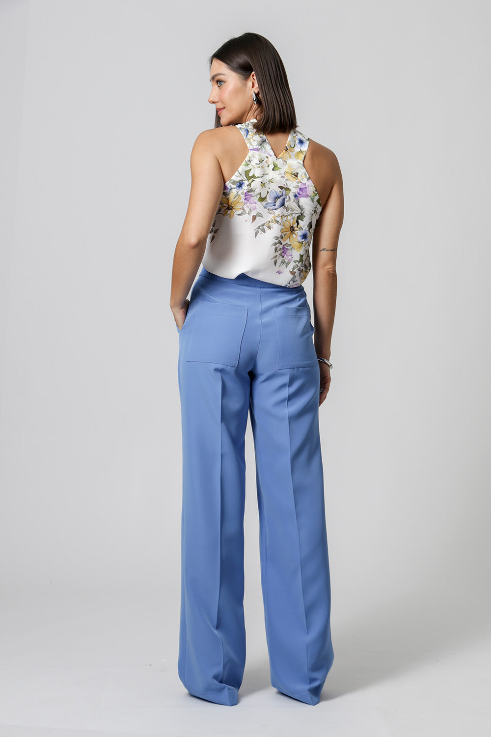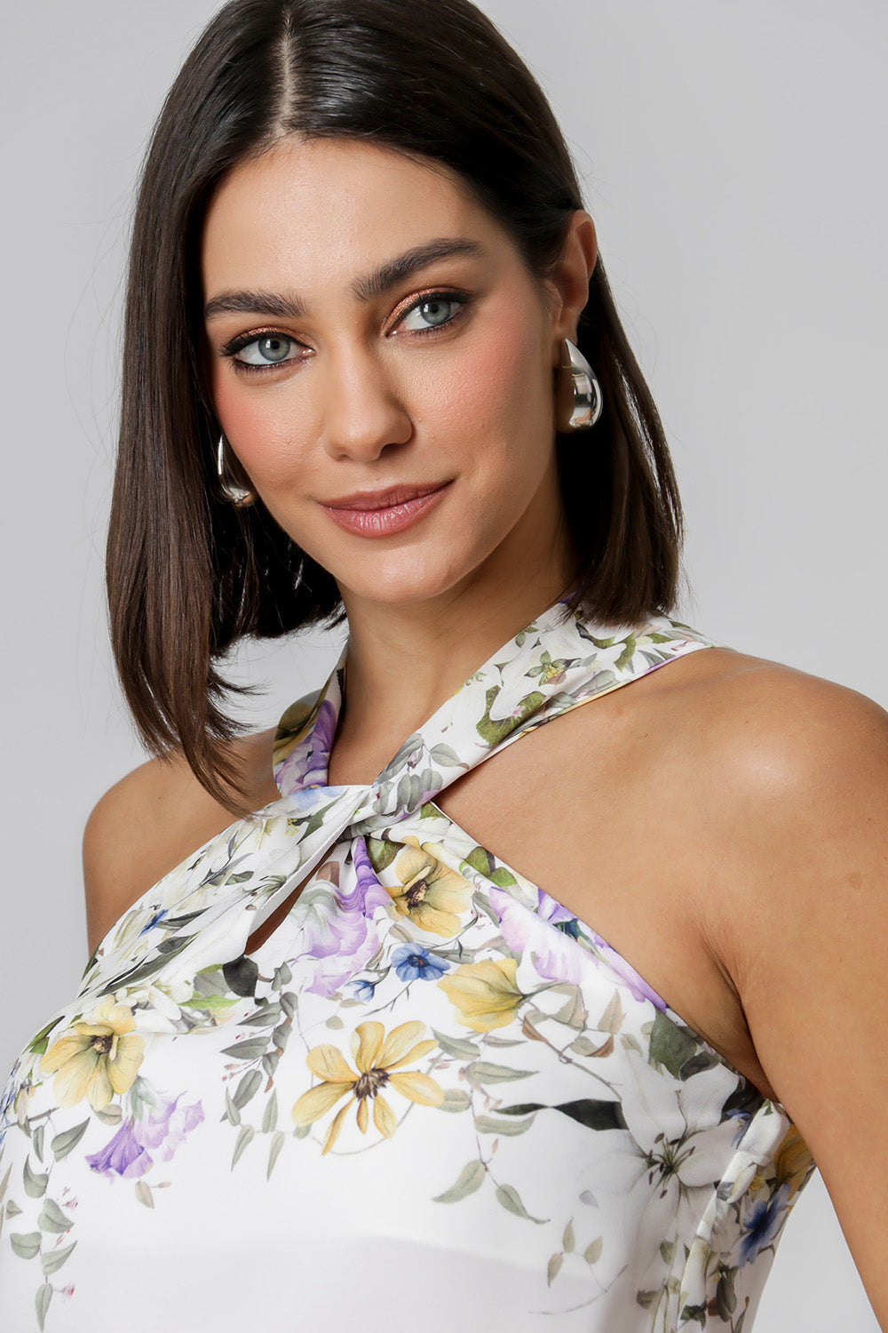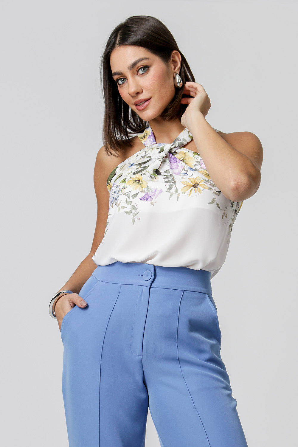 Blusa estampada com cava americana e transpasse no decote. Confeccionada em crepe fluído. Peça essencial para o frescor do verão!
