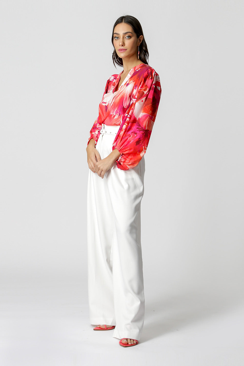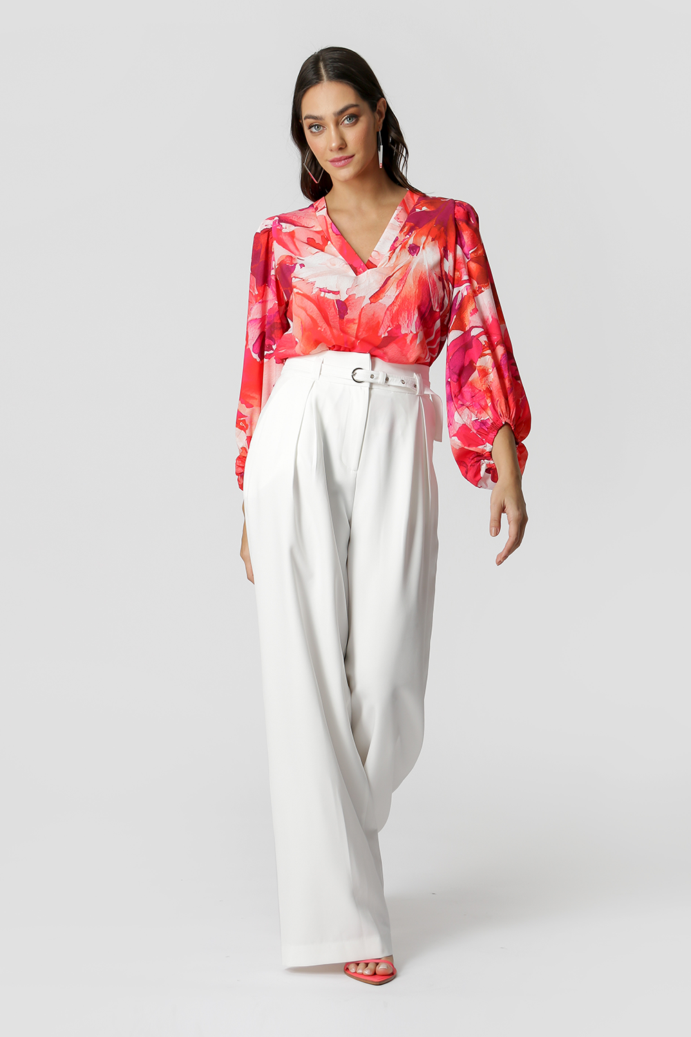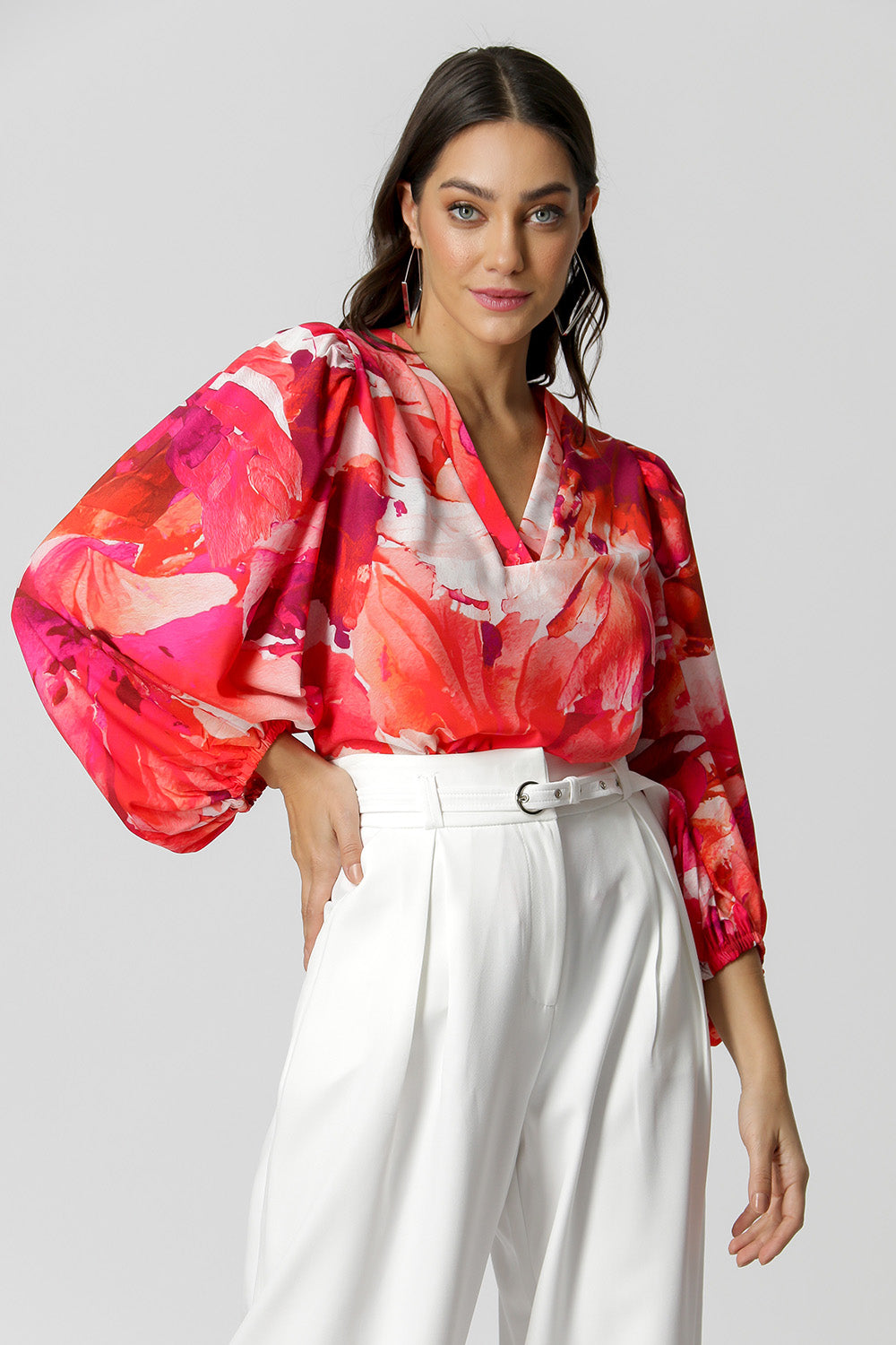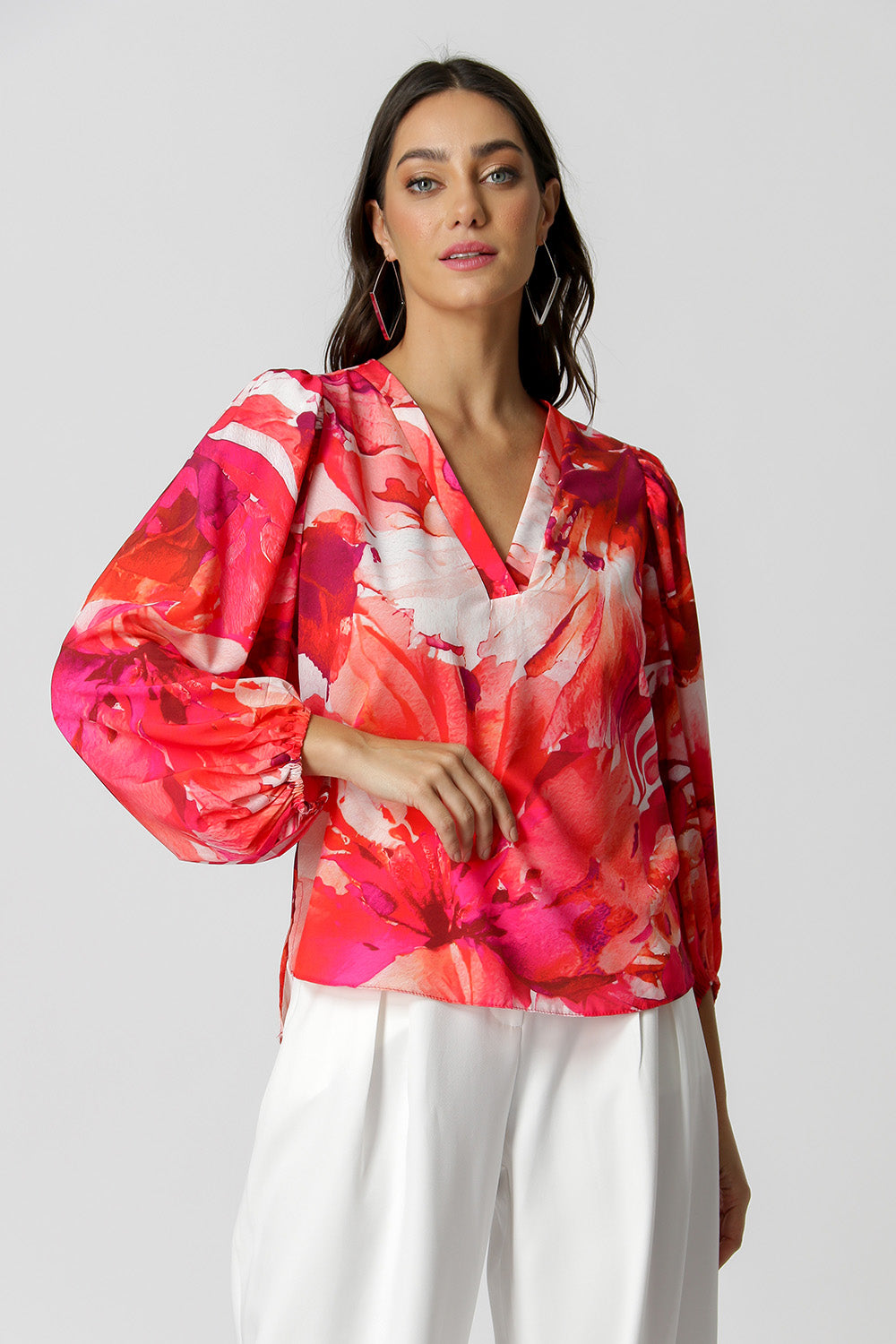 Blusa estampada, com decote V e com manga de punho diferenciada, confeccionada com um tecido plano fluído, leve com toque macio.