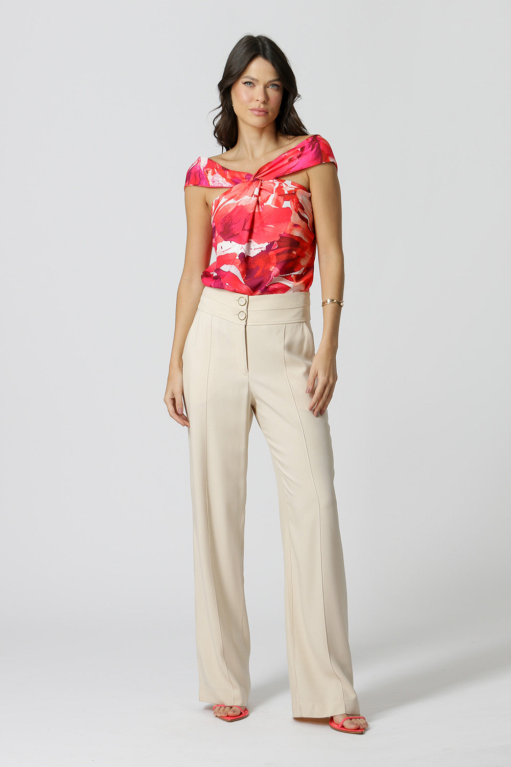 Bolso confeccionado en gabardina ligera estampada, con un escote único que realza el busto y alarga la silueta femenina.
