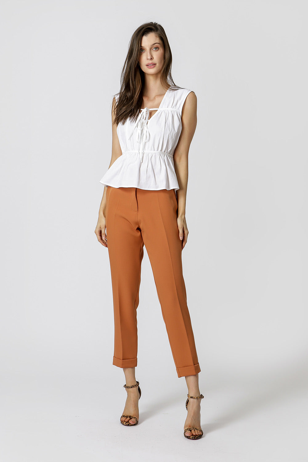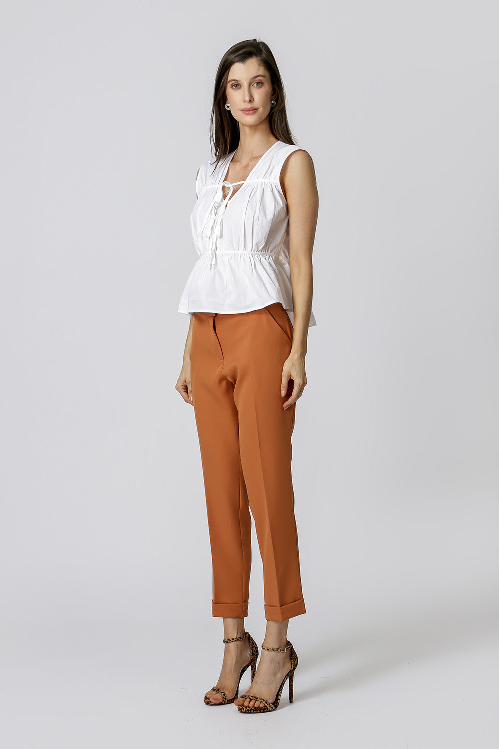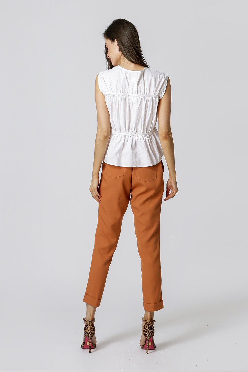 Blusa escote pico con detalles fruncidos fijos. Fabricado en popelina. Pieza moderna que le dará un toque diferente a tu look.